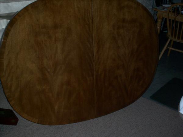 The table is in good condition. The only worn area is the bottom of each leg. The chairs I cannot get a picture of but they are all in tact. The cushions are torn and tattered. There 6 total chairs, 4 reg. and 2 arm chairs.