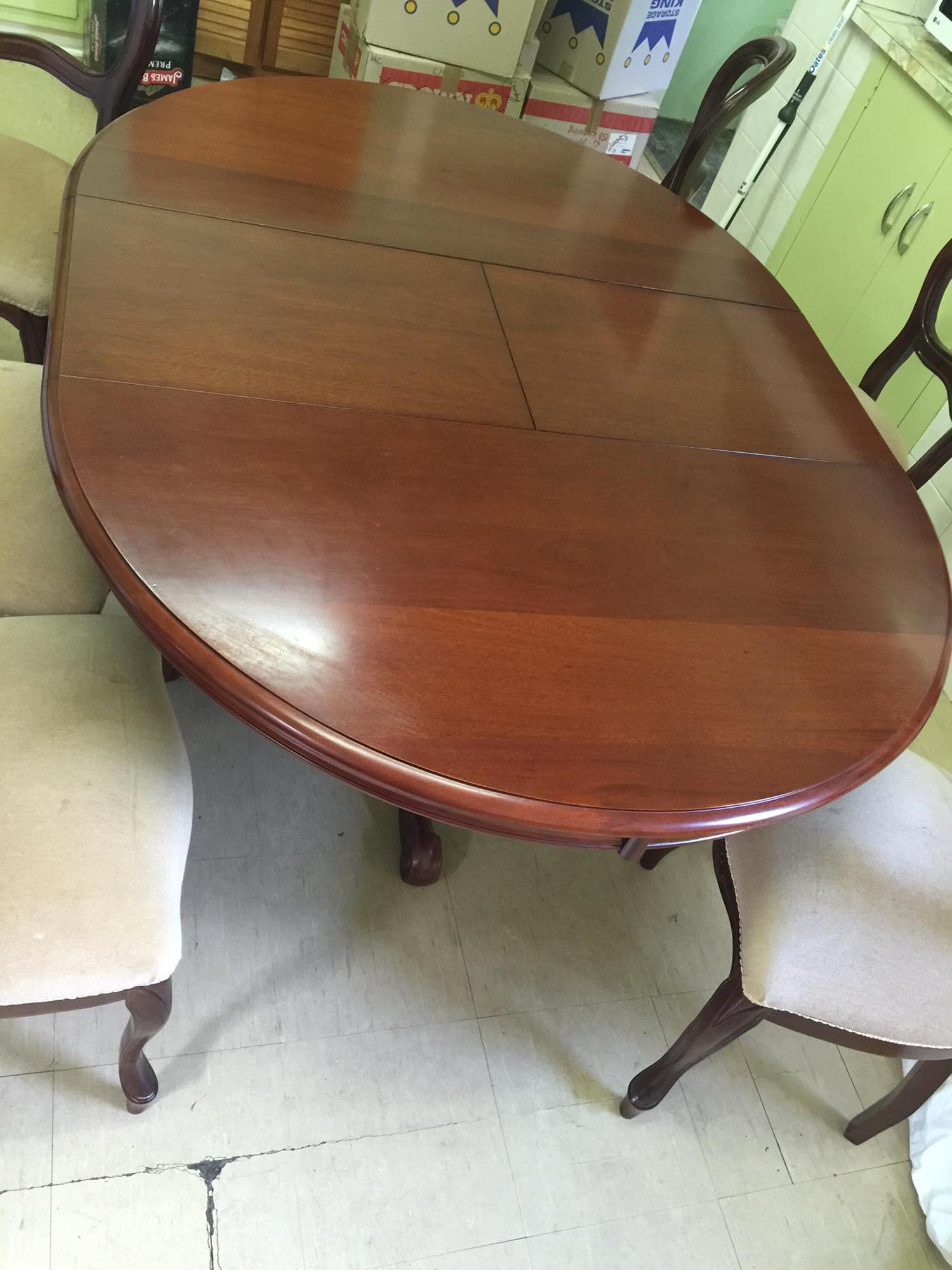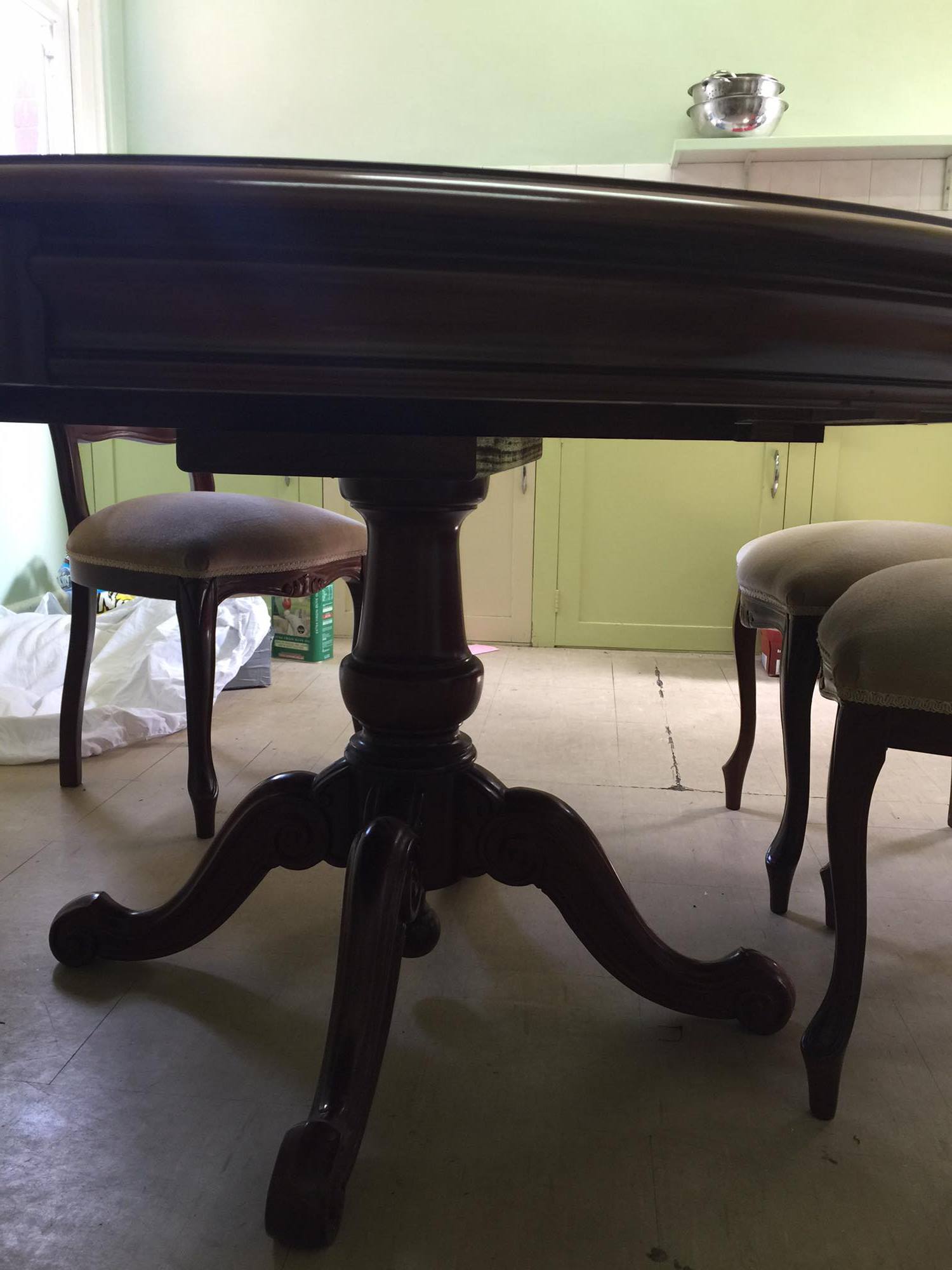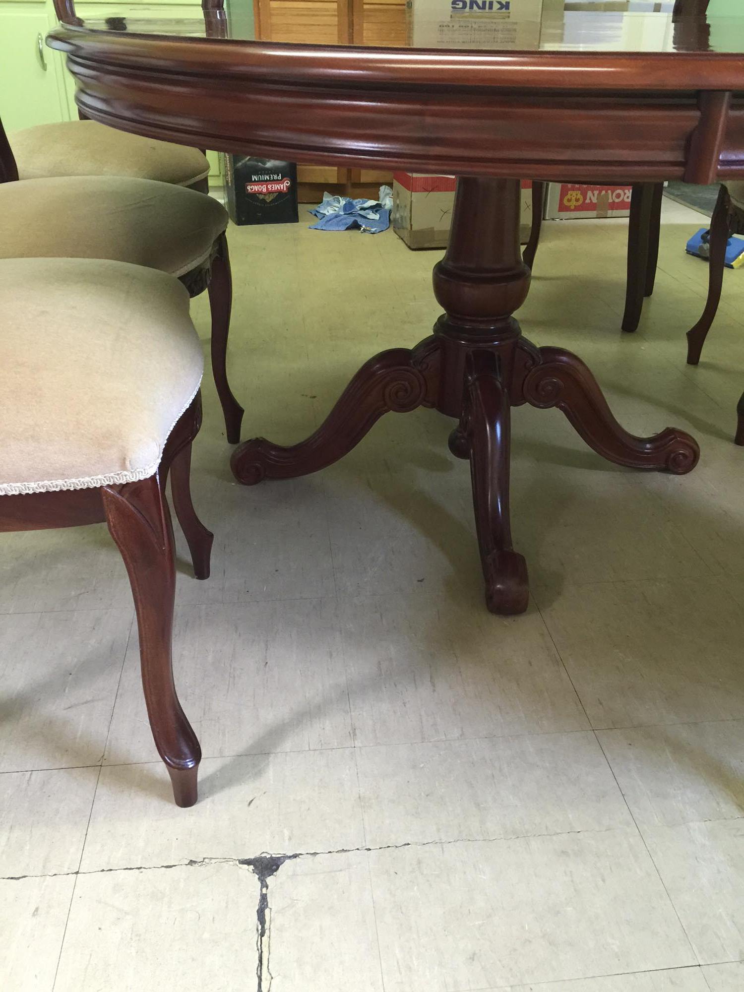 I inherited this dining table and 6 chair set from my great grandparents. I am not sure how old it is exactly but it is a beautiful piece.