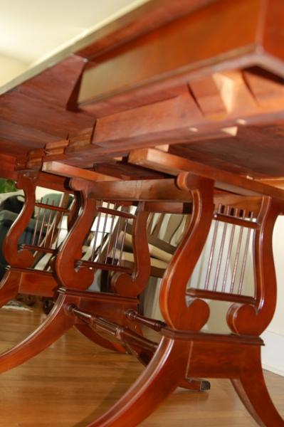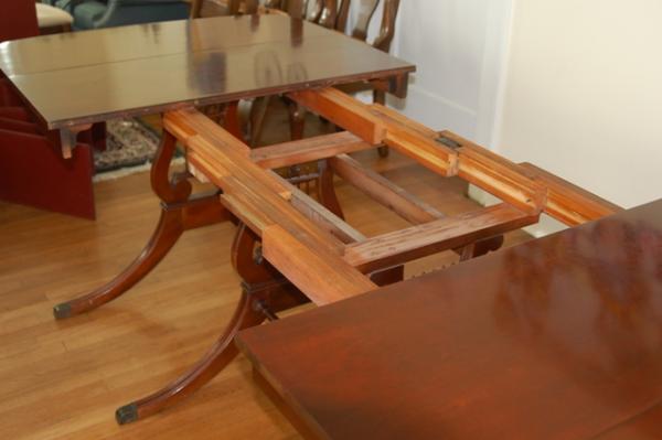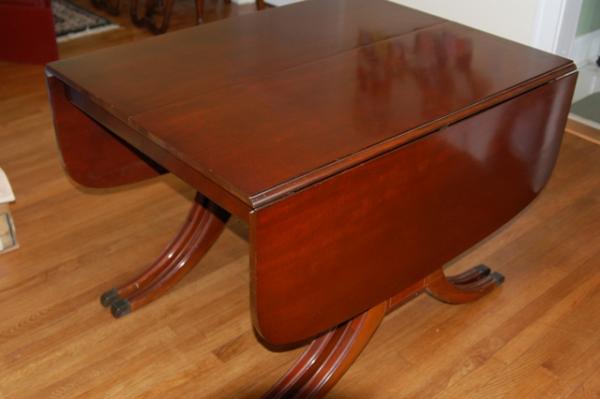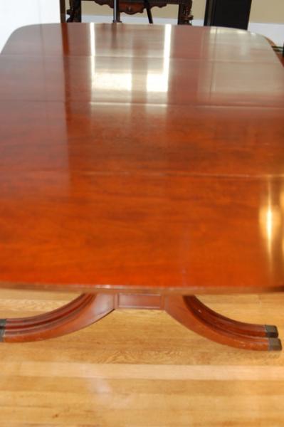 I believe this to be a Duncan Phyfe Table of the late 40's or early 50's. It was my grandmothers. She purchased it new. It is in great condition. There are a few small scratches around the legs and a couple above. It has a very light blemish in the center from where a place setting once sat. All in all a very beautiful piece of craftmanship. It would be a great dining table for a large room.