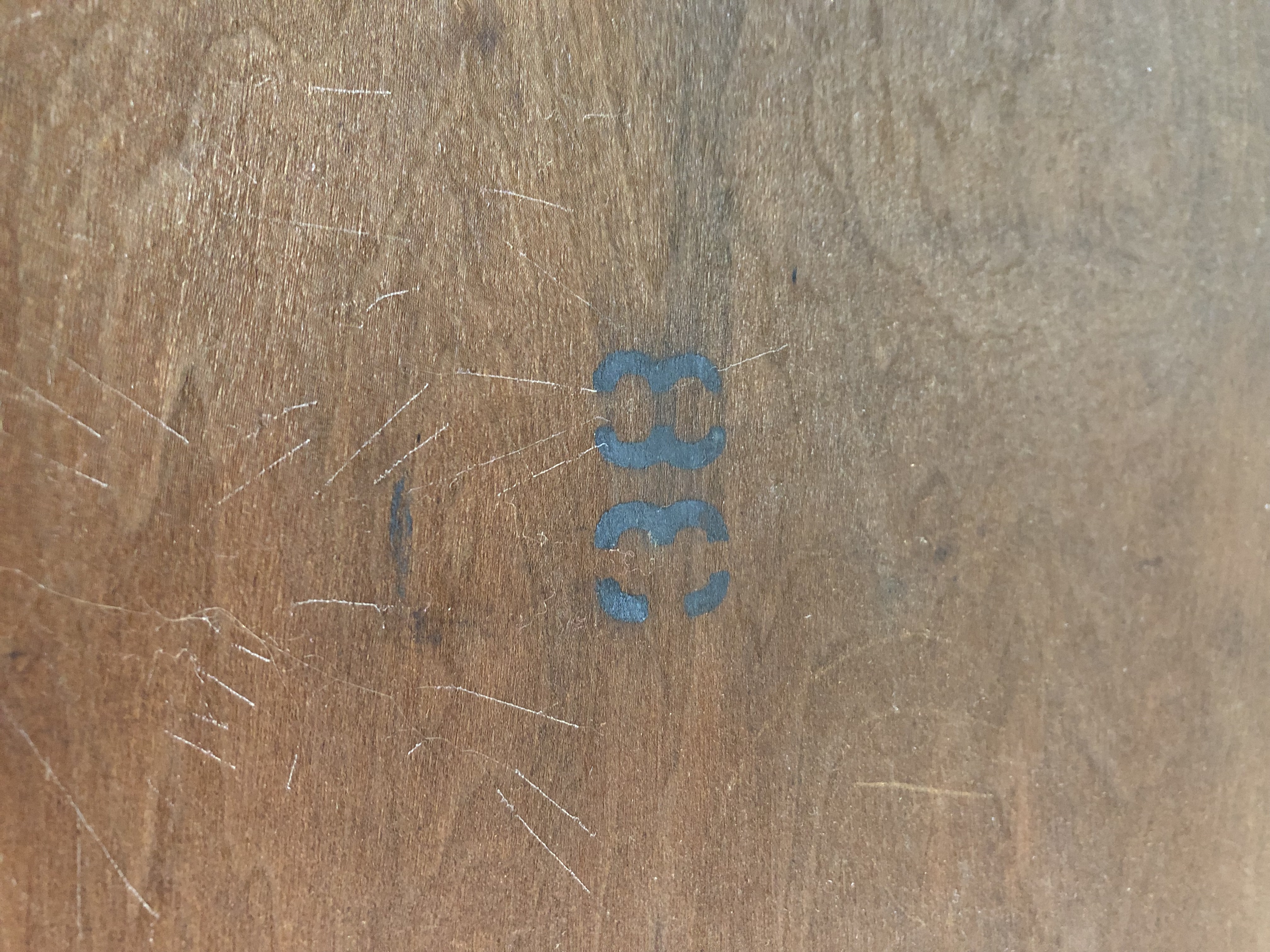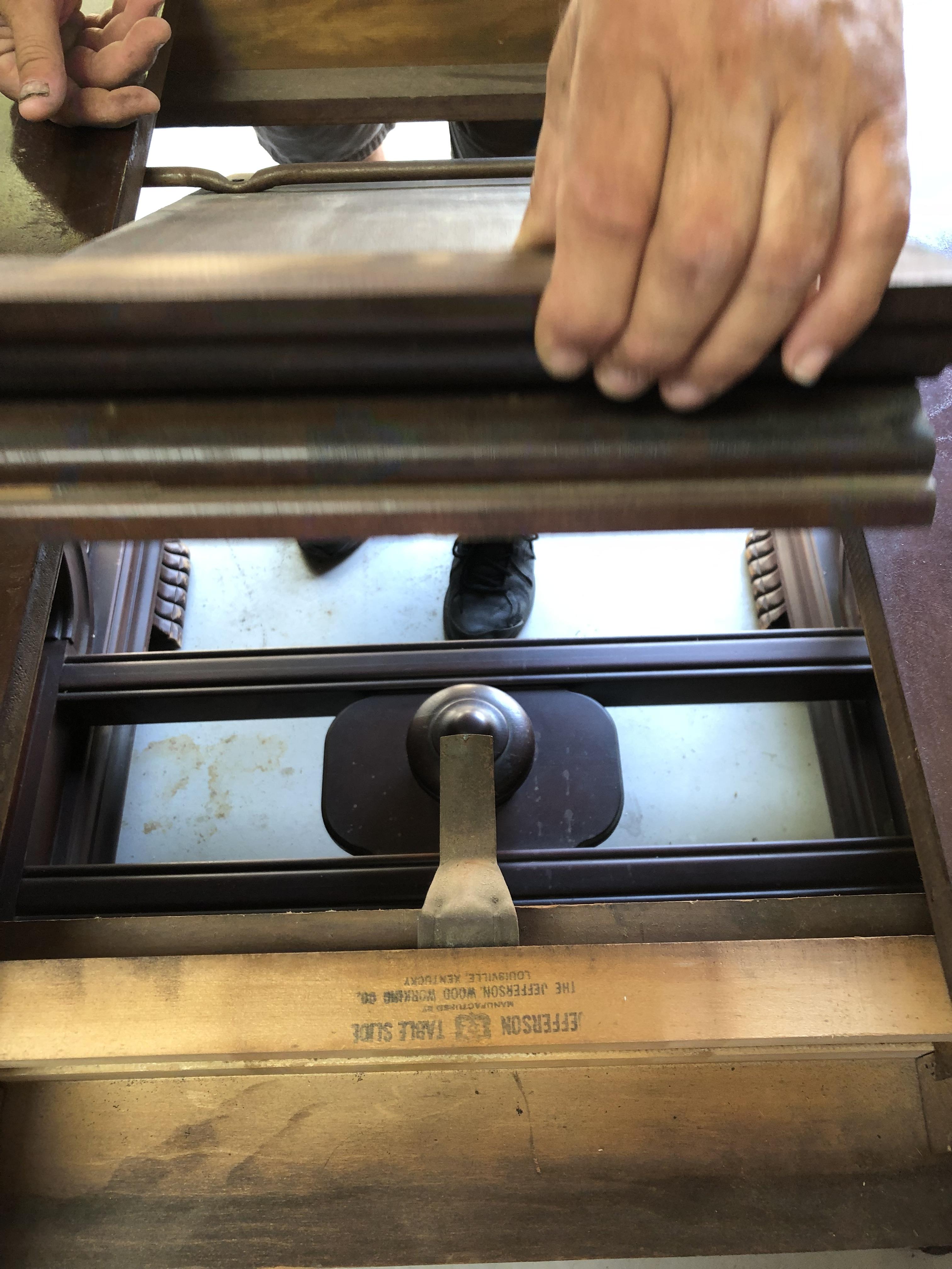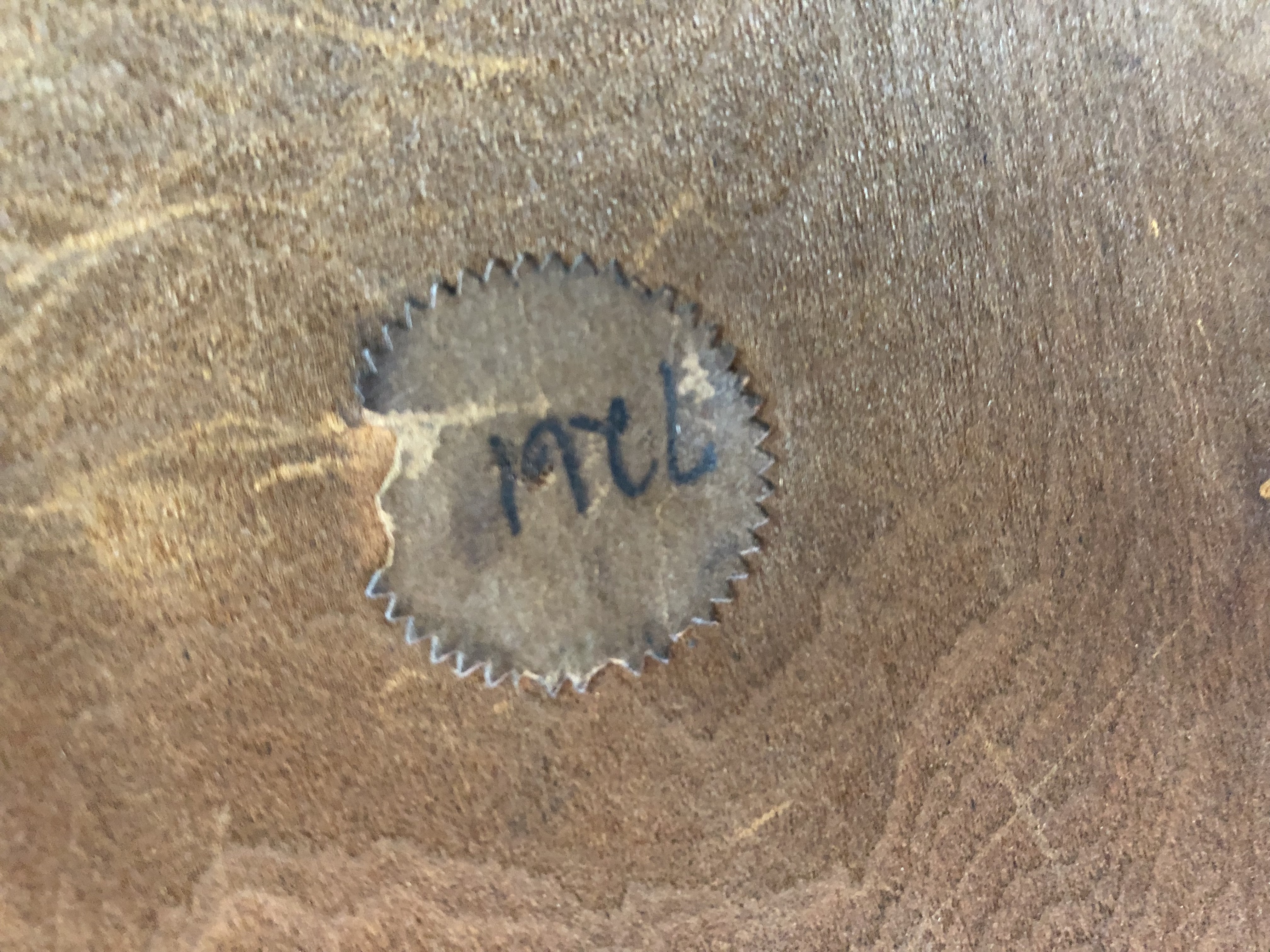 I have a table that has a 1-foot leaf. It has a slide mechanism from Jefferson Woodworking company. It has round corners on the table and has an inlaid diamond pattern on each corner of the table and on the chair backs and on the matching Buffet. The chairs have arched springs and have cloth seat with solid wood backs. I did look up the Jefferson woodworking company and found out they only made the slides. I’m not sure who made the table or what year? I have looked under it and every place to find any markings or numbers and cannot locate any on the table. On the Buffet it has a sticker 7261 and 38 stamp on the wood back. Maybe the markings on the Buffet might help. If anyone has a clue to where they might be hiding on the table, please let me know. Thank you for your help from a newbie.
