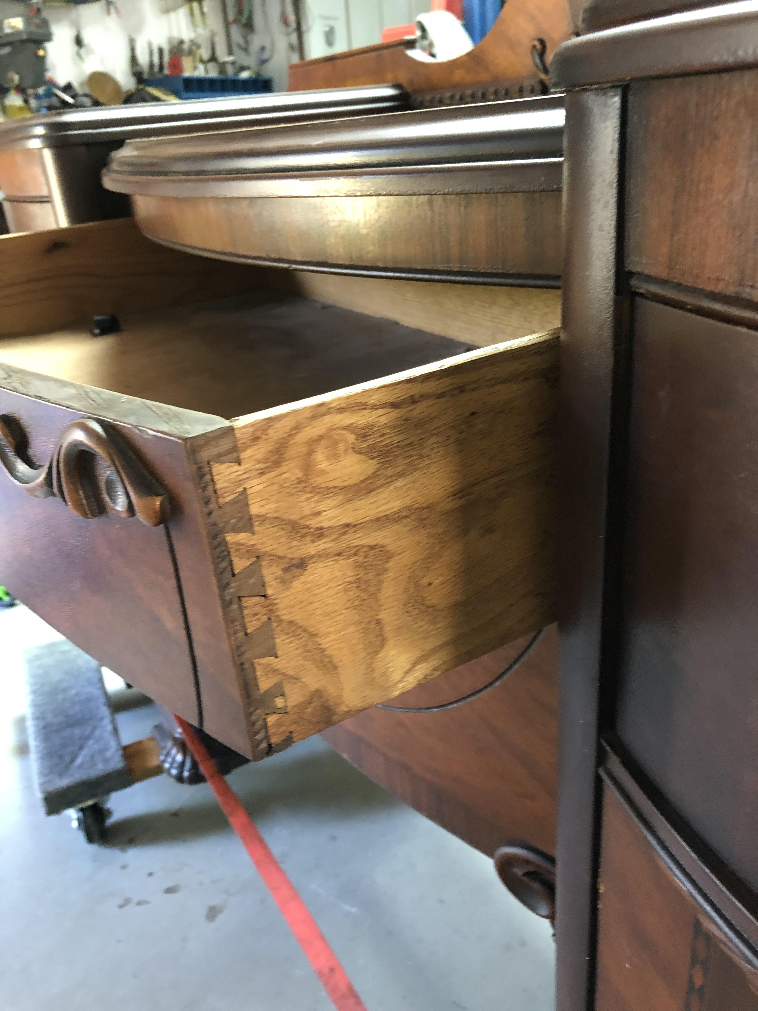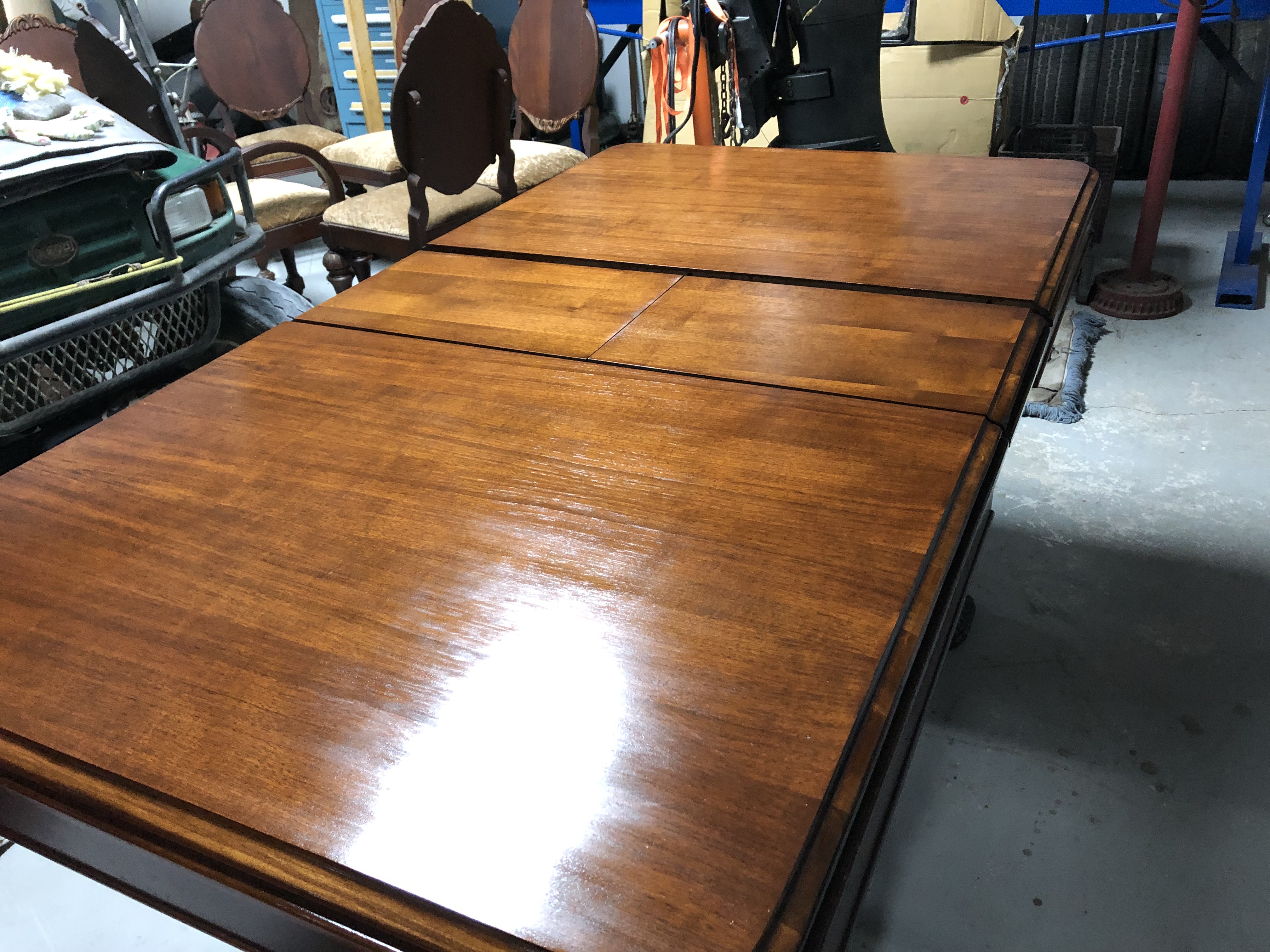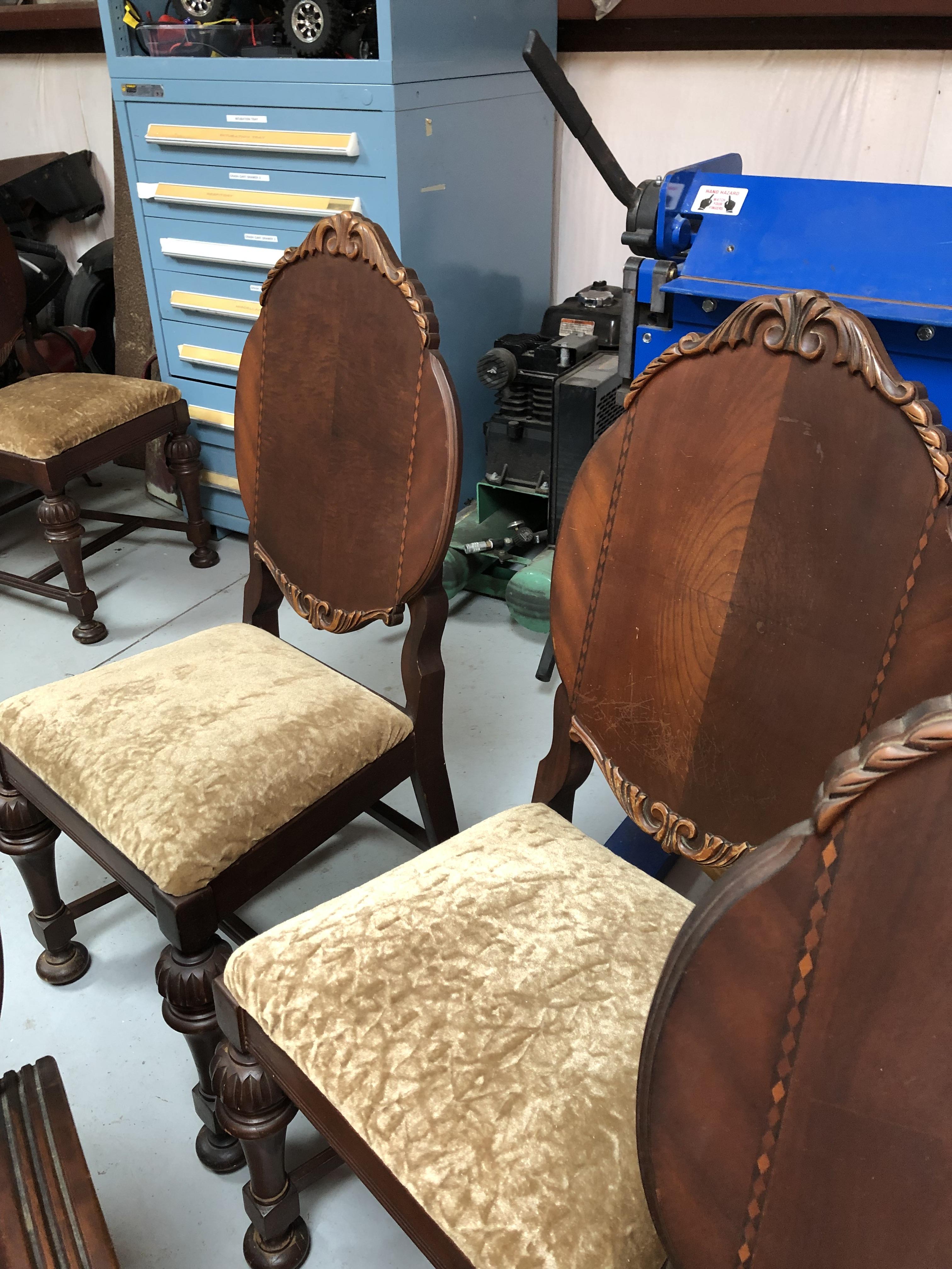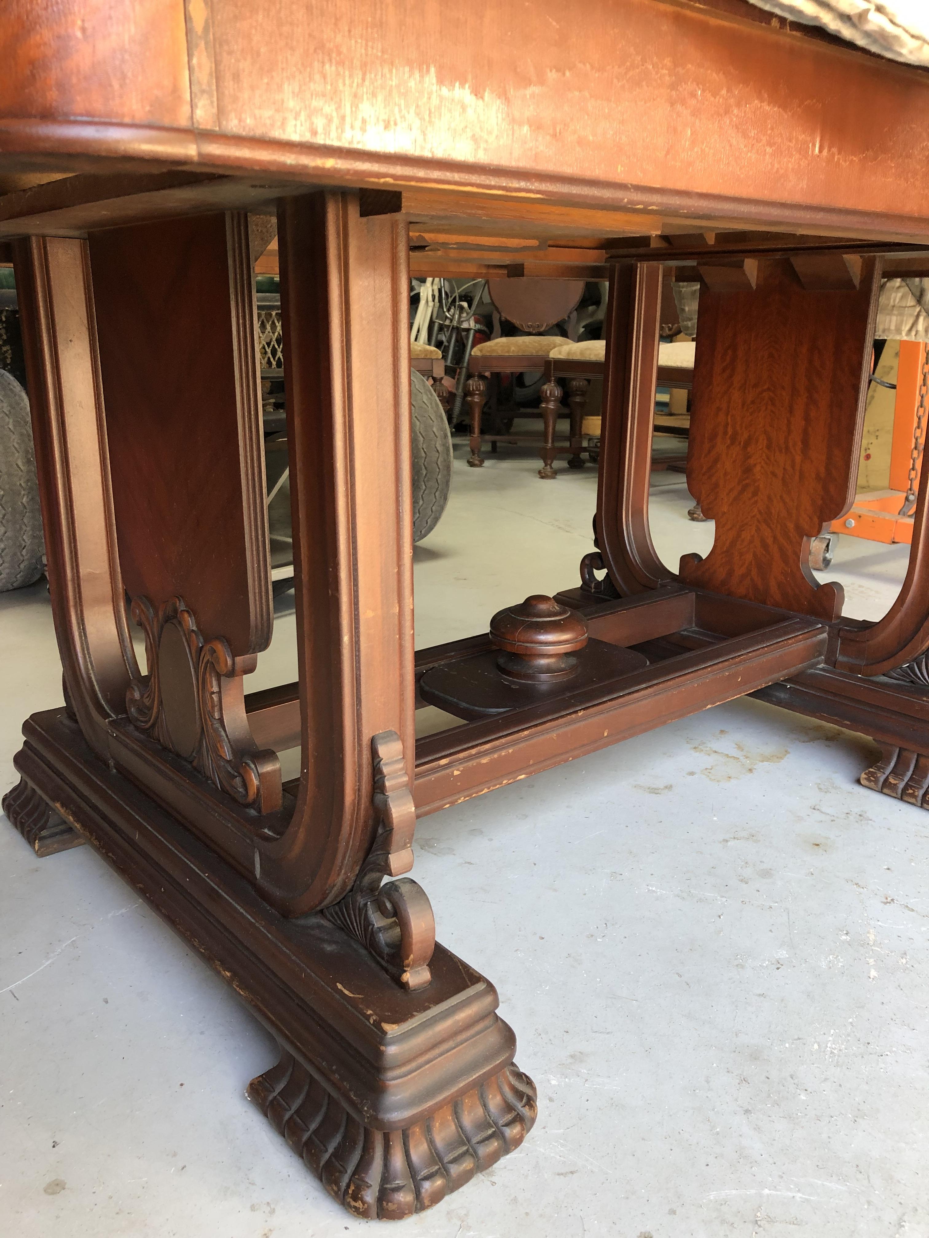 I have a table that has a 1-foot leaf. It has a slide mechanism from Jefferson Woodworking company. It has round corners on the table and has an inlaid diamond pattern on each corner of the table and on the chair backs and on the matching Buffet. The chairs have arched springs and have cloth seat with solid wood backs. I did look up the Jefferson woodworking company and found out they only made the slides. I’m not sure who made the table or what year? I have looked under it and every place to find any markings or numbers and cannot locate any on the table. On the Buffet it has a sticker 7261 and 38 stamp on the wood back. Maybe the markings on the Buffet might help. If anyone has a clue to where they might be hiding on the table, please let me know. Thank you for your help from a newbie.