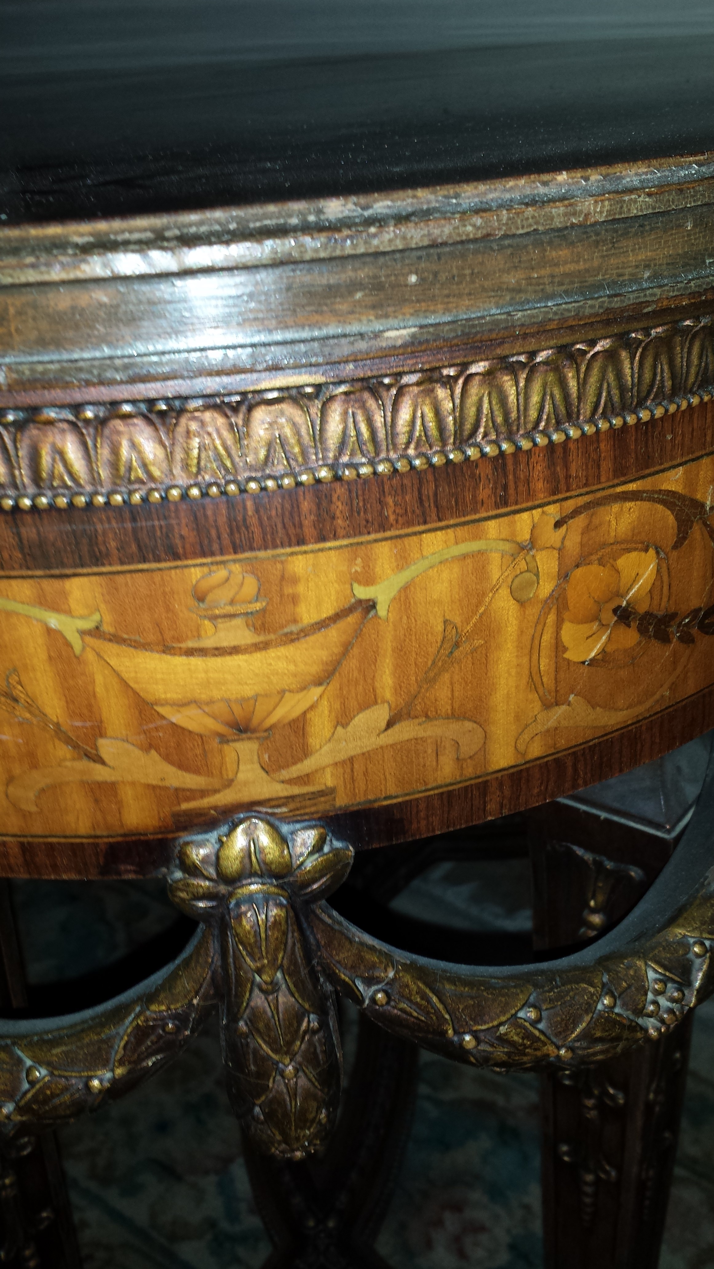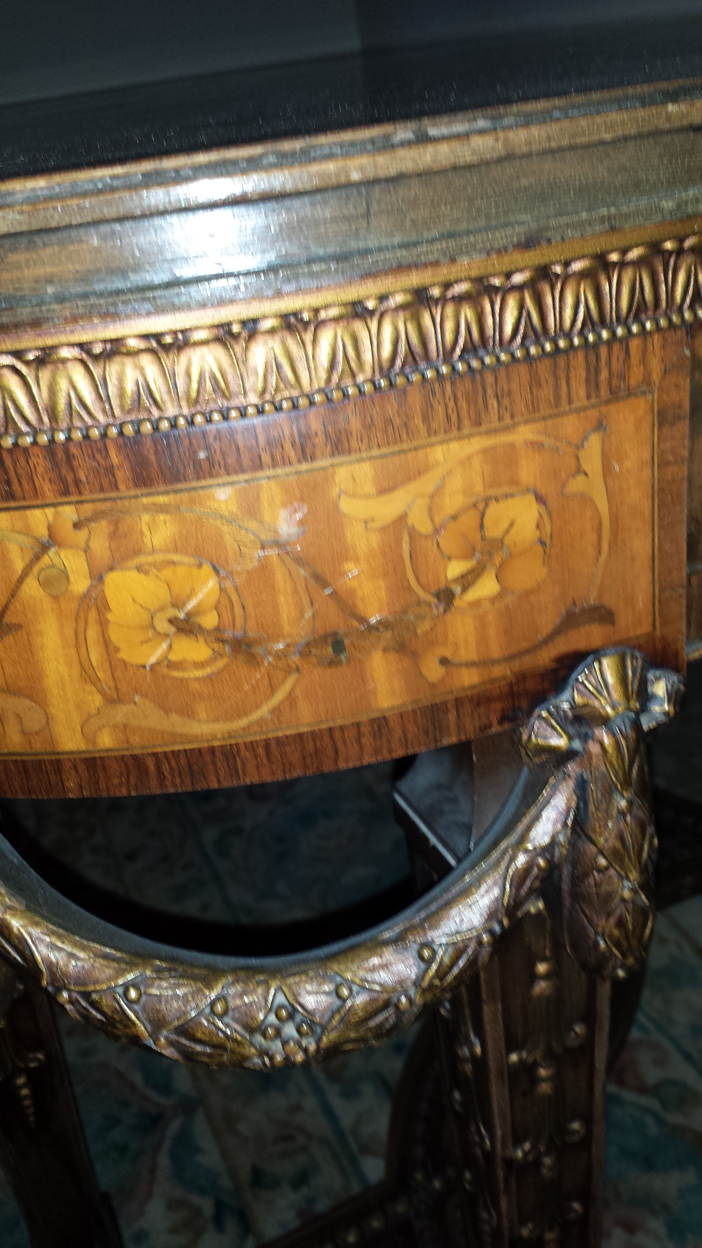 The top and sides all have elaborate inlay work. The legs are very ornate, and have carved "ropes" hanging.