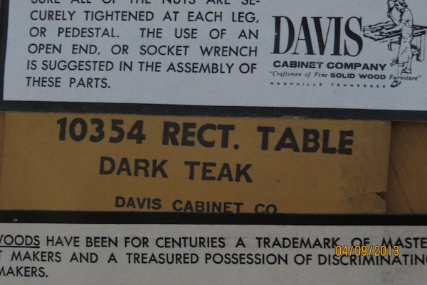 We are trying to figure out a little about a solid, dark teak dining room table set that we are in the process of selling. It was built by the Davis Cabinet Co. Model # 10354 and Serial# 2762273. Any help would be greatly appreciated. Thank you.