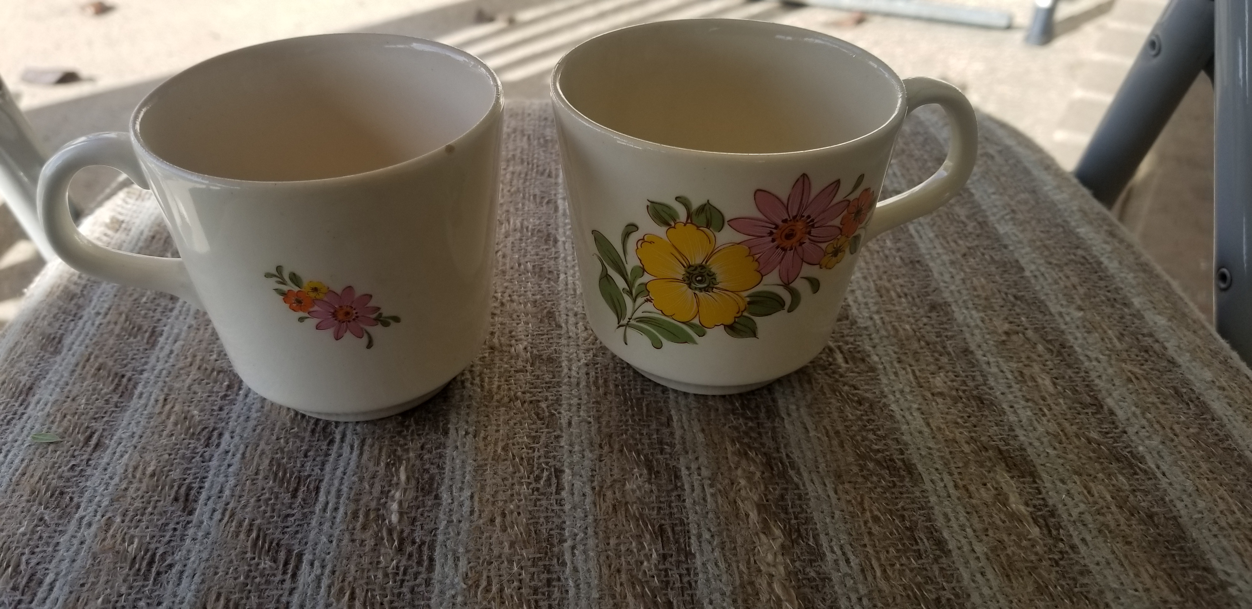 2 cups with flowers the appear to match but back stamp shows onevcup has a red triangle stamp. I think one stamp says made in romania. I dont know anything else
