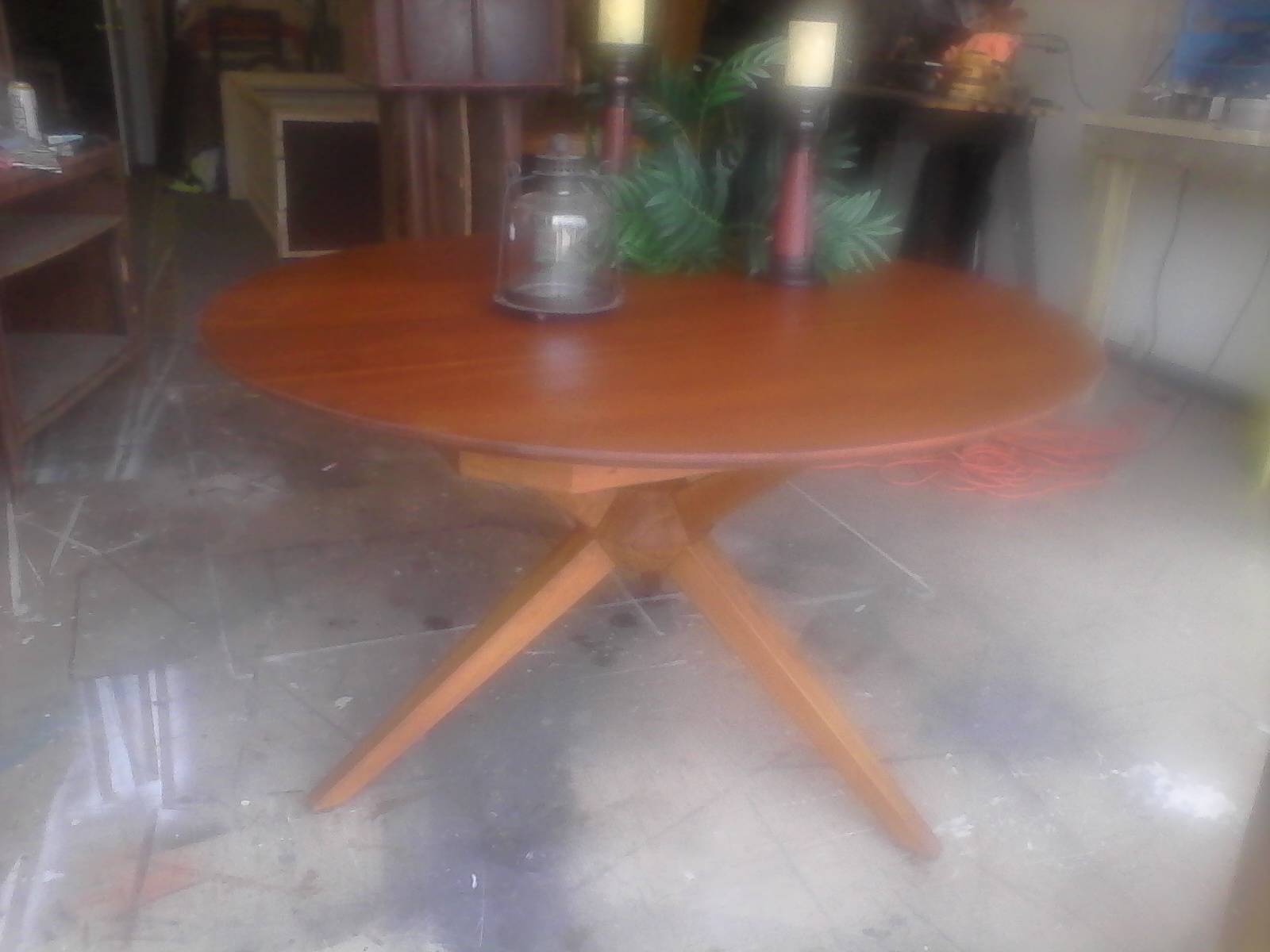 This is two pieces, bottom base shaped like the jacks we played with as kids, maple color but wood looks like teak or maple. metel cast castors on legs.