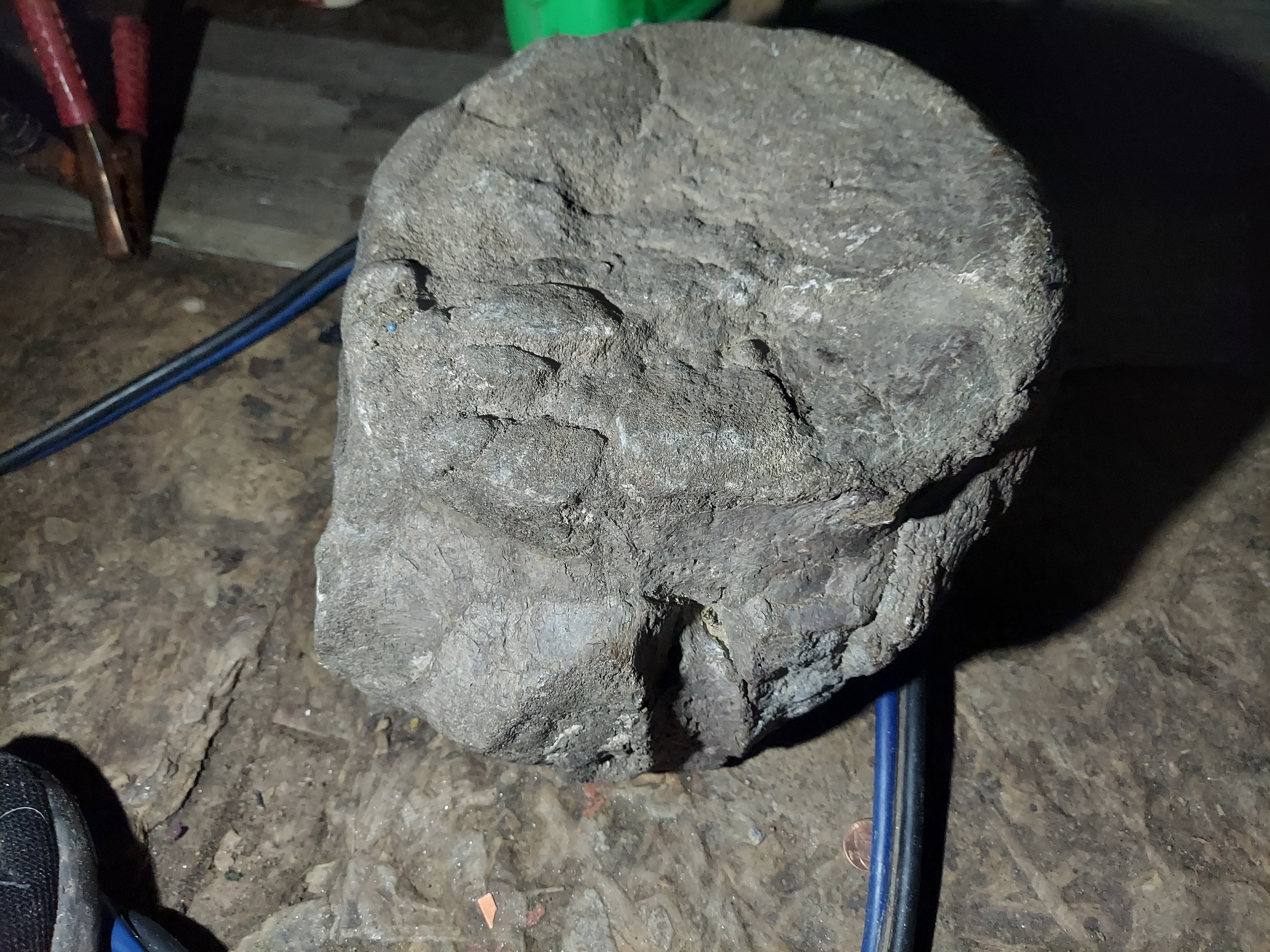 The item in the image appears to be a large, fossilized vertebra, potentially from a dinosaur or prehistoric mammal. The estimated weight is 50 lbs, and the fossil exhibits: