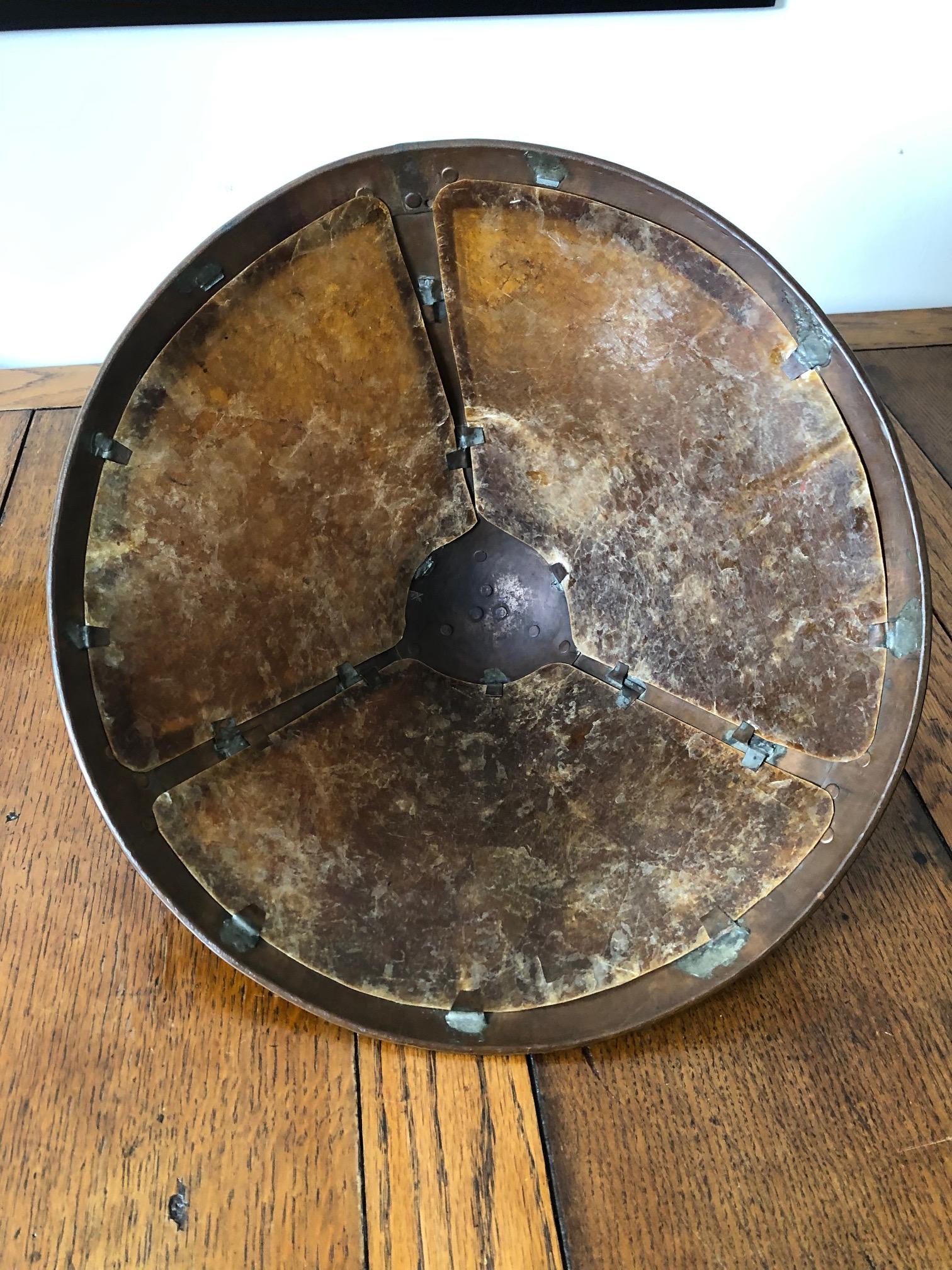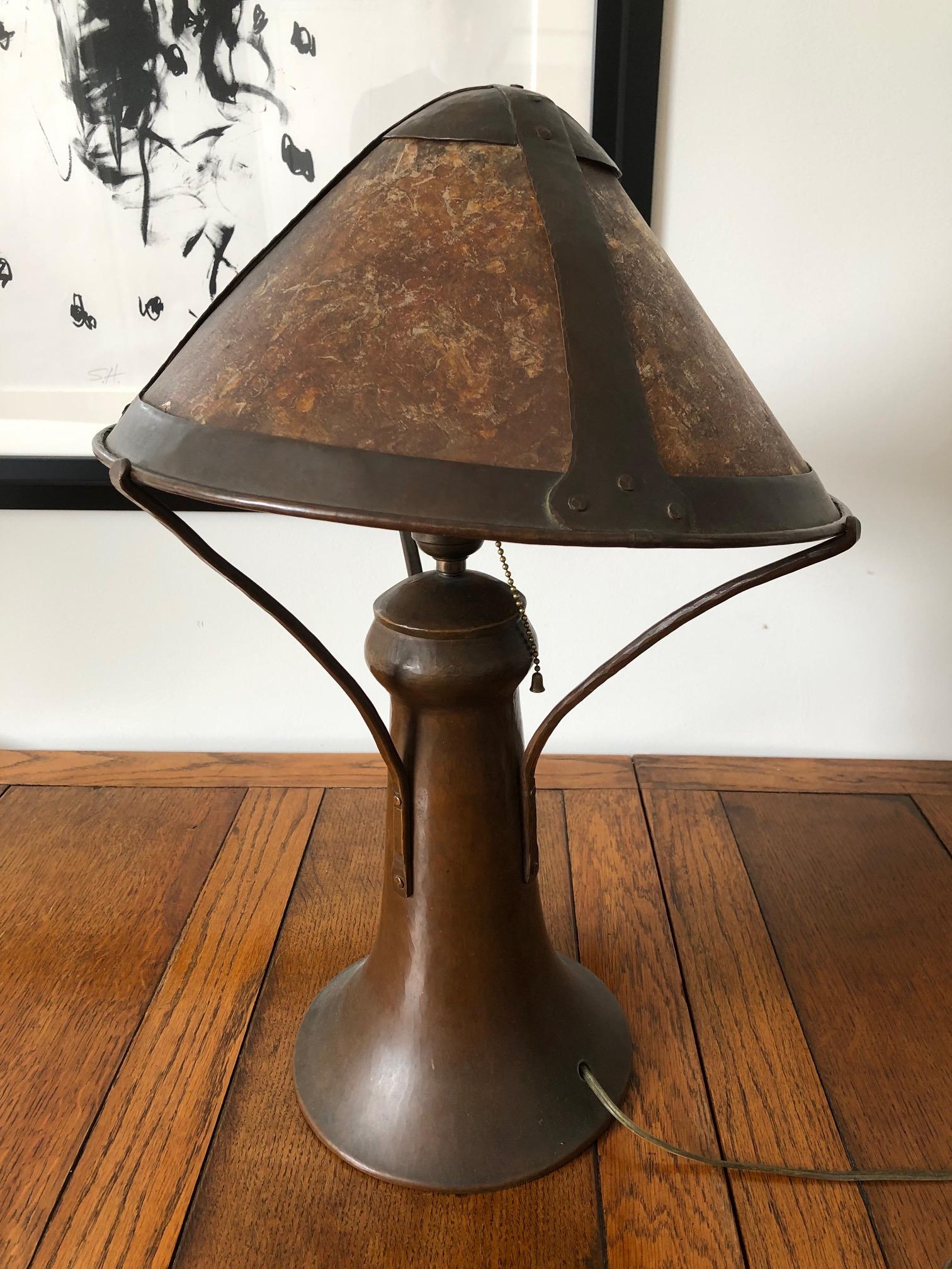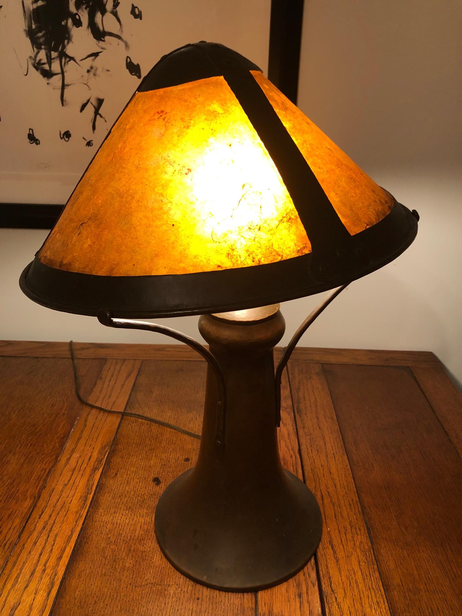 Dirk van Erp lamp, from my brother-in-law's estate. He bought it at an antique store in San Francisco in the 1960s. It does not have the windmill stamp on the bottom, so it might have been made before 1910. Three of the 24 tabs that hold the mica shade in place are missing, but this is only visible on the underside of the shade. Thank you very much for your help.