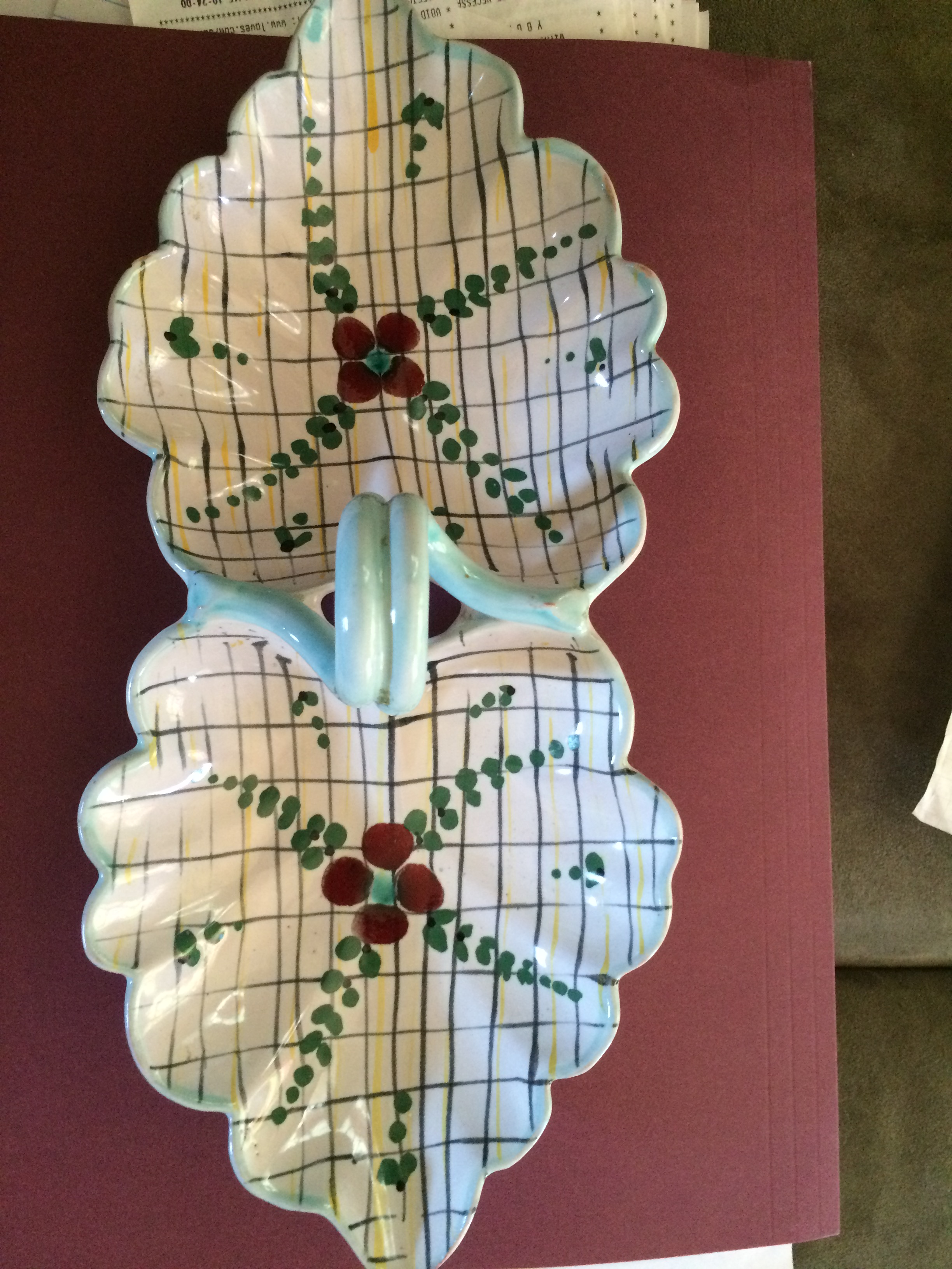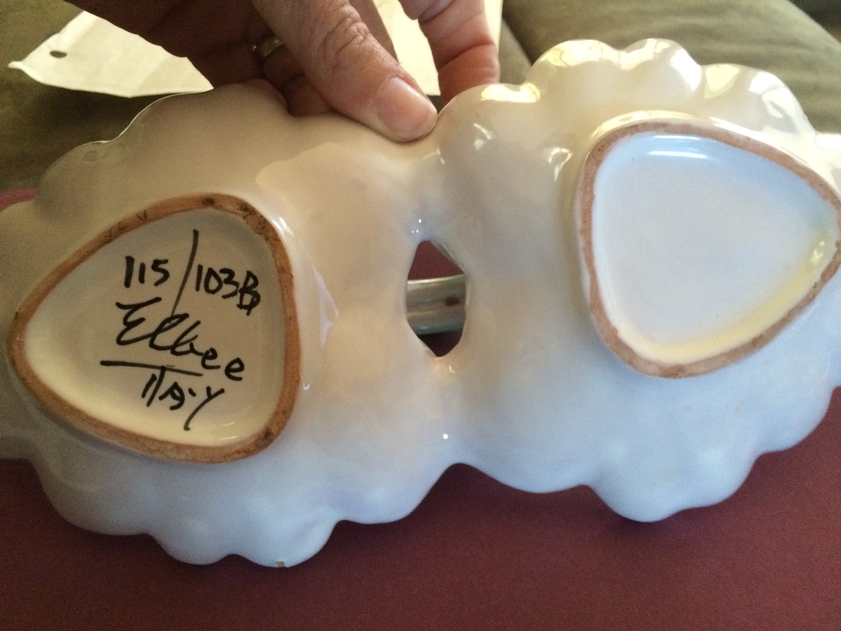 I was given a dish by and older lady who has since died and I wonder if it is an antique or just a dish she made herself. It has the markings of Elbee with numbers on the bottom (see pictures). It appears to be a candy or nut dish and looks to be hand painted?