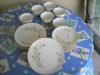 I do not know how old these dishes are and I am not sure what they are made of - Monarch and 22K white gold is stamped on the back - this is not a full set because a couple were chipped or cracked and I tossed.