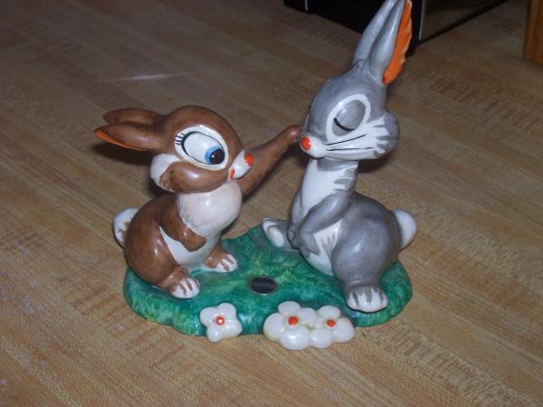 This is a fugurine of Thumper and his sister Minnie. I was told it was made by Hummel for Disney. Has the V and germany on the bottom. Sticker on top says Walt Disney THUMPERa.MINNIE Character WDP.F FM....Thanks for looking, I did find a web site with the info I needed. $200-$400 depending on condition, This is Thumper and Miss Bunny a Goebel Figurine from 1950's. Any one interested let me know [email protected]