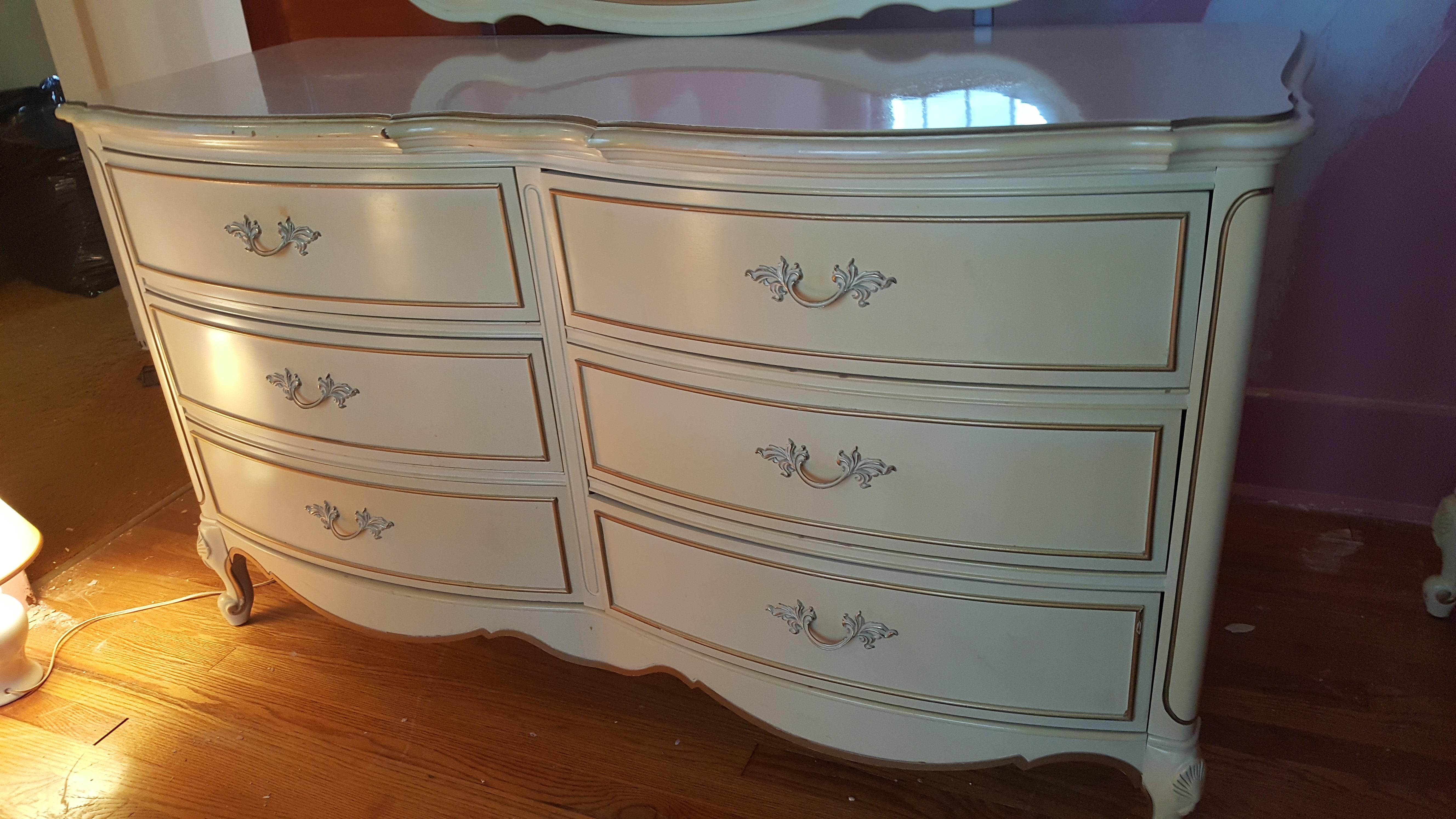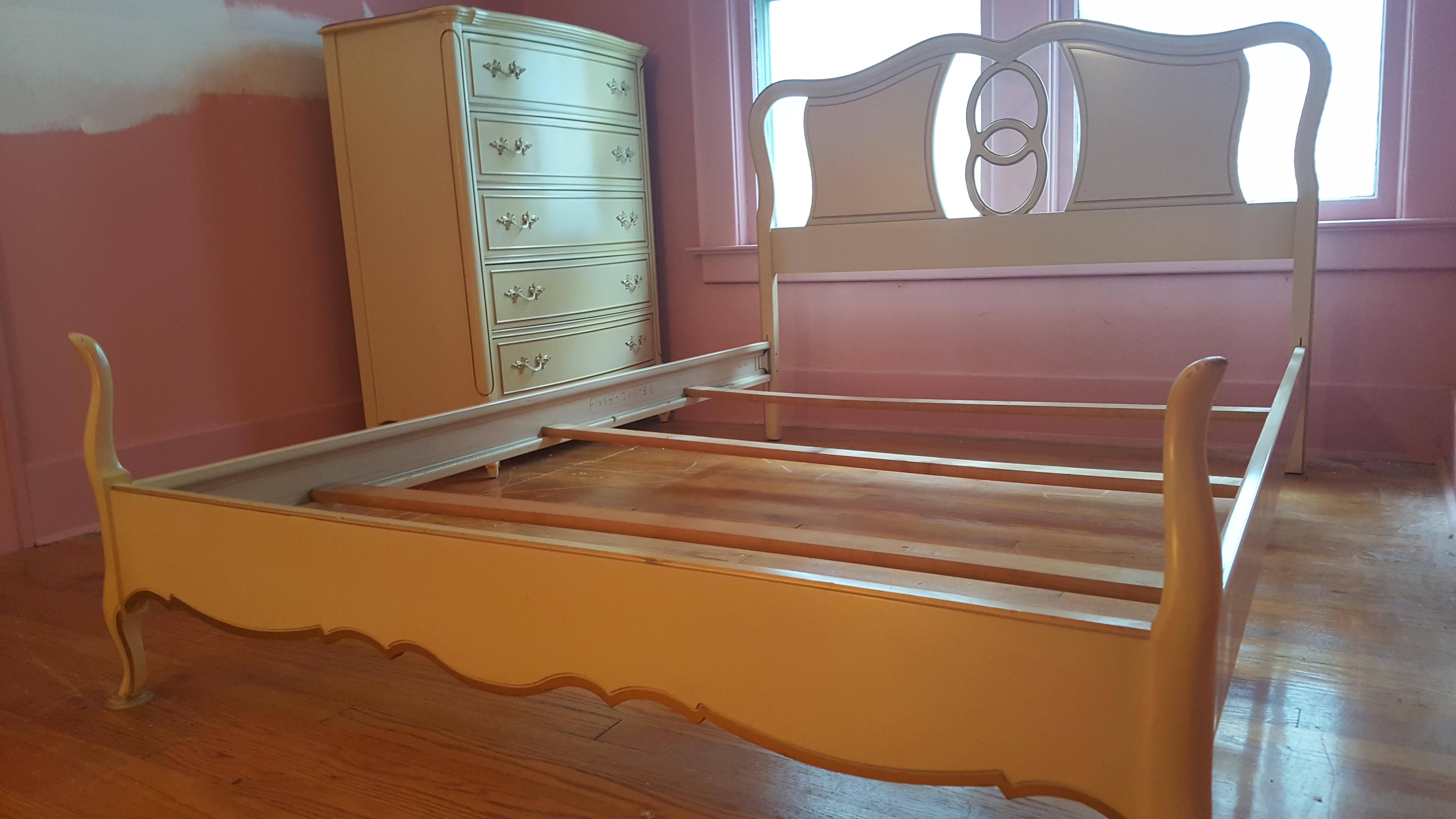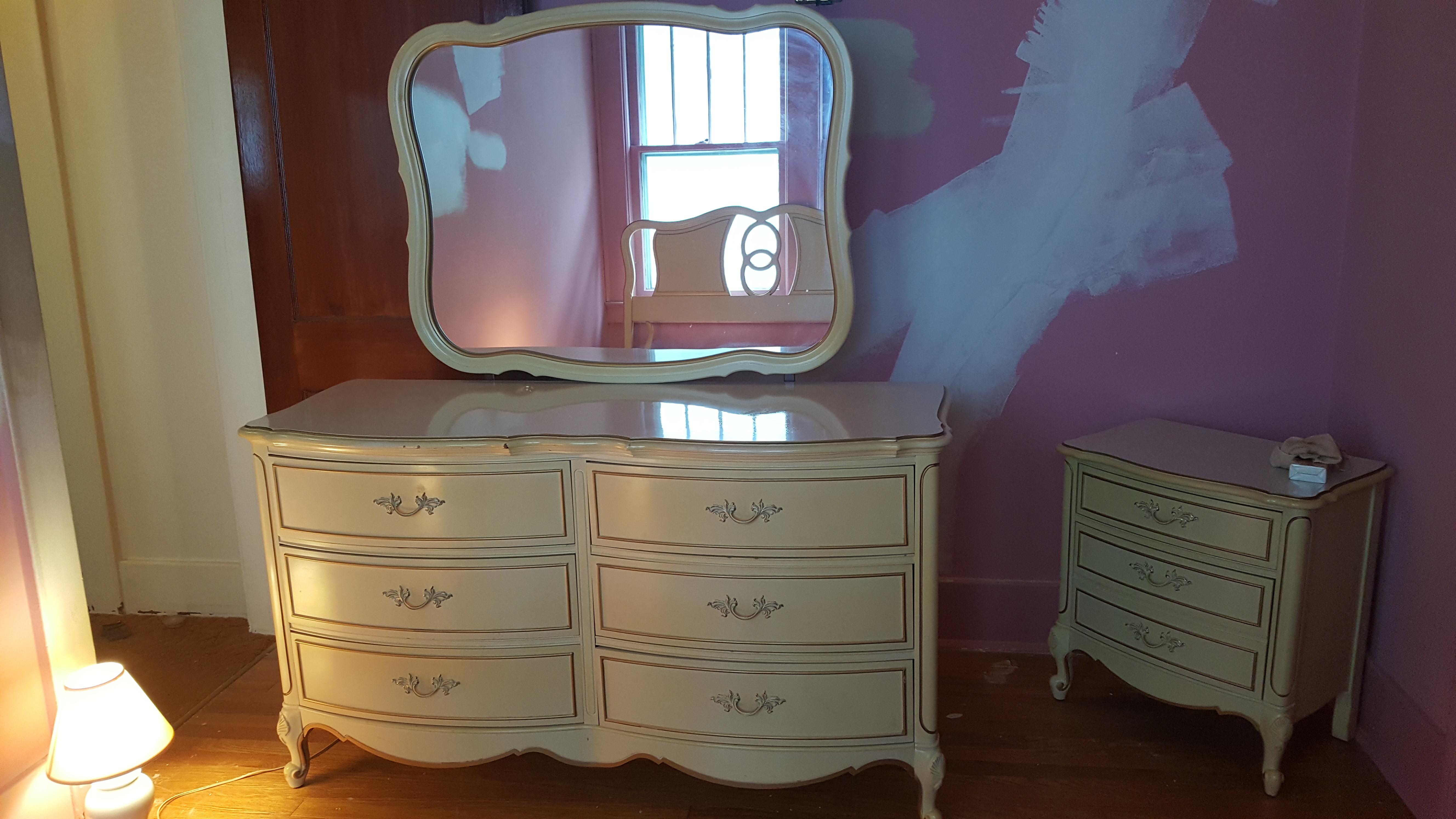 This is a bedroom set consisting of a night stand, tall dresser and low dresser with mirrow, and headboard and footboard.  Small superficial crack at base of headboard and some slight chipping on dressers.