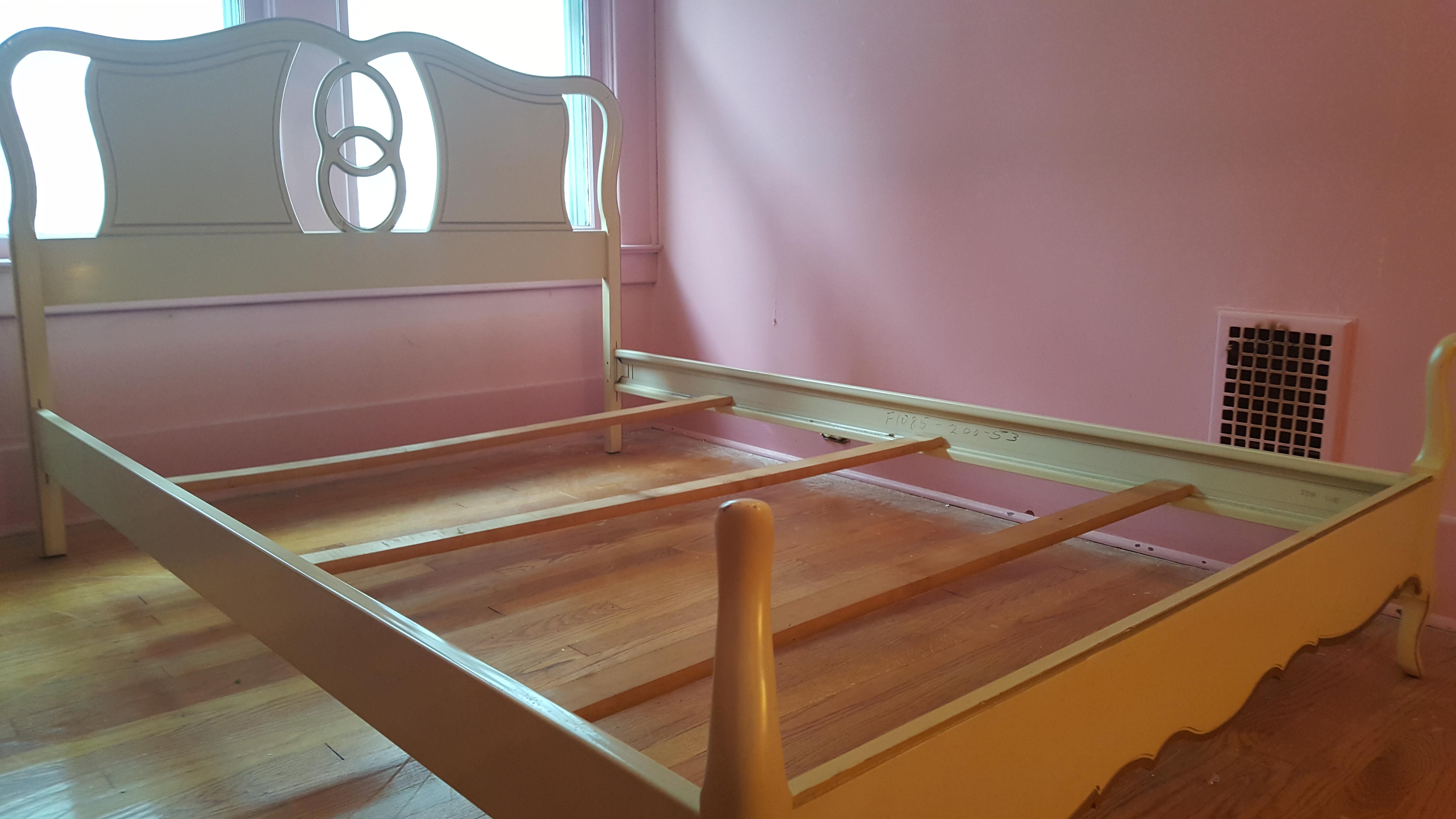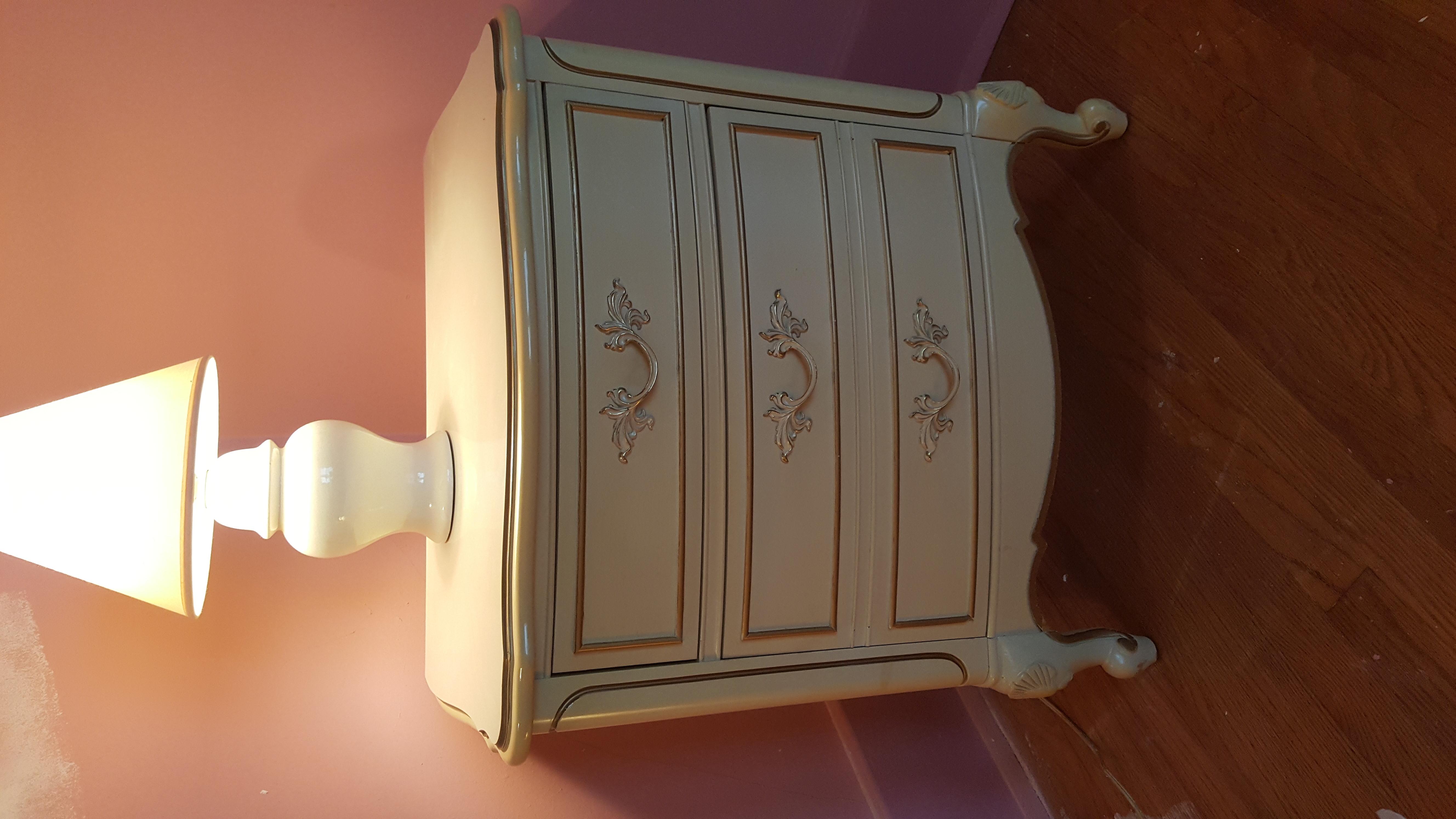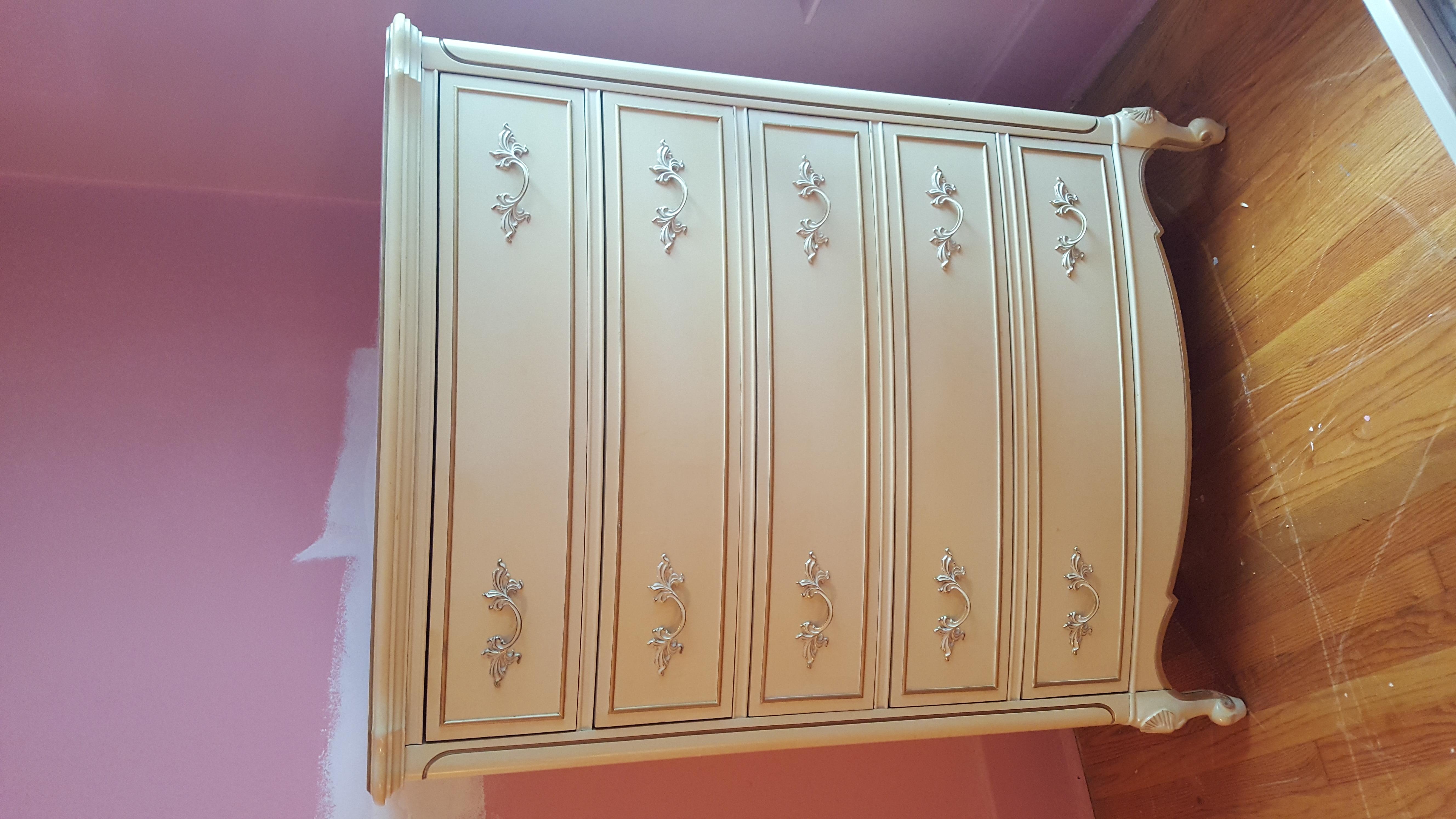 This is a bedroom set consisting of a night stand, tall dresser and low dresser with mirrow, and headboard and footboard.  Small superficial crack at base of headboard and some slight chipping on dressers.
