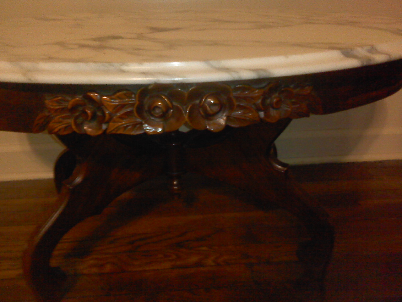 marble top coffee tabels and end tables  the end table have little drawers in them.  They are round  and have the flowers on them also.  The coffee table has 4 flowers carved on each side made of dark mahogany in excellent shape