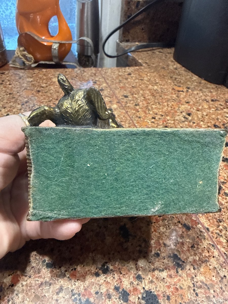 Physical Description: This item is a decorative bookend featuring two stylized dogs, one perched on top of a book and the other looking up from the side. The bookend is made of a metal alloy with a bronze finish, giving it an antique appearance. The dimensions are approximately 6 inches in height, 5 inches in width, and 3 inches in depth. The front of the bookend is inscribed with the words "A DAY'S FROLIC," which adds to its charm.