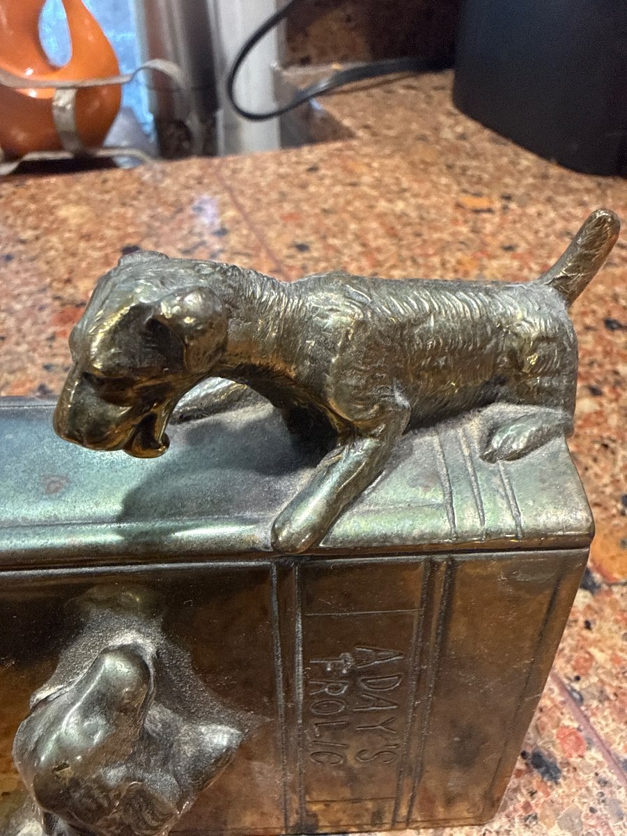 This piece likely dates from the 1920s to 1930s, based on the style of the dogs and the inscription. The construction method, including the casting technique and the patina, aligns with the period's decorative arts.