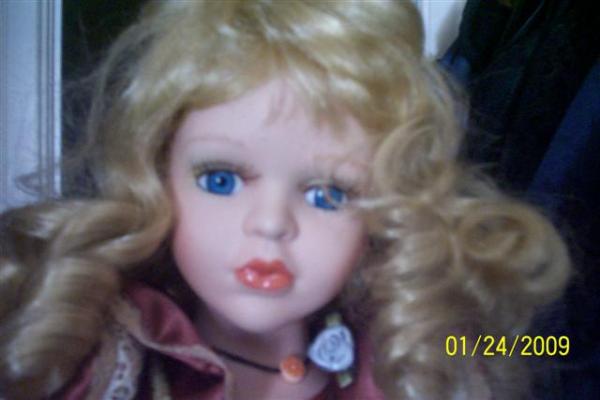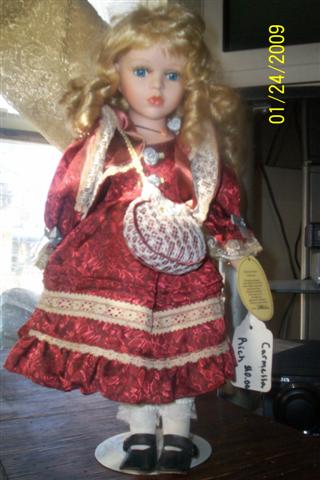 This is a porselian Doll from emerald collection her name is Carmella. She also has a hat that fell off when taking pictures.