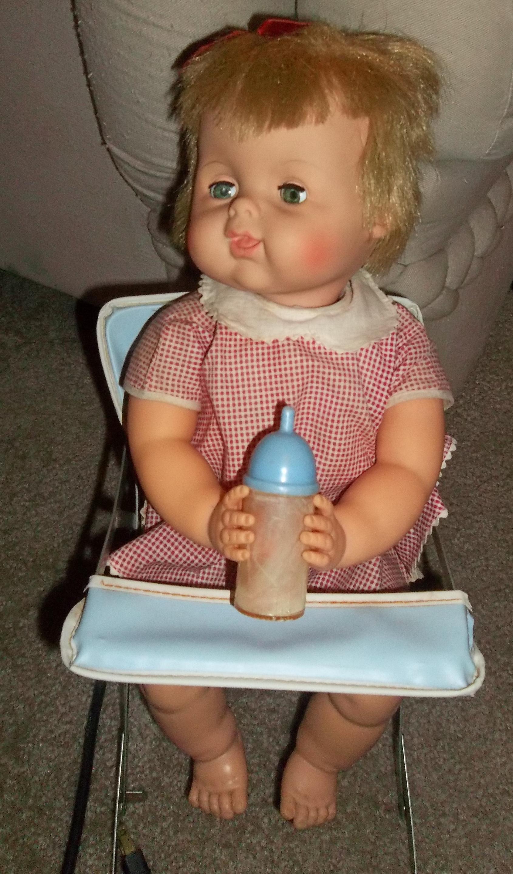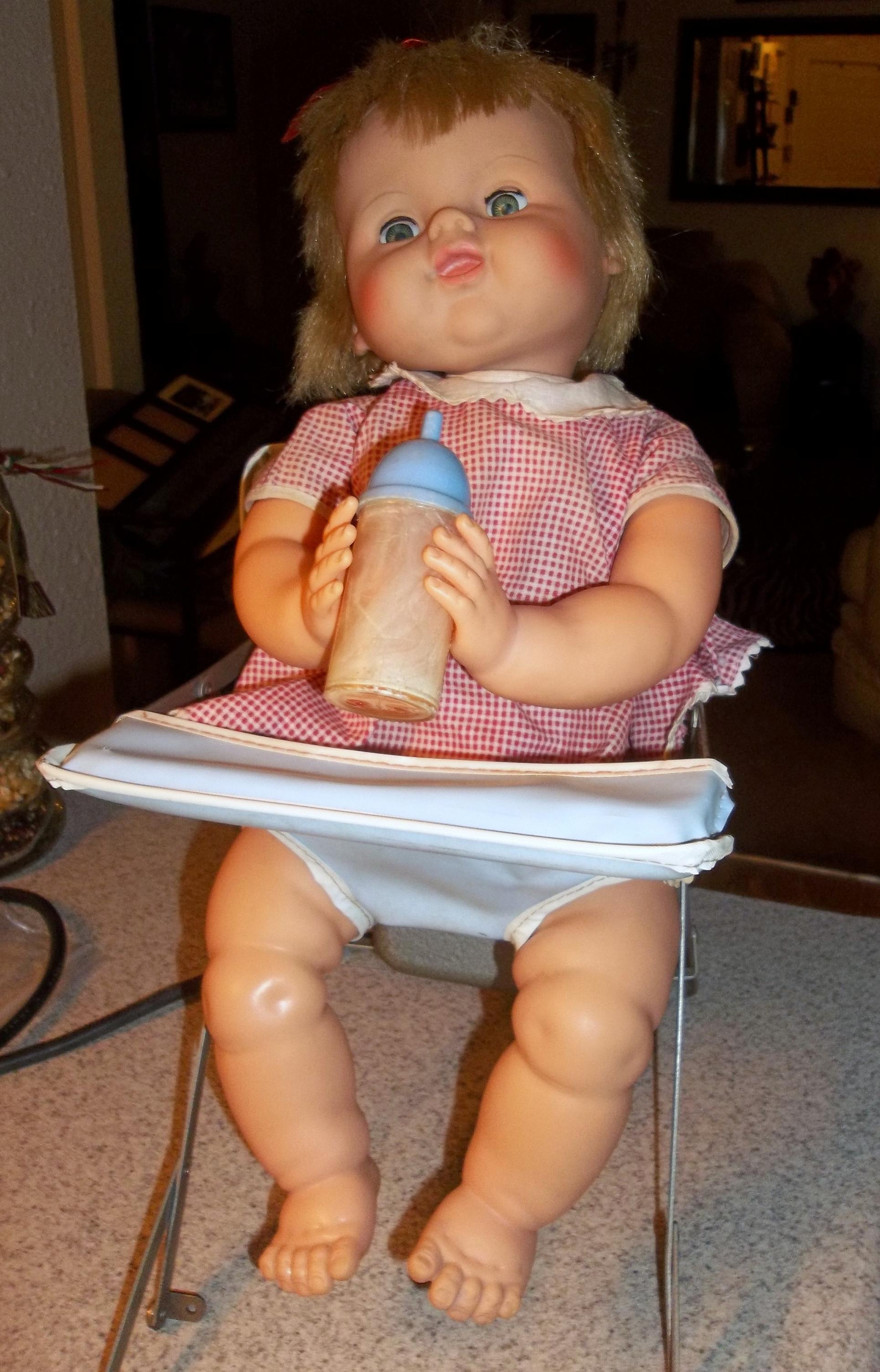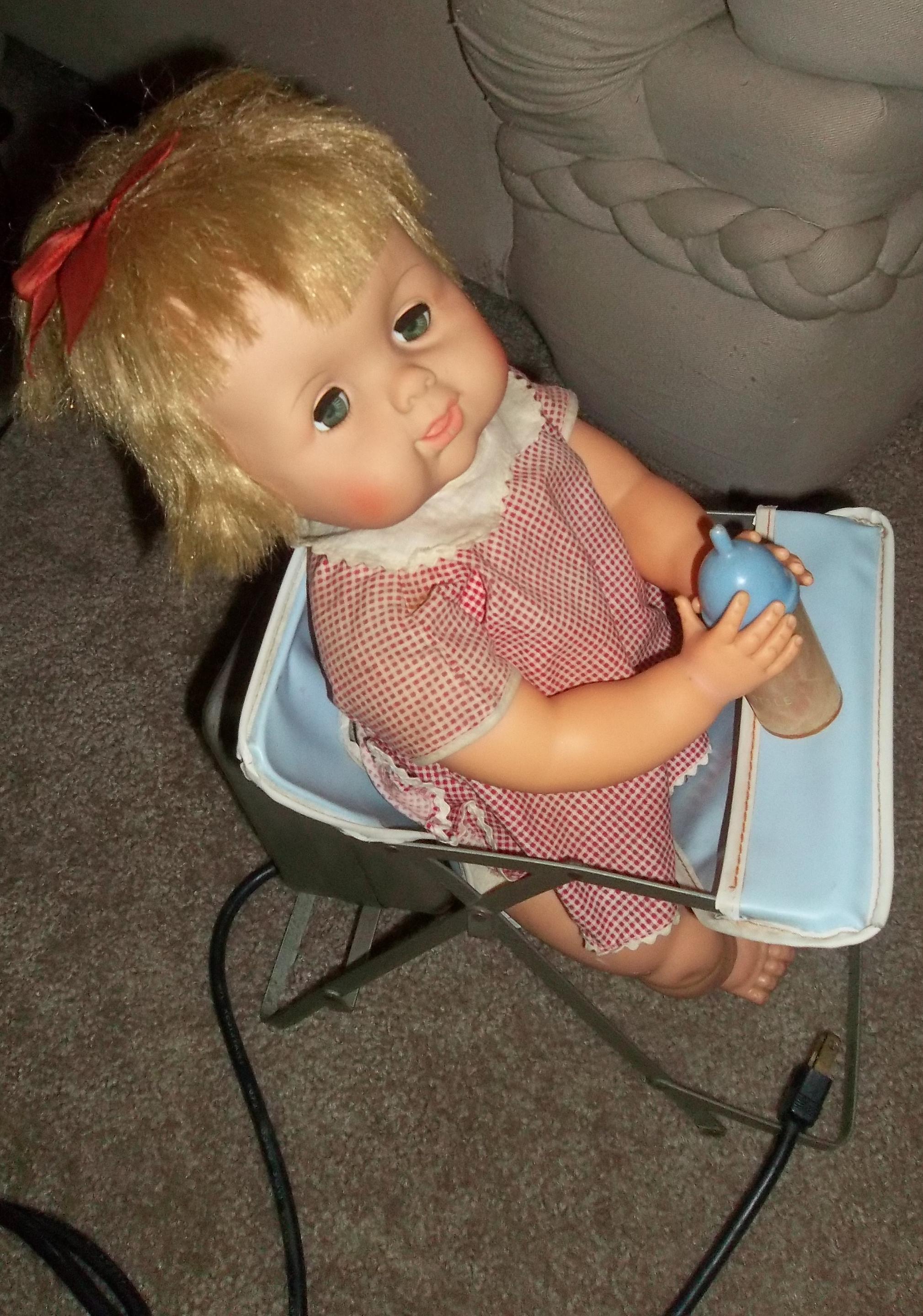 The doll is made hard plastic and sits in a highchair made out of thin metal pieces. with vinyl blue cover. when plugged in the doll will tip the bottle to her mouth, tilt her head back and drink bottle, her eyes will shut when head back and open when sitting up. Appears to be a skewer or something that is making doll movable. She has holes drilled in her to allow for the power source.