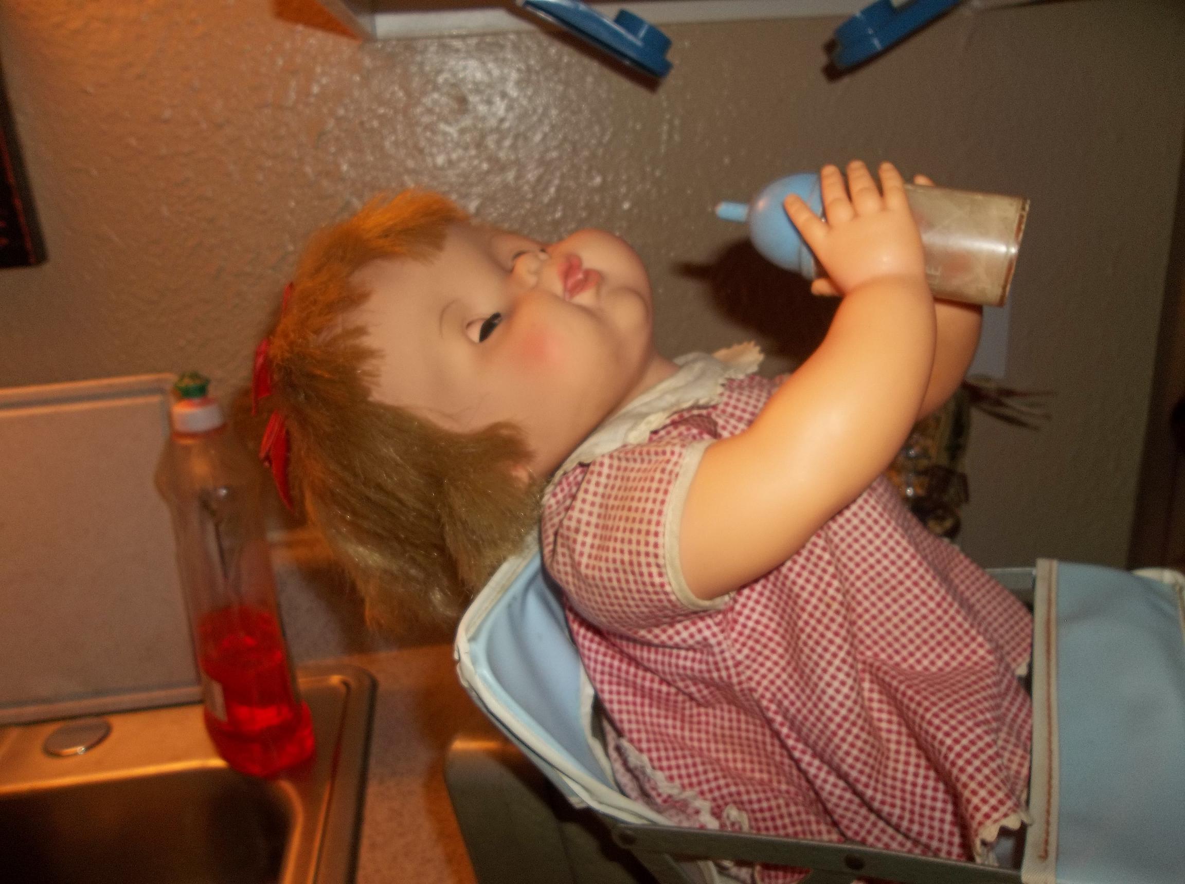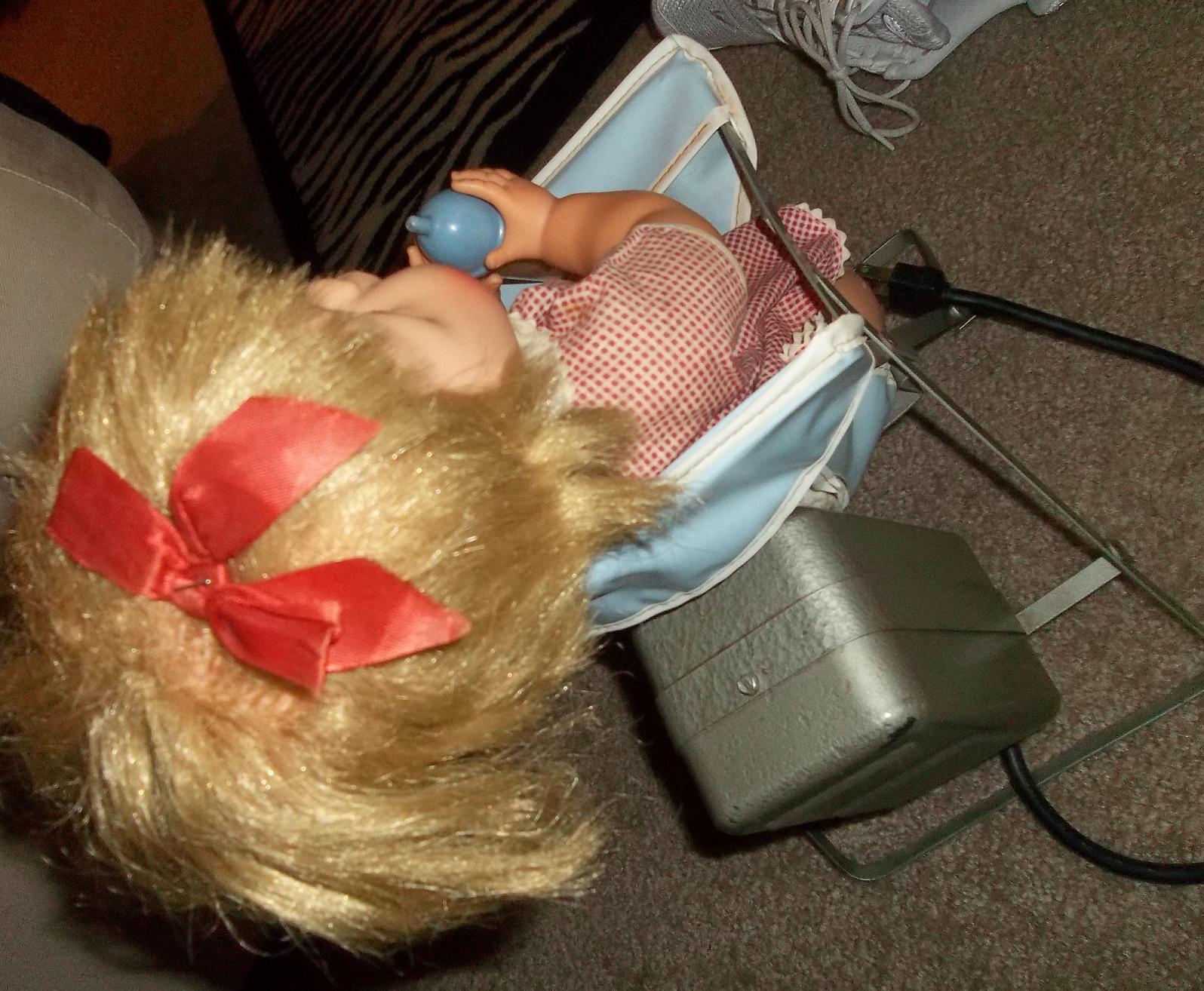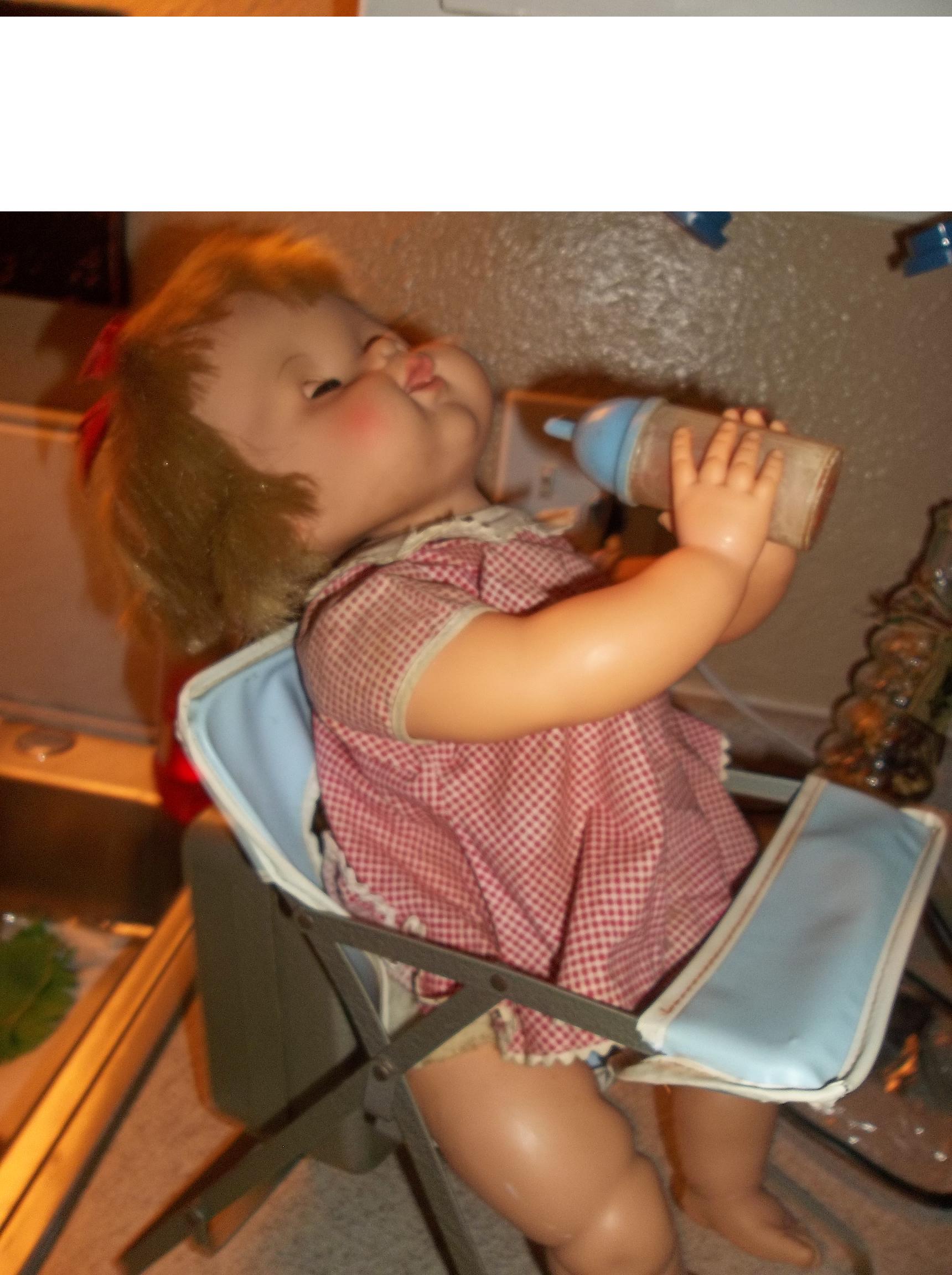 The doll is made hard plastic and sits in a highchair made out of thin metal pieces. with vinyl blue cover. when plugged in the doll will tip the bottle to her mouth, tilt her head back and drink bottle, her eyes will shut when head back and open when sitting up. Appears to be a skewer or something that is making doll movable. She has holes drilled in her to allow for the power source.