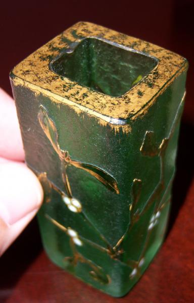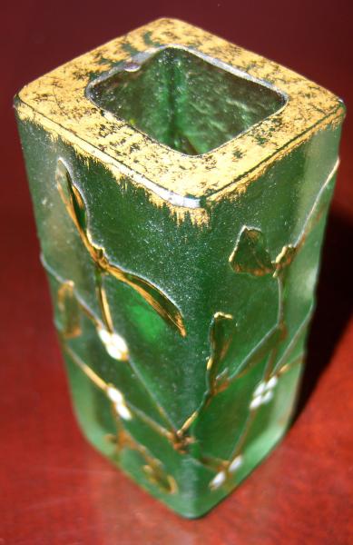 Dom Nancy rectangular-shaped mini vase with frosted green glass. Approx. 3.25" in height. Floral images are created on sides in gold paint with small pearl-like gems appearing as the floral buds. Gold adorns the rim. Dom Nancy signature and cross of Lorraine are crisp and clear on the base. This is a beautiful piece. No chips. Well preserved. c. 1900 (making it 100+ years old).