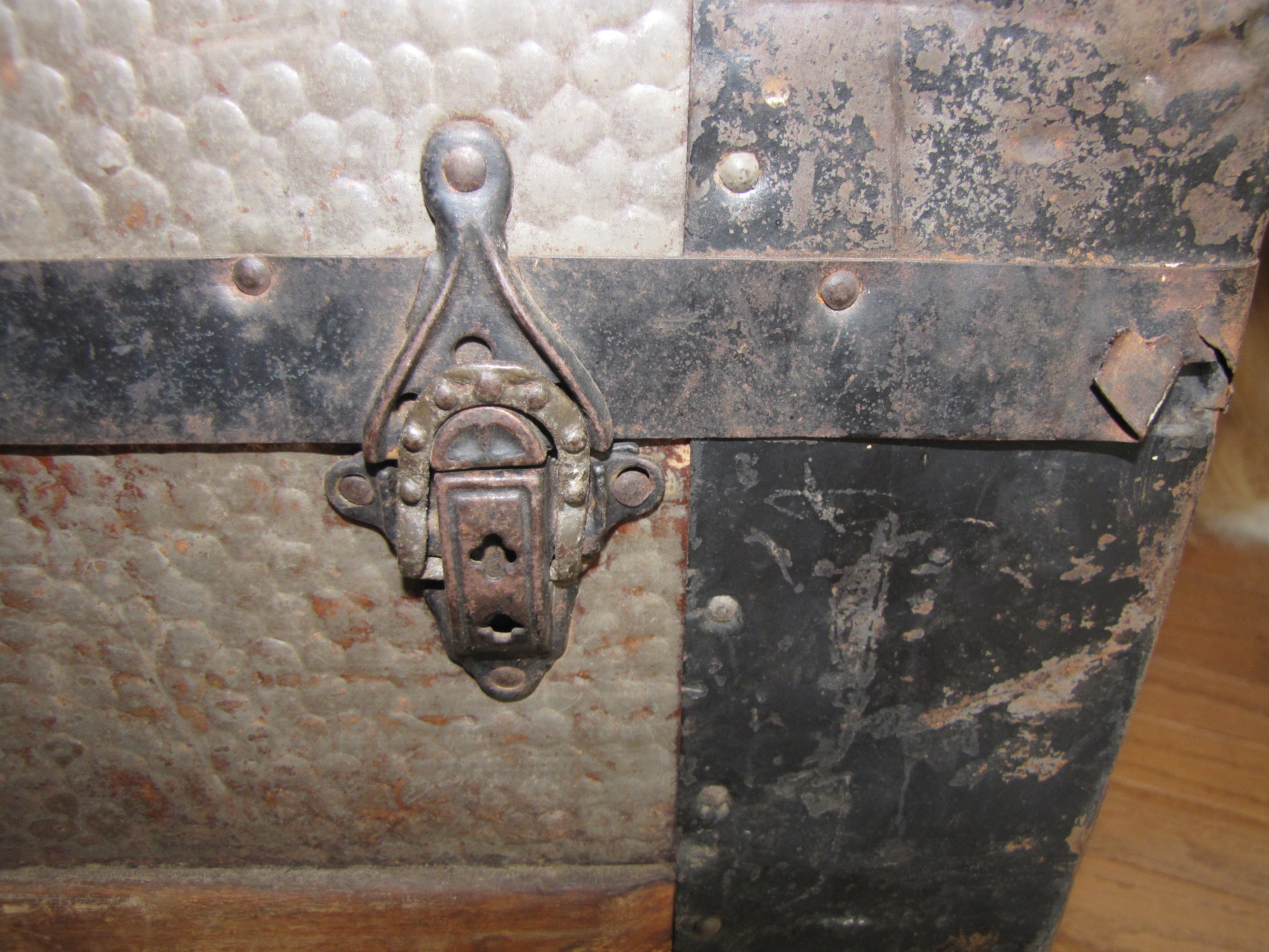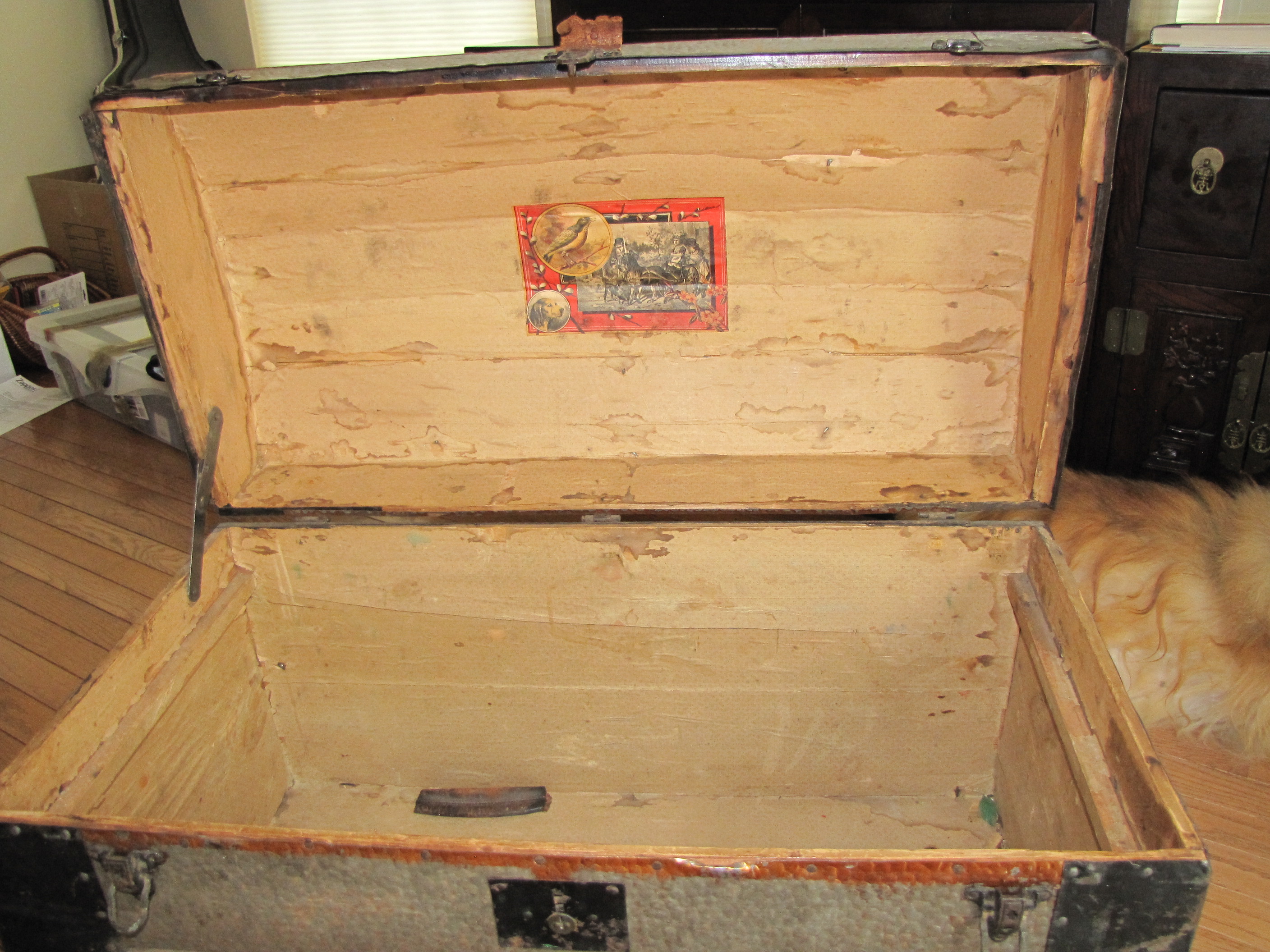 Dome trunk with aligator pattern metal front and back. Lithograph on inside lid is of 2 little girls being bulled in a carriage by a dog with a boy standing next to it; there are also pictures of a bird and another picture of a dog framed in circles on the lithograph. There are metal rollers on the bottom. There is also a patent mark on the key hole, I can't make out a couple of the letters: *PAT7D.MAR.598AP?R77*