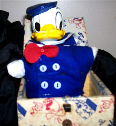 Wooden Box with spring-up Donald Duck Painted Head and Cloth Body