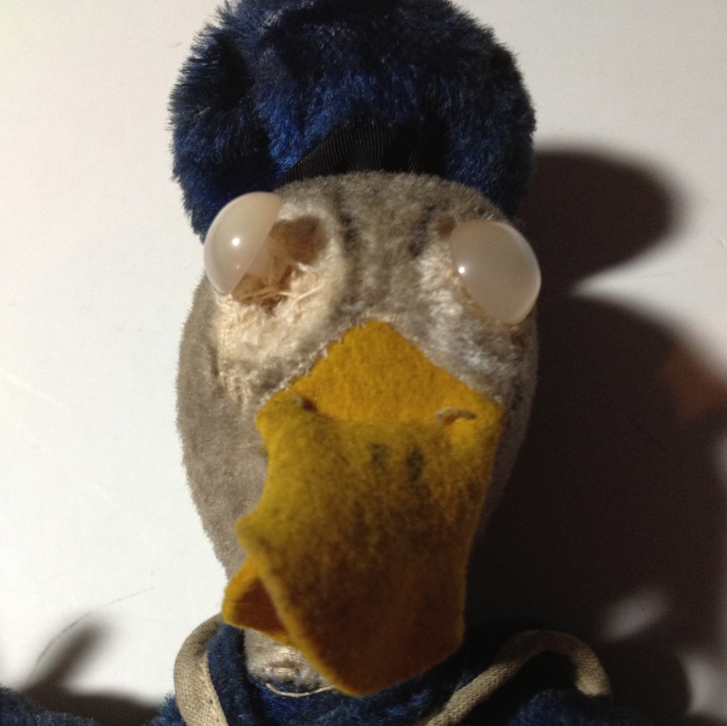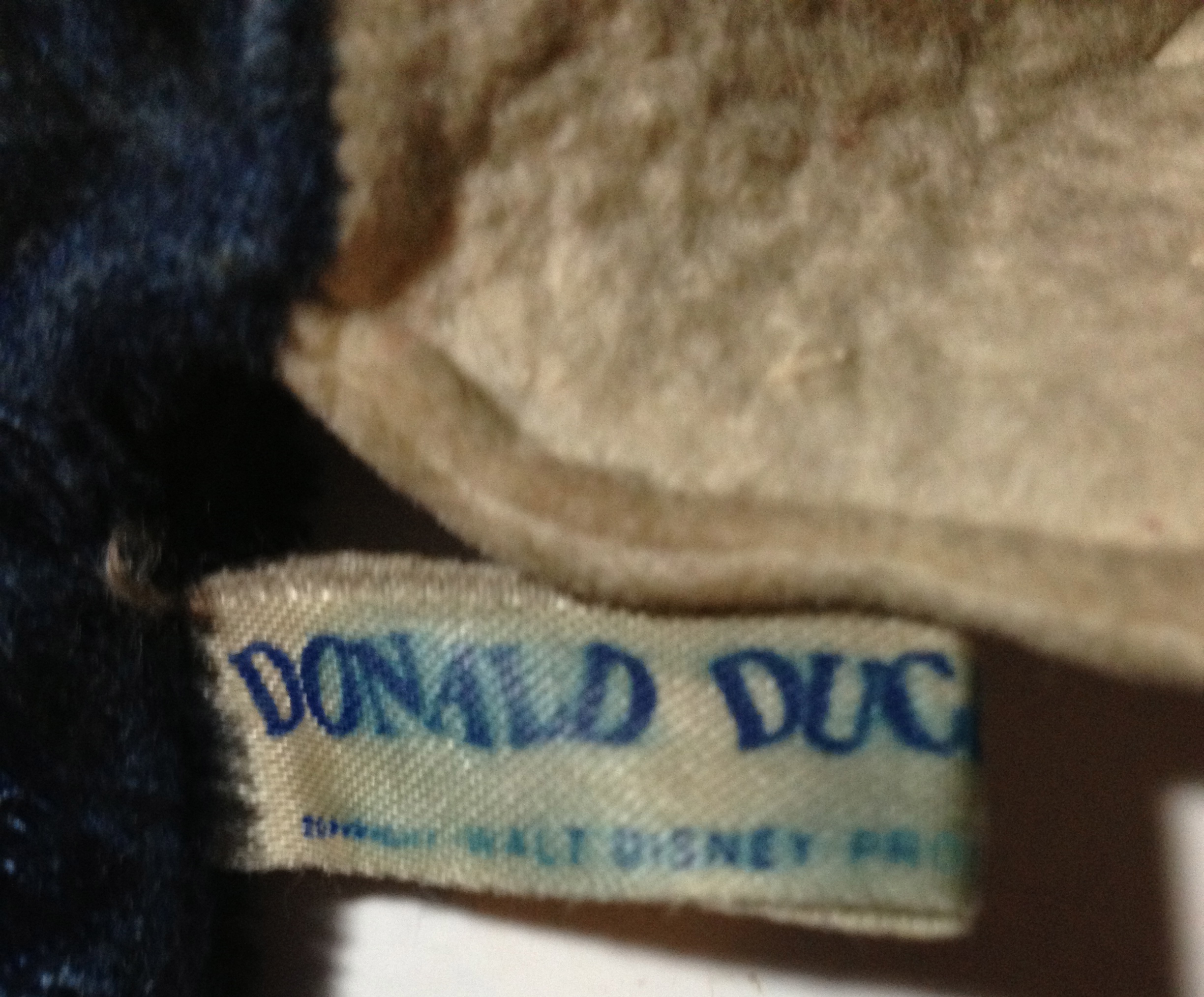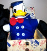 9.5" tall Donald Duck puppet, made of velveteen. All cloth except for the replaced button eyes. Hat has been sewn back on. Made by the "Character Novelty Co. Licensee South Norwalk Conn" Tag also says, "Donald Duck Copyright Walt Disney Prod"
