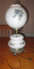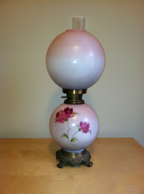 The condition is between Mint and Excellent. My aunt kept it on her bedroom dresser, as did I in our guest room when I inherited it. The lamp has a slightly different three flower motif on the top and bottom globes which is adjusted to fit the size of the glove. The top globe is slightly larger. The back side of the bottom globe has an additional single flower and a bud with leaves.The bottom globe lights up with a low wattagge bulb which makes a wonderful night light. There is a 3 way switch on the lamp.