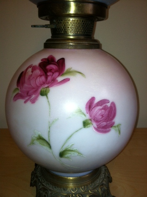 The lamp puts off a nice, warm, even glow which is very welcoming. The flowers, which appear to be hand painted, are purple and rose colored on a light pink background.