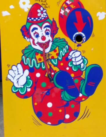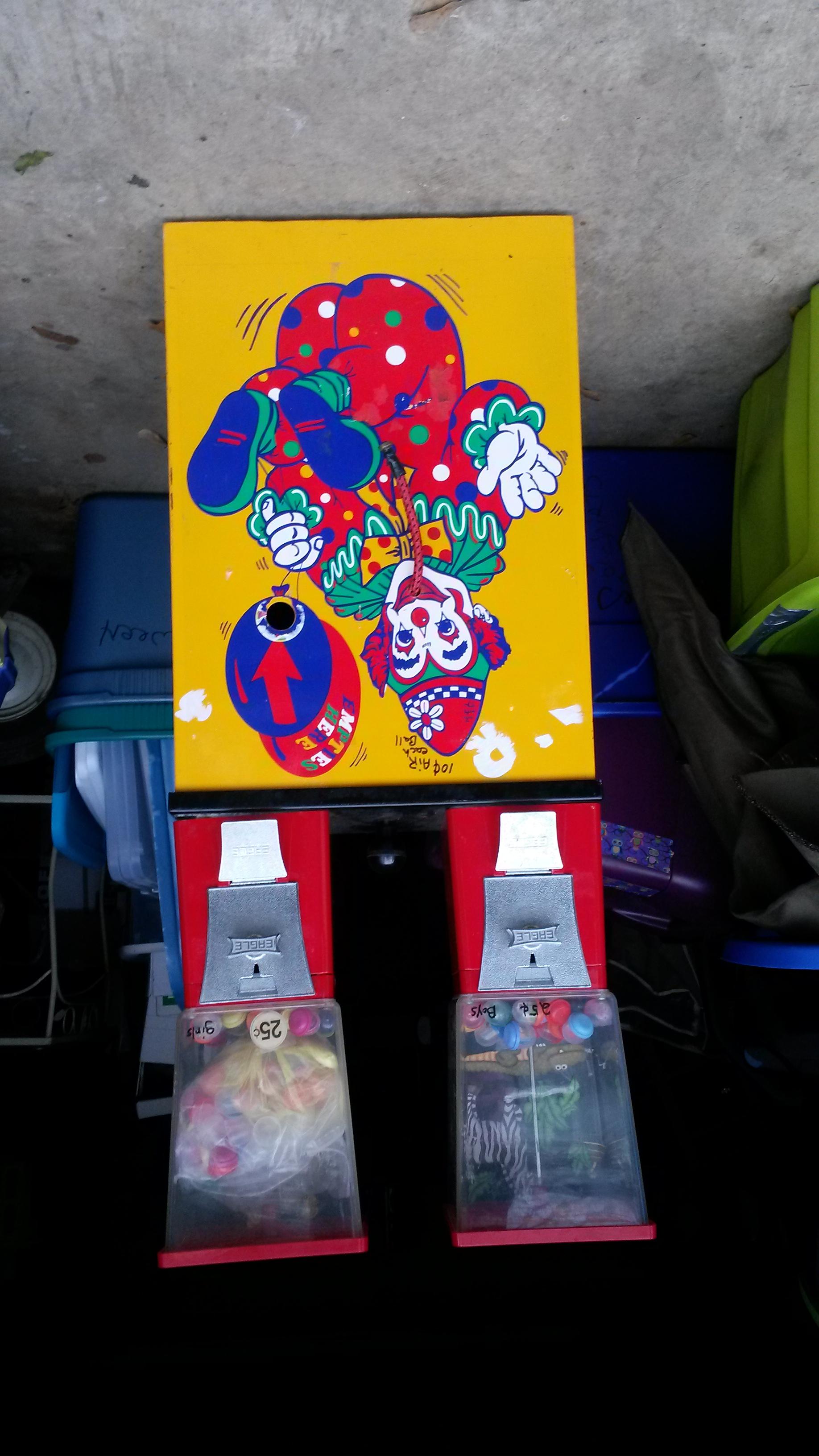 I know nothing about this gumball machine other than its made by eagle. Someone put it on the street for garbage on garbage day and i picked it up. It needs new locks in each top and thats all as far as i can tell. I have done a lot of internet searching and cant locate anything like it. The white on the yellow paint is from stickers that i can get off. There is some magic marker on it too which i plan to remove. The air pump does work. Works just like a bike pump. The hose comes out of the clowns mouth. The pump comes up between the 2 machines. Its located in Raymond, Ms. Any information and appraisal would be greatly appreciated.