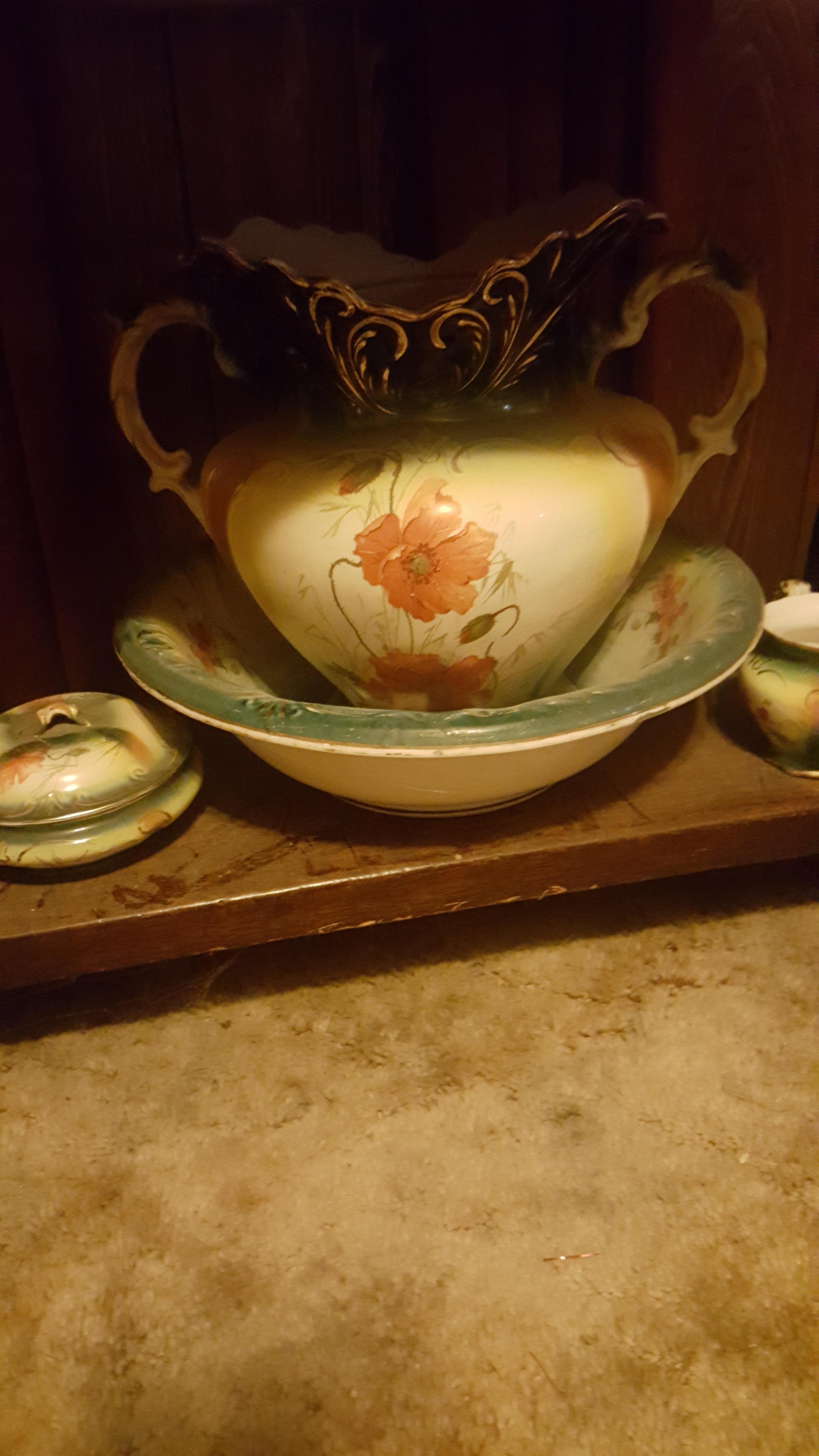 Has gold trim, double handled has shaving mug and soap dish. Great shape no date on bottom