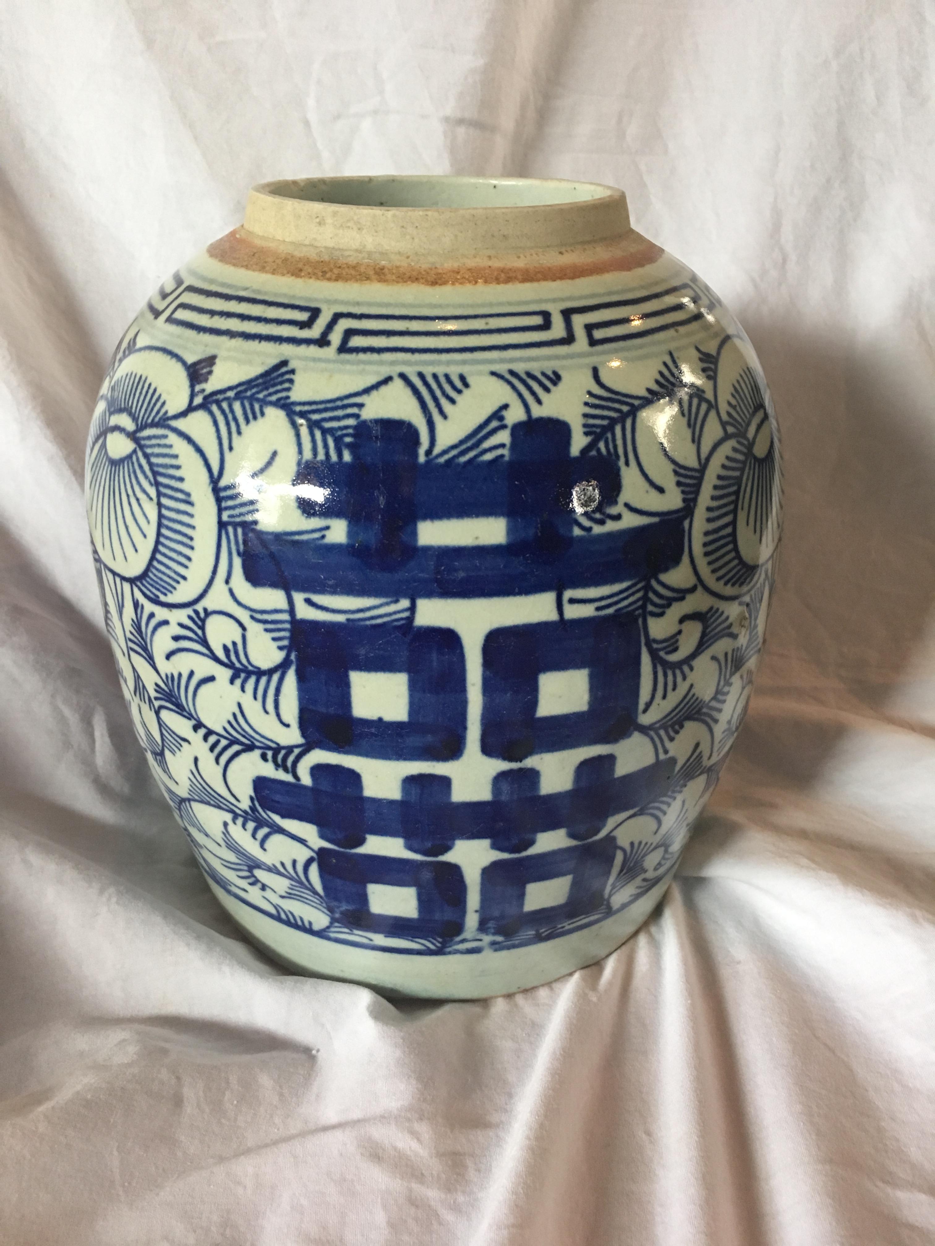 I picked up a cobalt blue and white Chinese double happiness ginger jar at an estate sale. The lid is missing but it is in good condition otherwise. There may be a small swirl marking on the bottom. Hard to tell though.