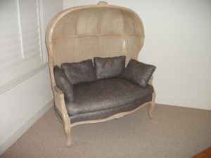 I would love to know the history of this piece. I have been lead to believe the single double wickered canopy/porters chairs are rare but have never seen another double porter's chair. Anyone have some information? I would love to know. Thanks!
