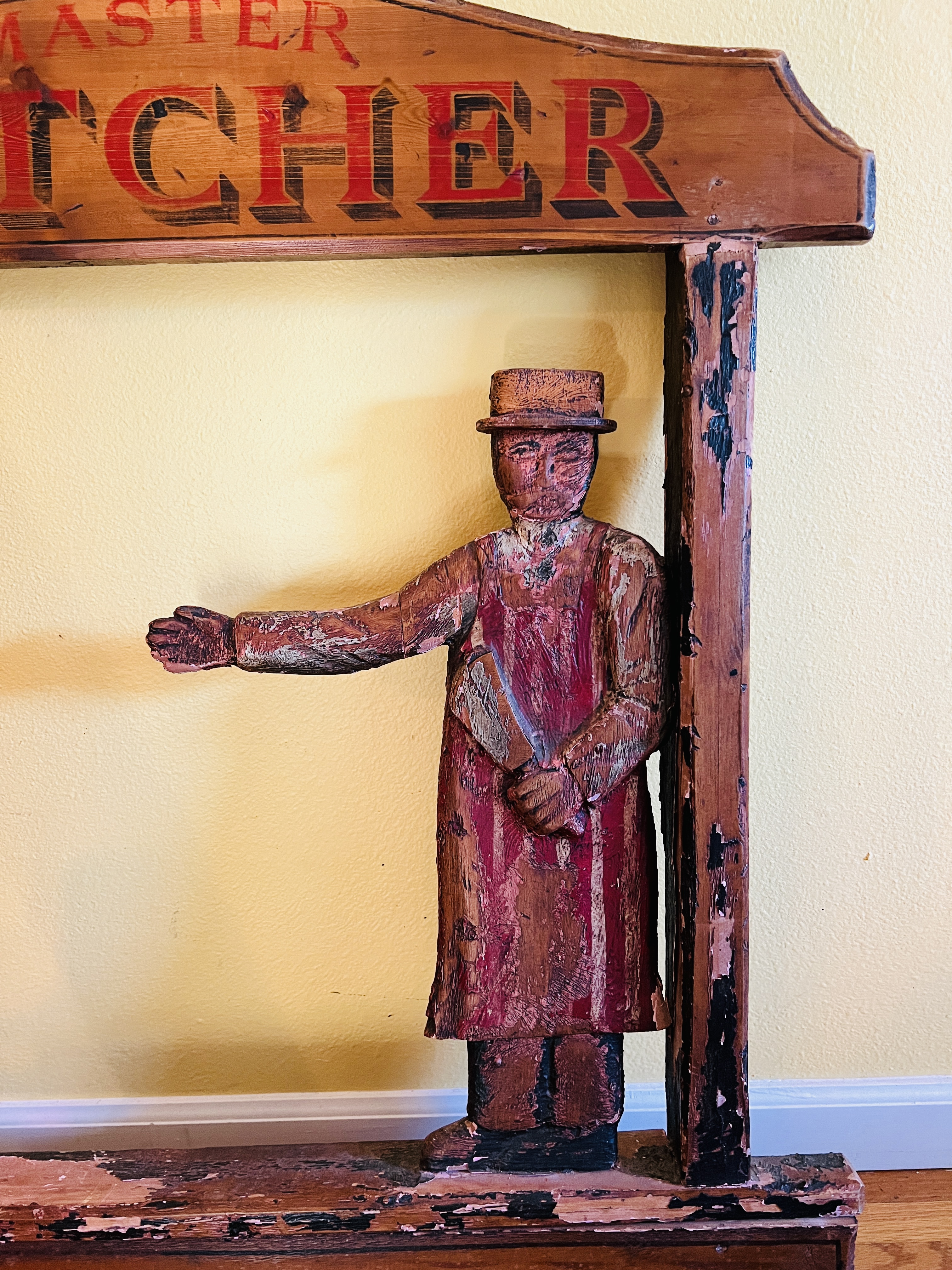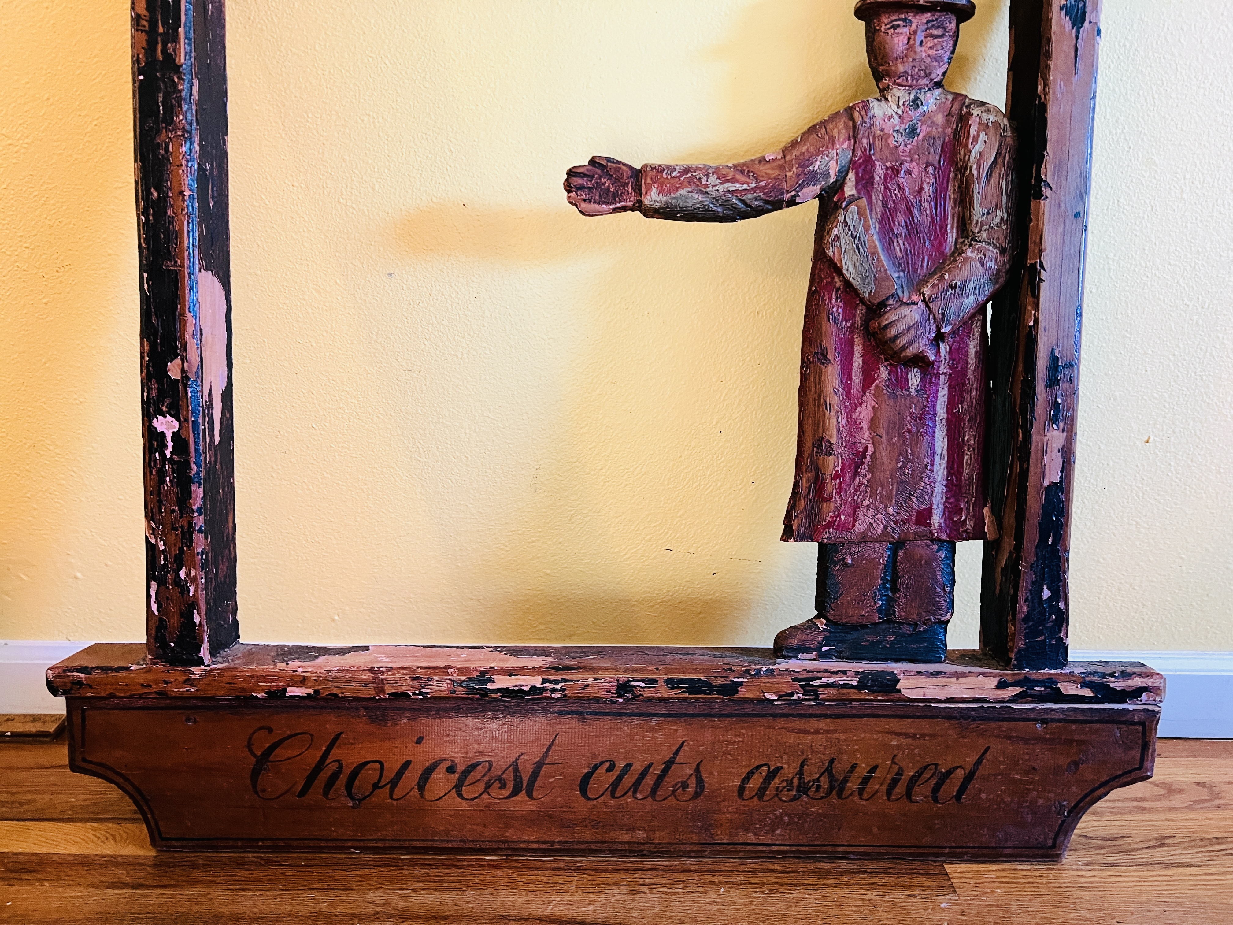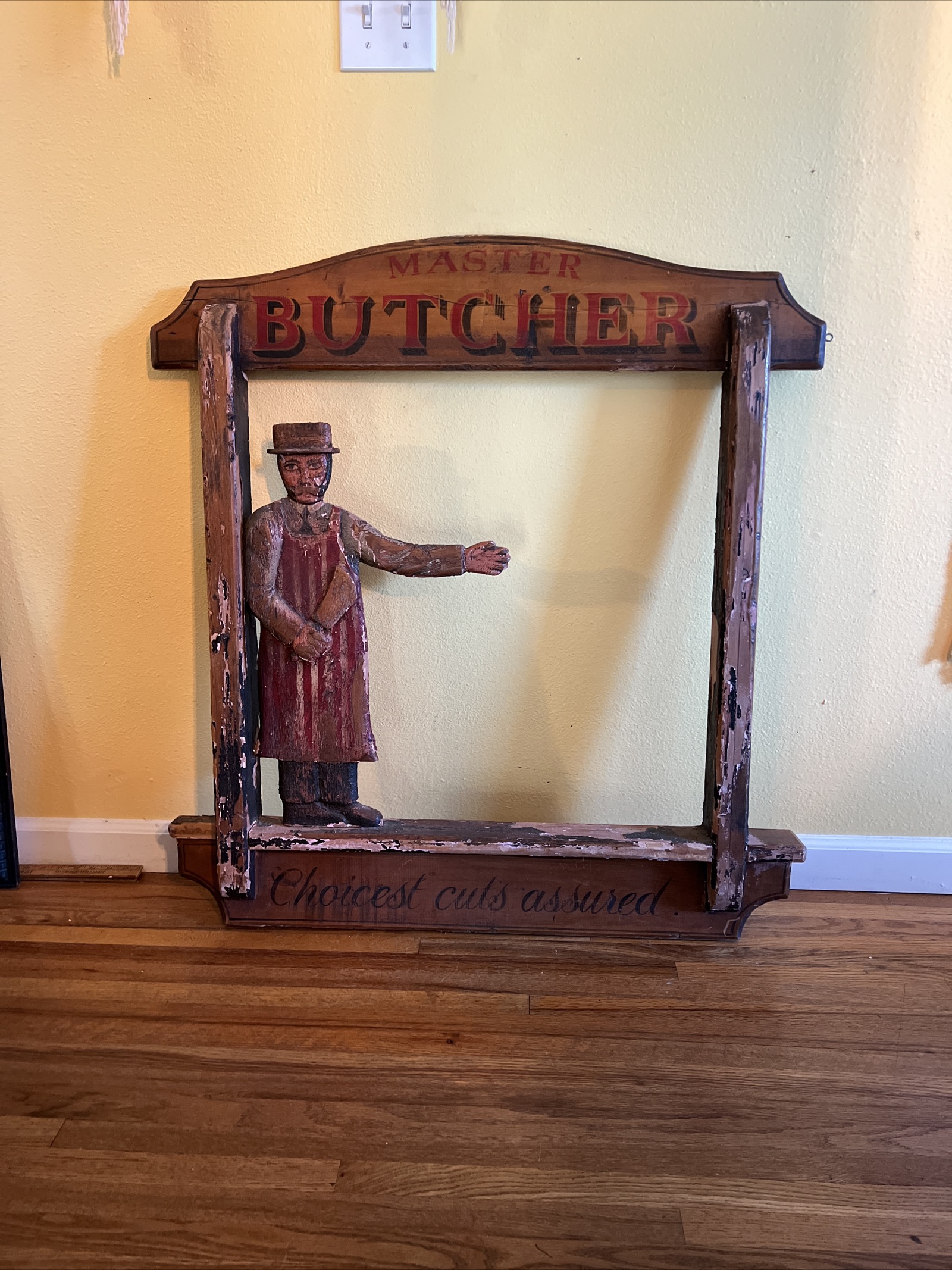 34 inches wide by 36 inches tall. Double sided master butcher wood signage. Found at estate sale in Beaverton, Oregon. Paint is very chippy has carved figure in the middle of a butcher, and a red and white striped apron with a large cleaver in his hand, appearing to point to the direction of where possibly the butcher shop was.