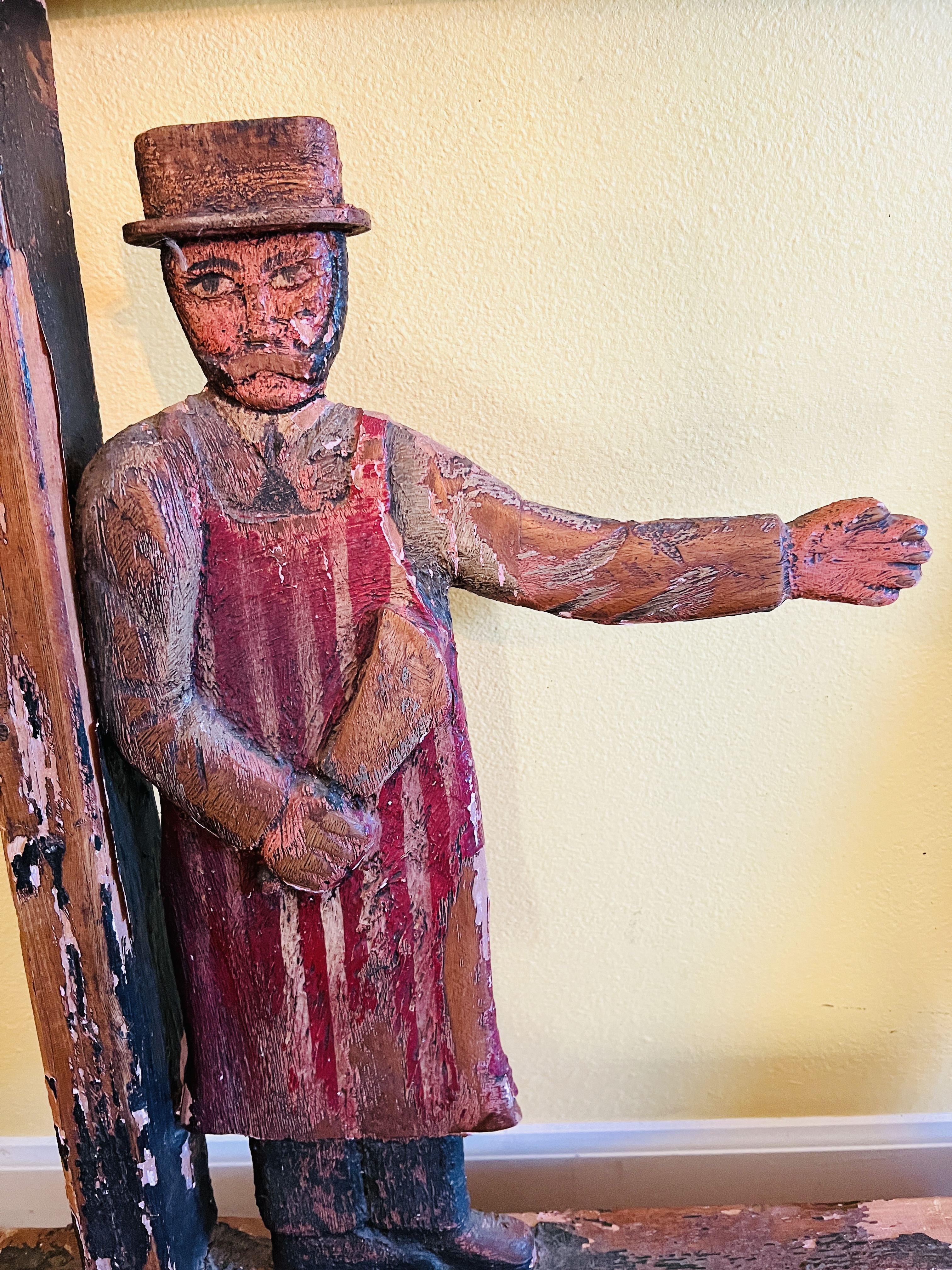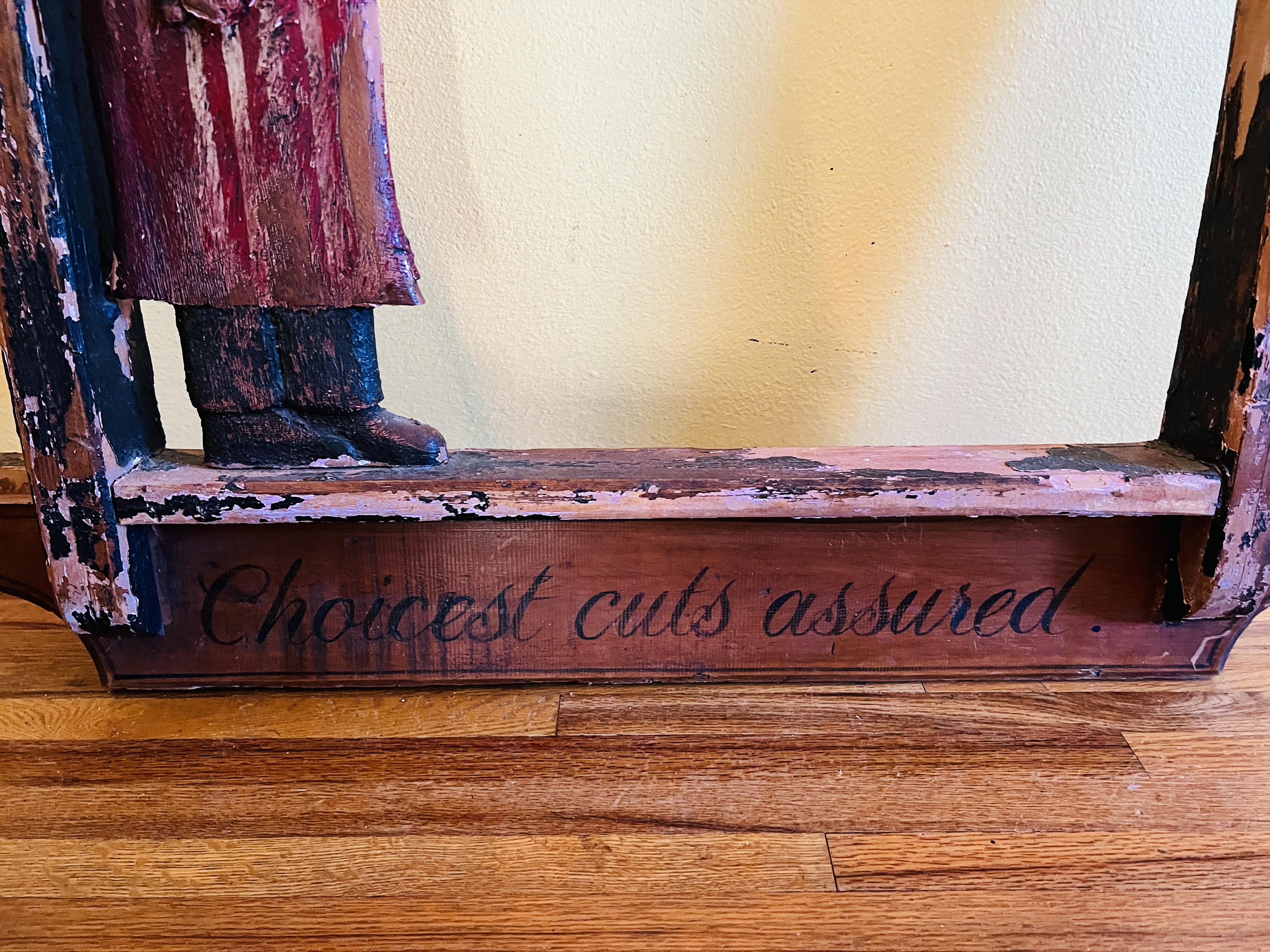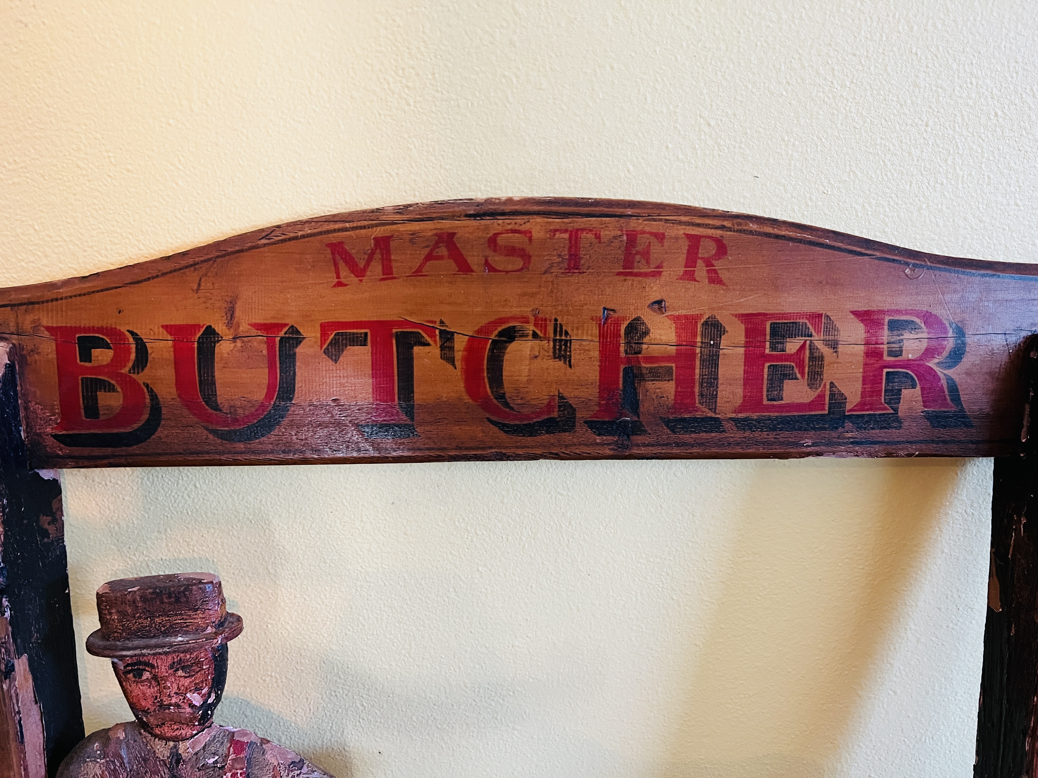 34 inches wide by 36 inches tall. Double sided master butcher wood signage. Found at estate sale in Beaverton, Oregon. Paint is very chippy has carved figure in the middle of a butcher, and a red and white striped apron with a large cleaver in his hand, appearing to point to the direction of where possibly the butcher shop was.