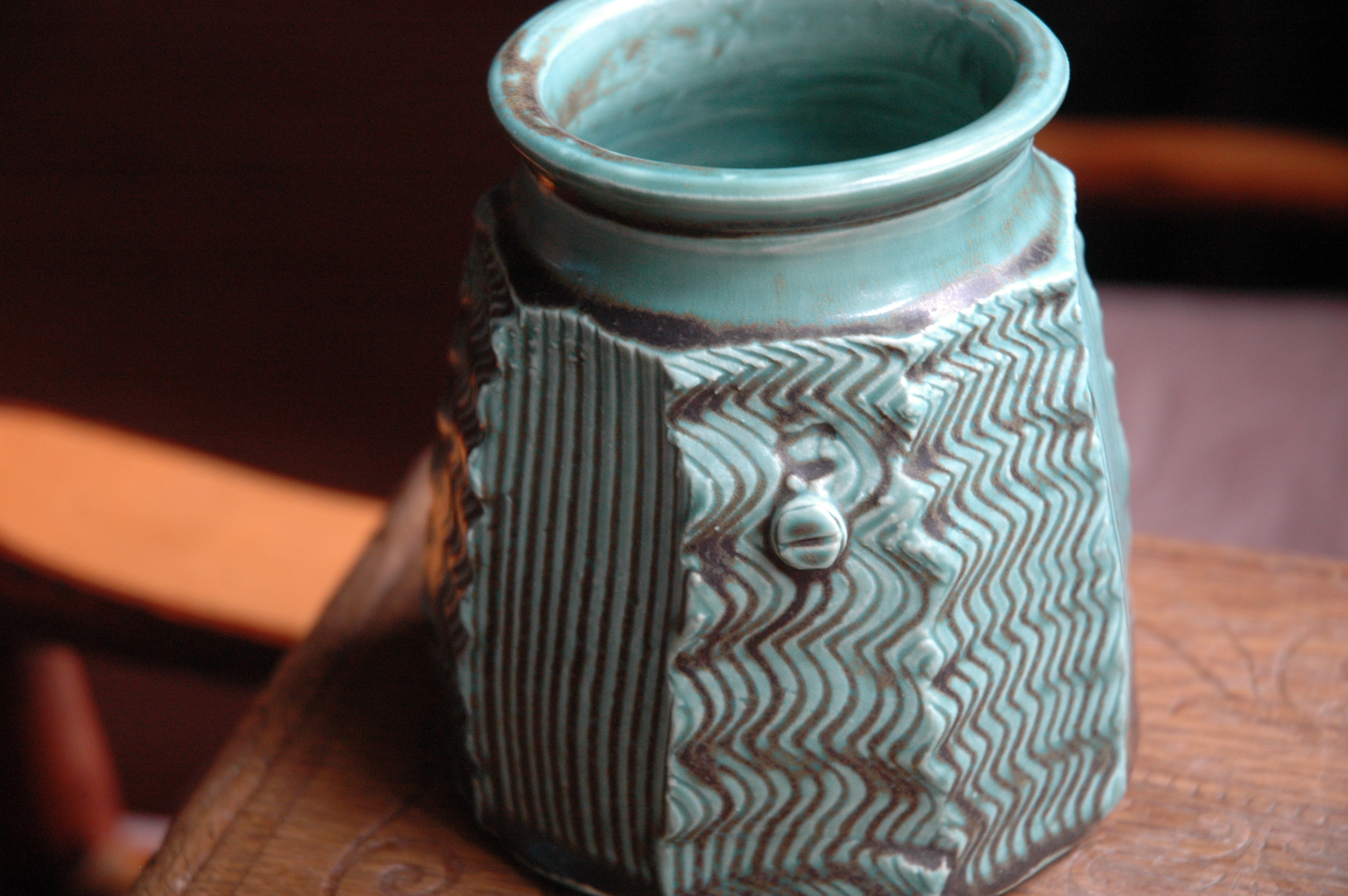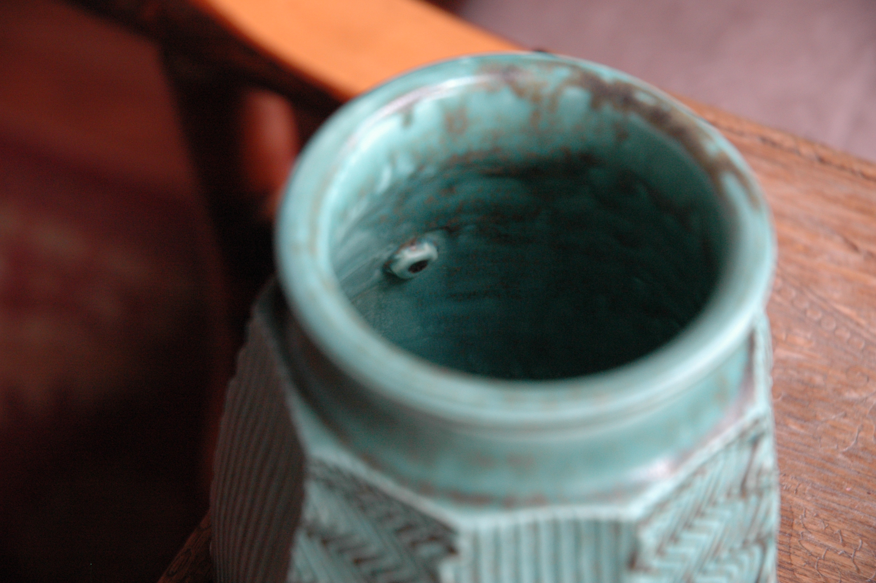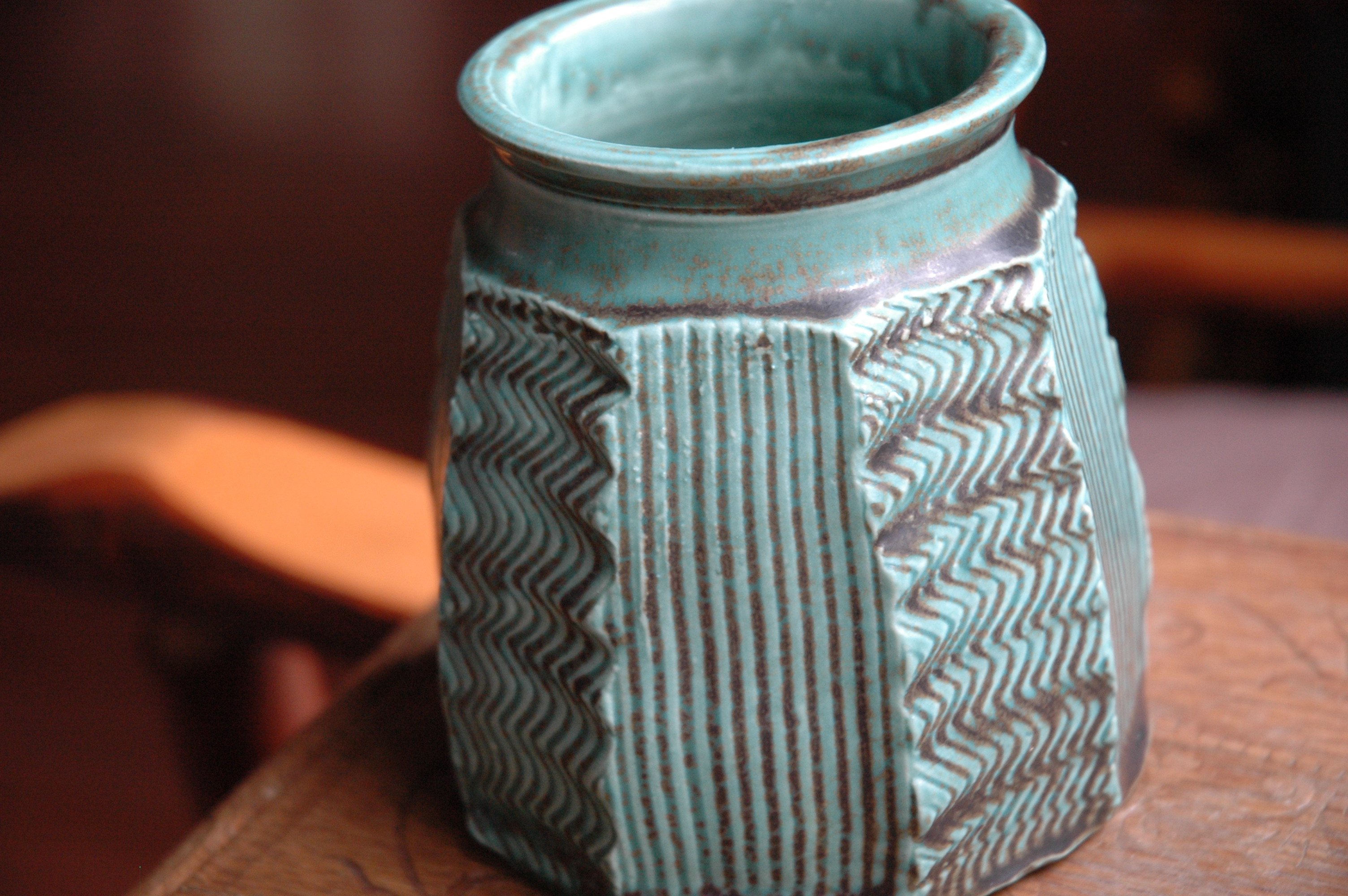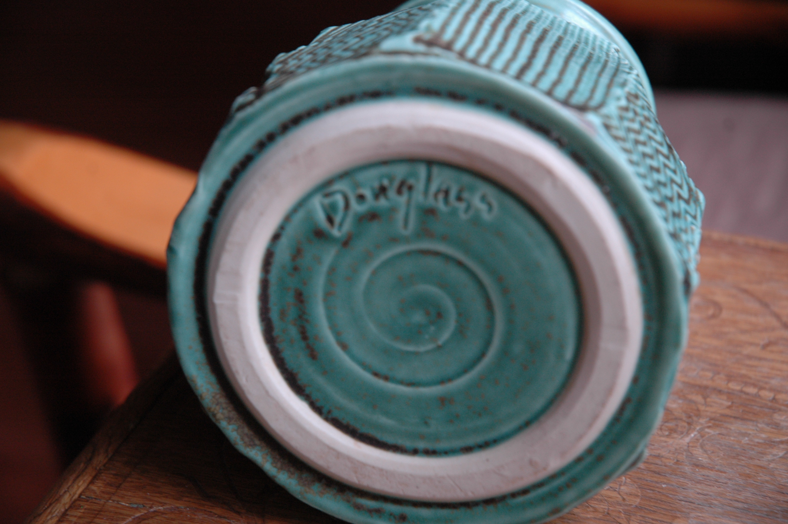 I have a vase marked Douglass on the bottom. The item is actually more green than it looks in the pictures. It is about 5 inches tall and 5 inches wide at the base. It is in excellent condition without any cracks or chips. There is a screw and nut cast into the piece with the screw on the outside and the nut is cast into the inside. I do not know how old it is. The only information I could find on Douglass pottery is from the early 1900s in California. I dont know if this is from that company.  Thank you for your time.