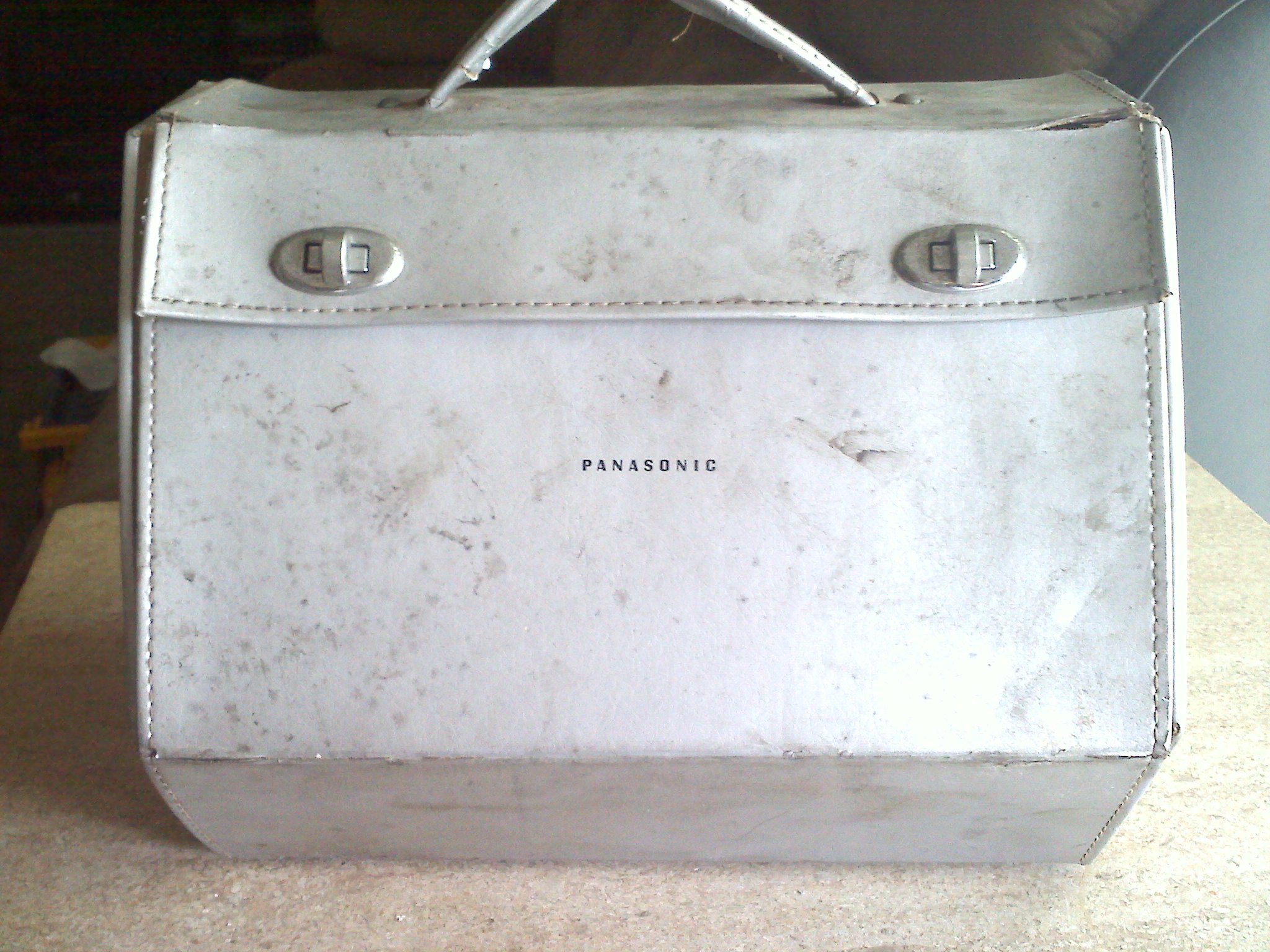 Silver carrying case folds open fm radio with 2 side speakers. says made in japan with model number located on bottom RE-7430