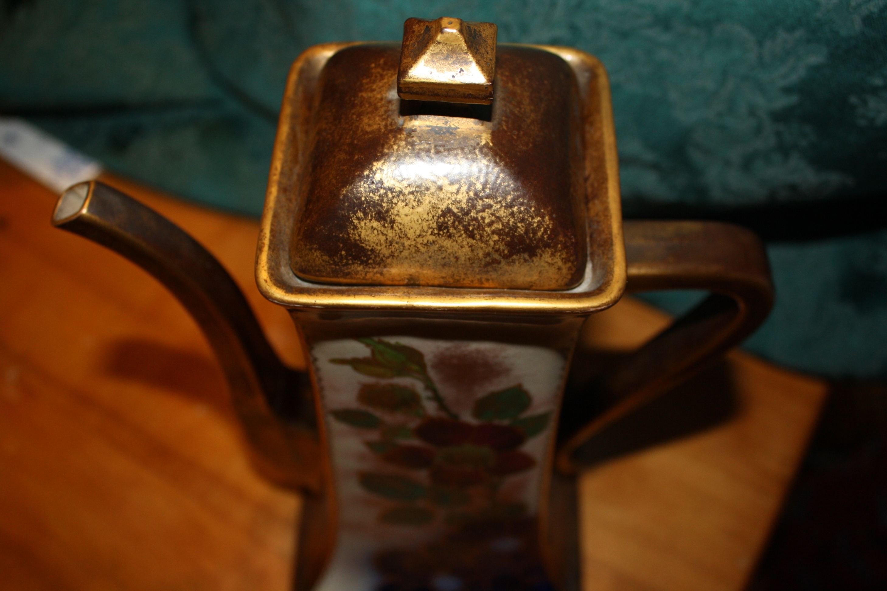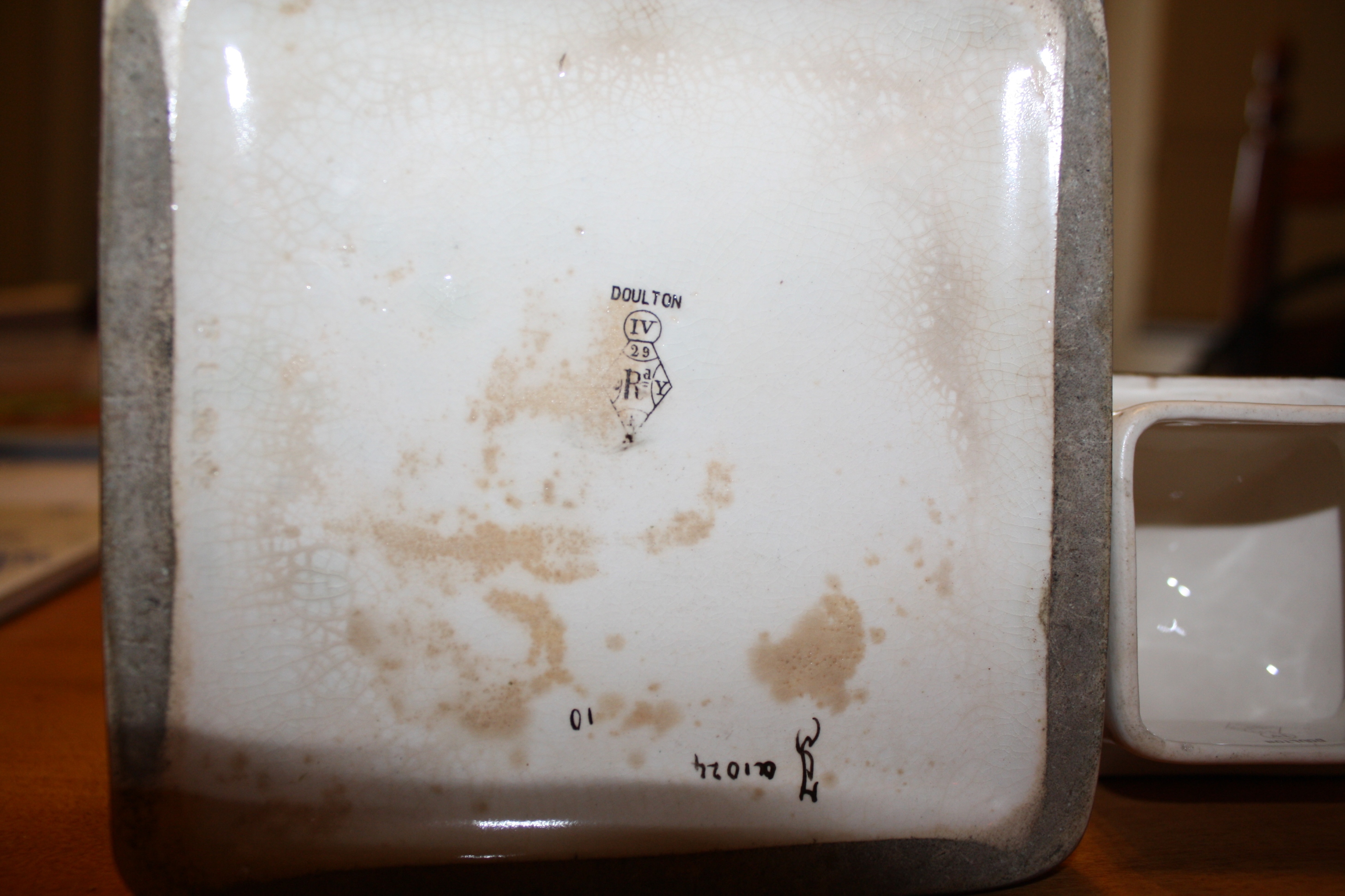This pitcher is cream colored on two sides with blue and burgandy flowers with leaves outlined in gold.There is also some applied gold around the flowers/leaves. The other sides, spout and handle are dark underneath with applied gold. The lid is applied gold as well. This has been in the family and well taken care of. It has no chips or cracks. The Doulton symbol is more clear on the inside of the lid than bottom of the vase(pictured). The center of the mark is a capital "R" with an A to its top right. Each corner of the diamond shape has a symbol. Starting from above "29", on right "Y", bottom "E" and left "12". On the top of the diamond is a circle containing "IV" . I would like to know the value.
