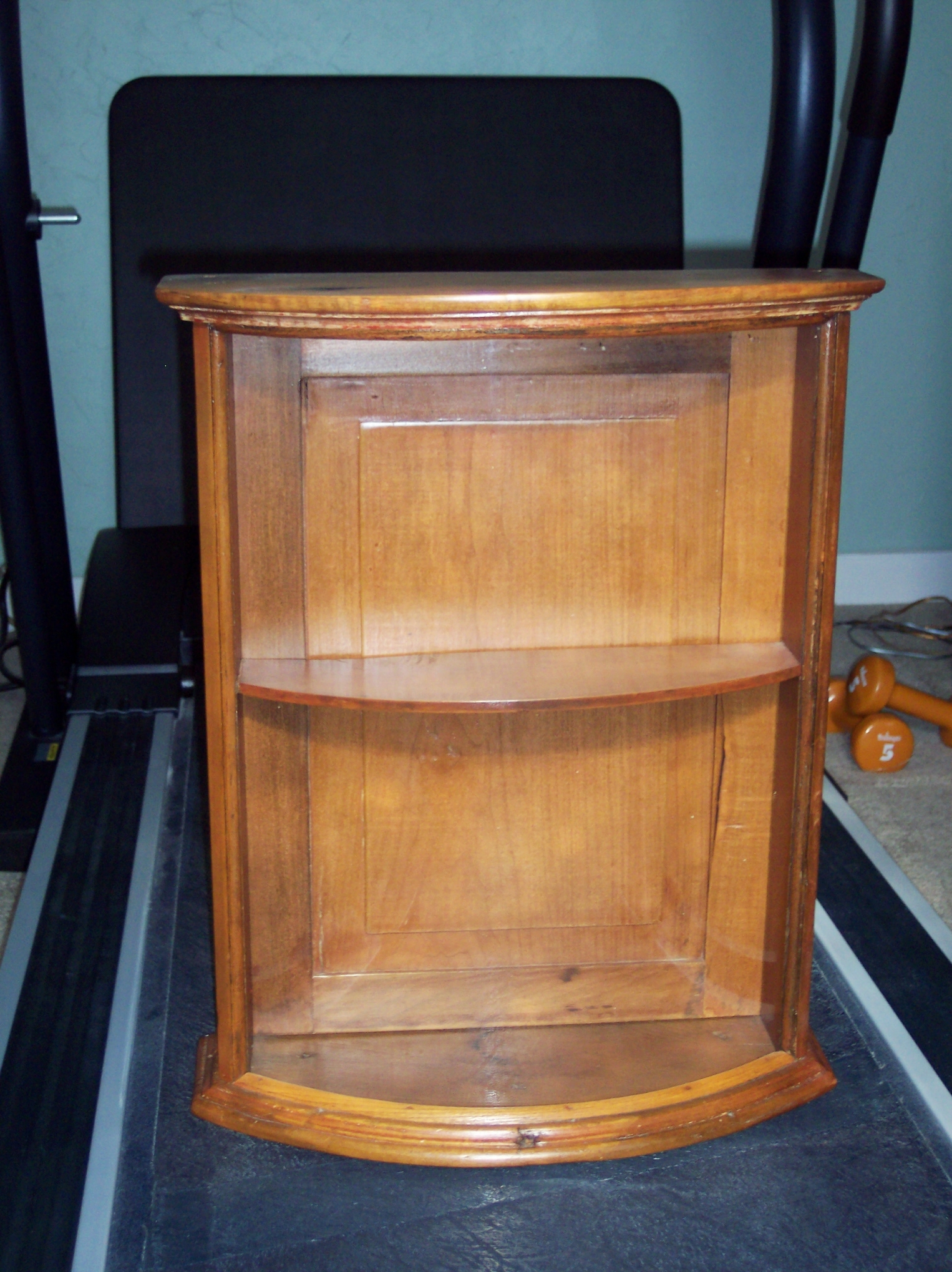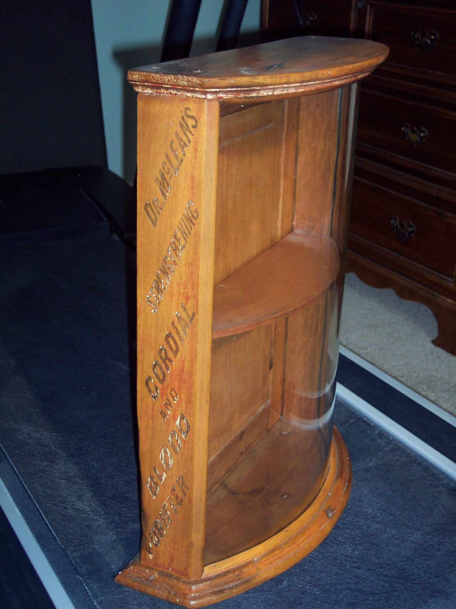 This display cabinet was probably used in store as a counter-top case for medicine. It can hold 4 to 8 bottles and has an opening on the back . The front has a rounded glass.