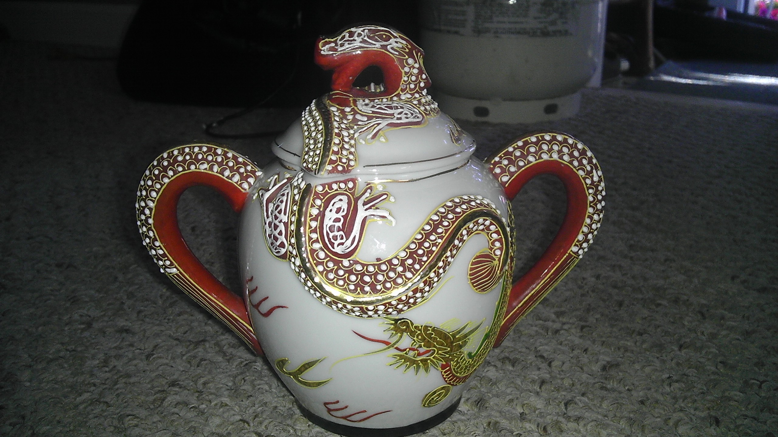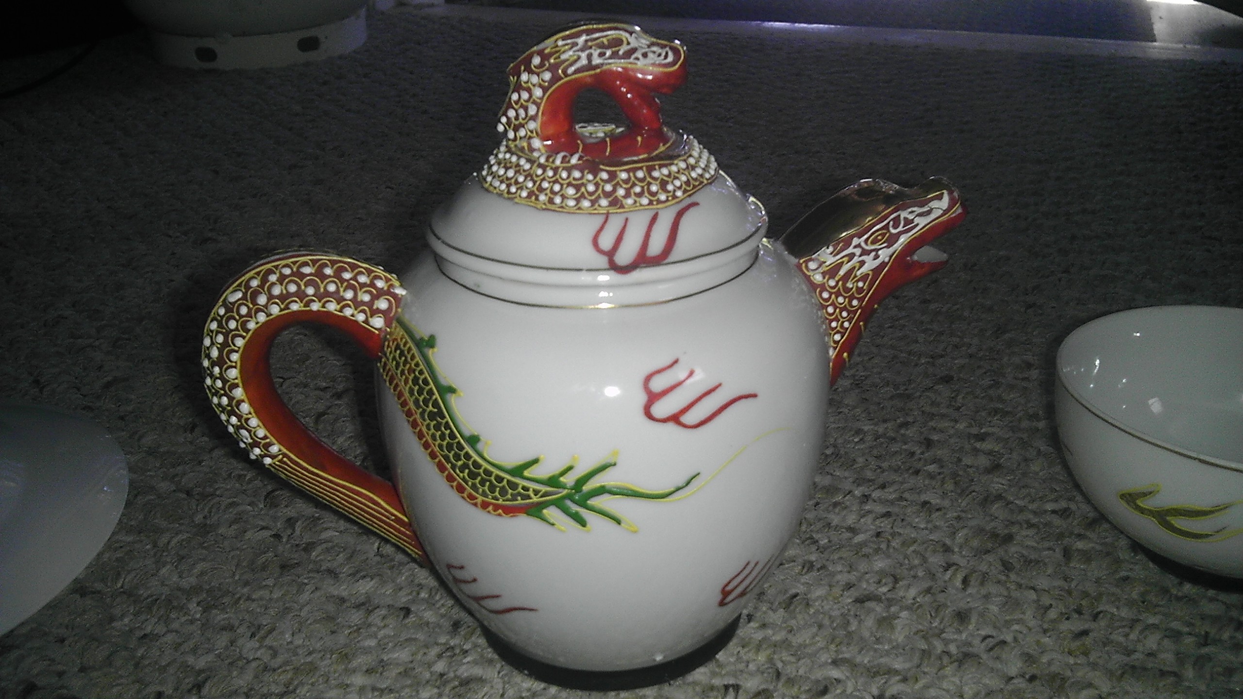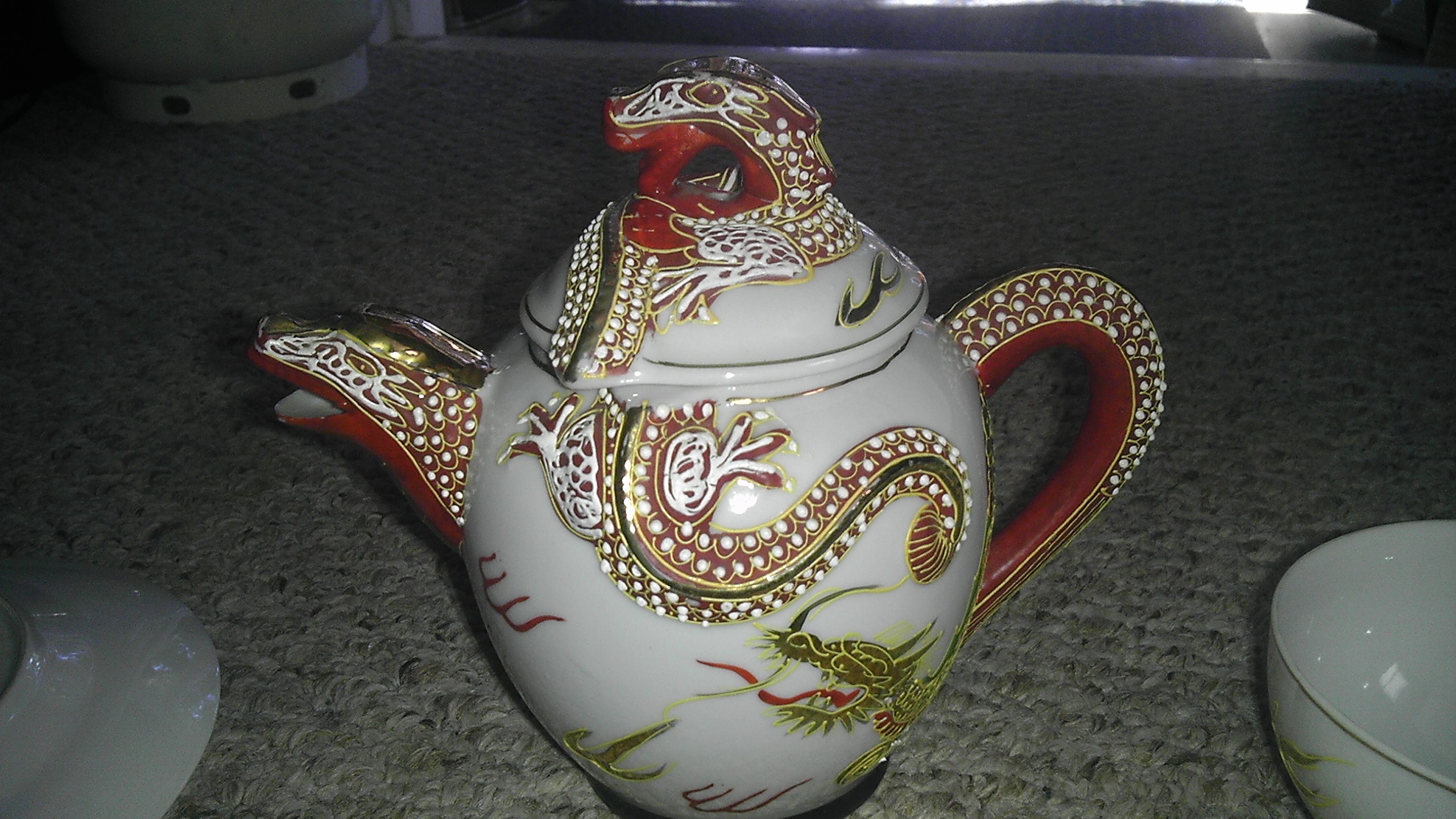 I have a 15 piece tea set that is stamped made I Japan. Through the tea cups you can see geisha hits. It looks all hand painted with red dragons with red and green. The tea pot and sugar container have raised white glass balls and the tops are the dragons head. The tea cups have the same raised white balls on their handle.