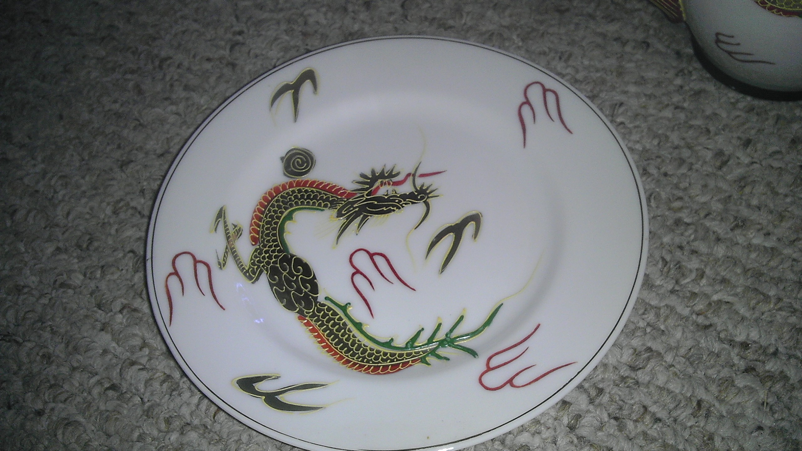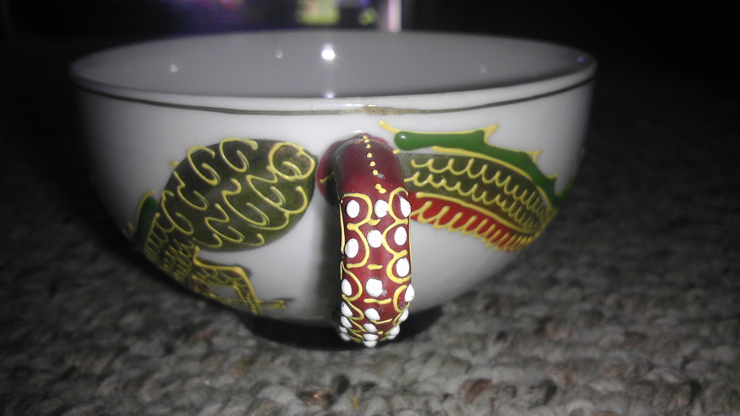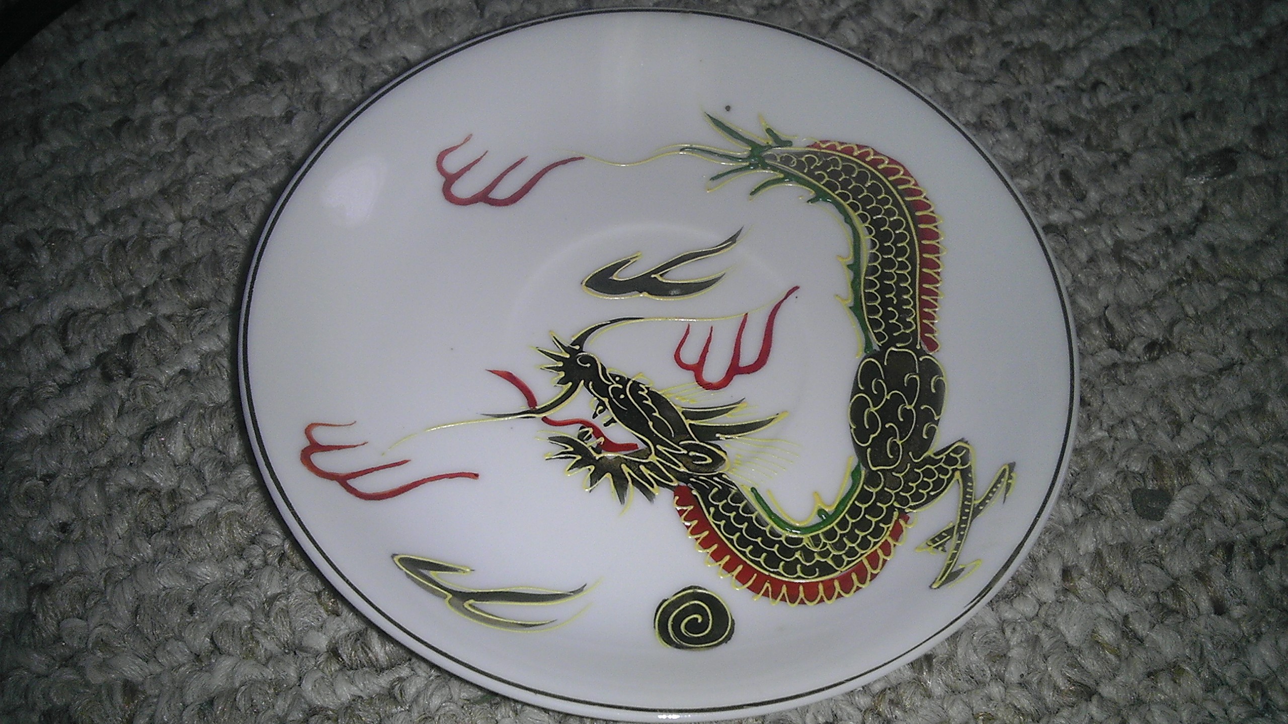 I have a 15 piece tea set that is stamped made I Japan. Through the tea cups you can see geisha hits. It looks all hand painted with red dragons with red and green. The tea pot and sugar container have raised white glass balls and the tops are the dragons head. The tea cups have the same raised white balls on their handle.