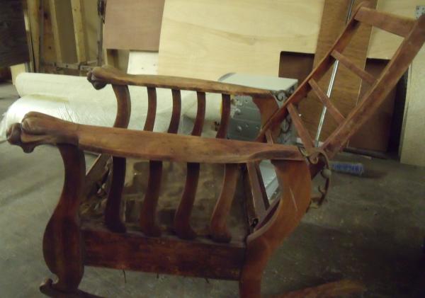 Rescued from a barn, this is an unusual morris style rocker. Not sure what kind of wood. Spring unit still in place but the upholstery is long gone from mice, critters and age. One bracket is broke but can be easily fixed. Chair needs some restoration but is so unique, it will be worth it. Side slats are curved. Would love to know more about it and what it may be worth. I have more pictures of it.