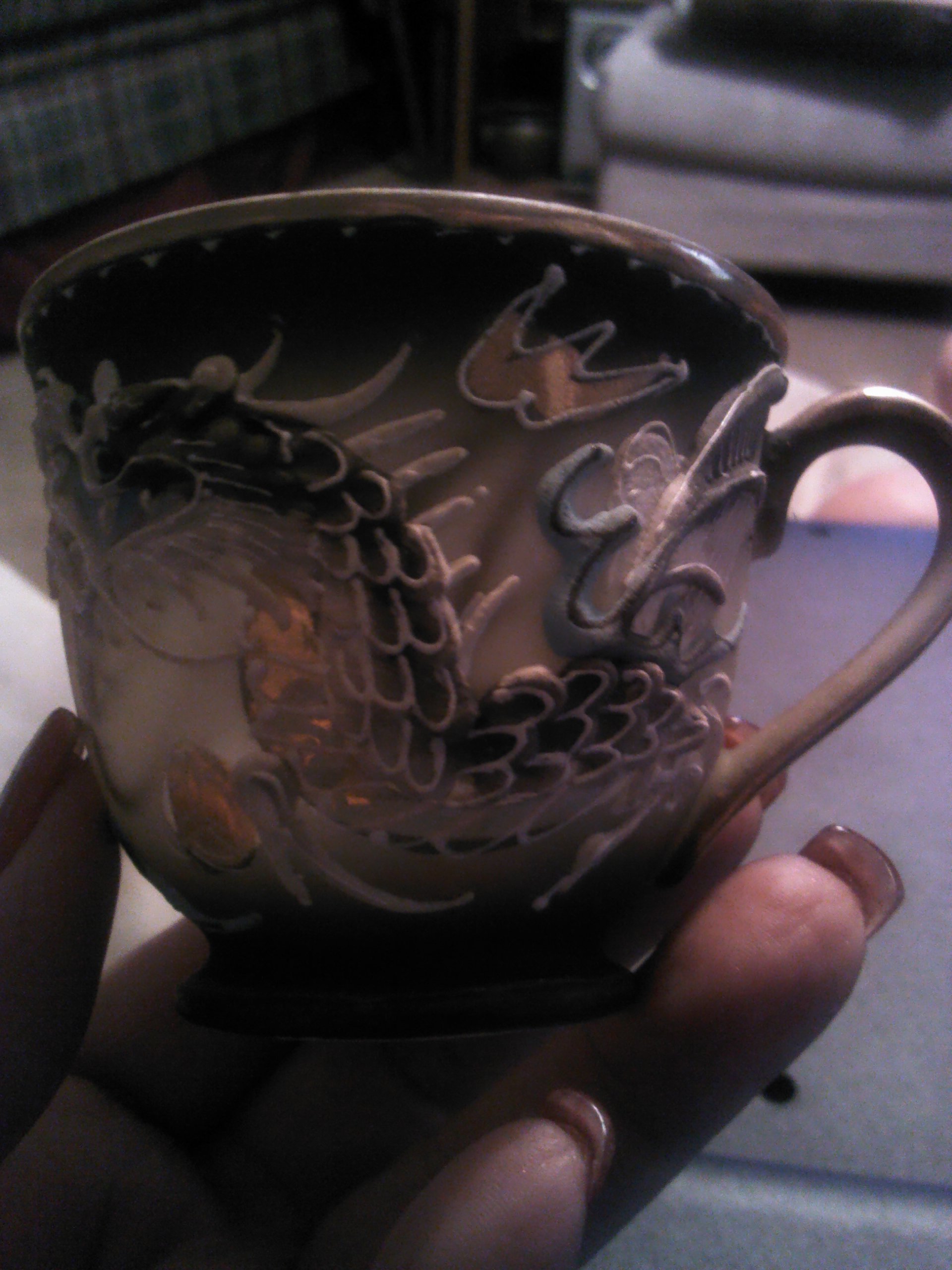 Would like value of tea cup with raised dragon on outside. Gold handle and rim. Image of lady on bottom. For sale. Would like help on price.