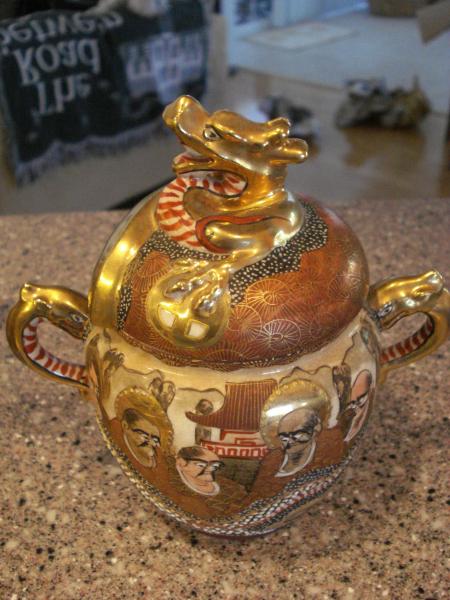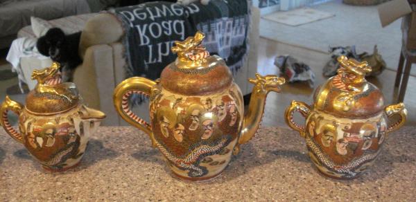 tea set includes, teapot, creamer, sugar cups and saucers, one cup was cracked and mended. all other pieces in good condition.