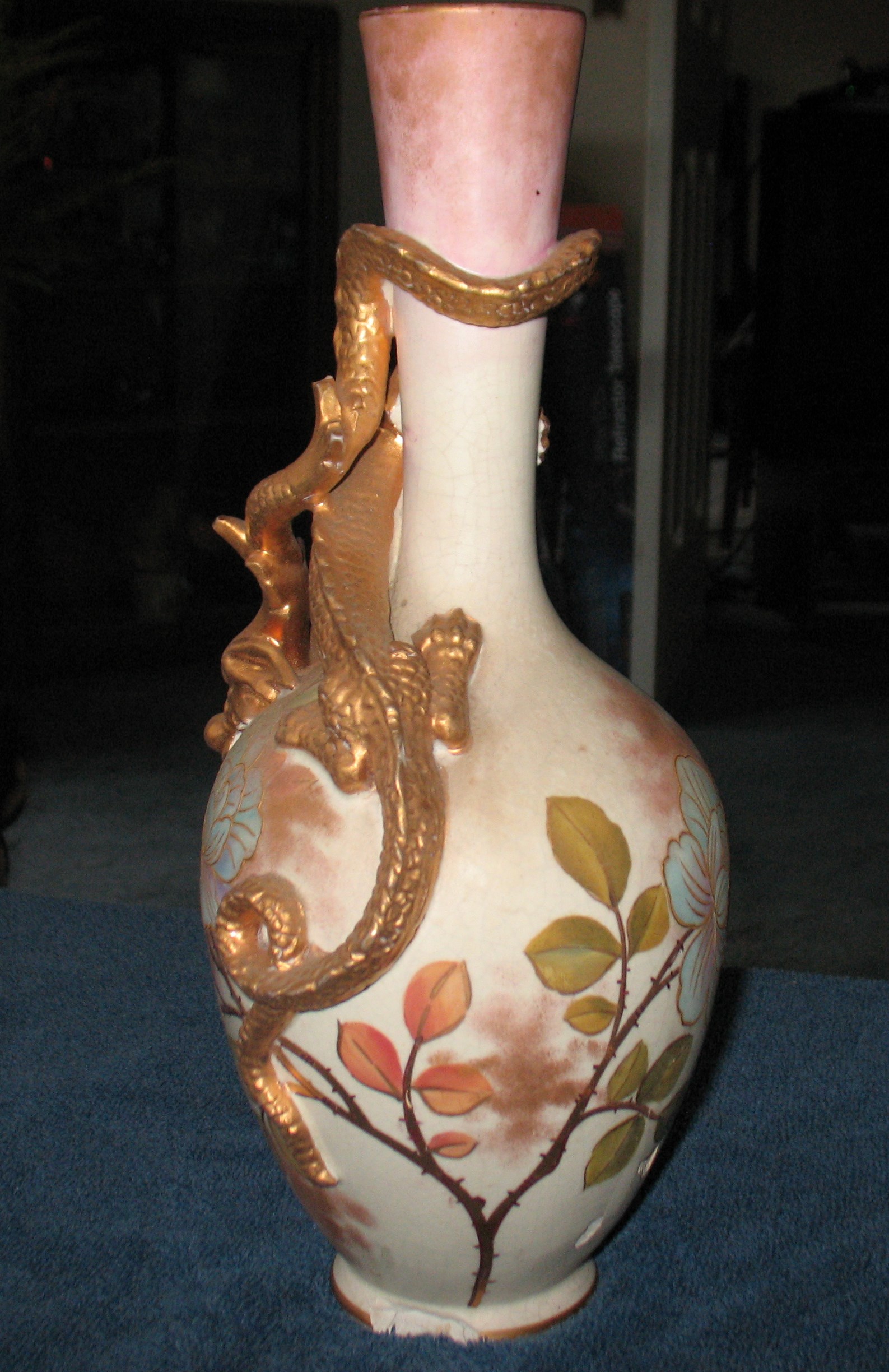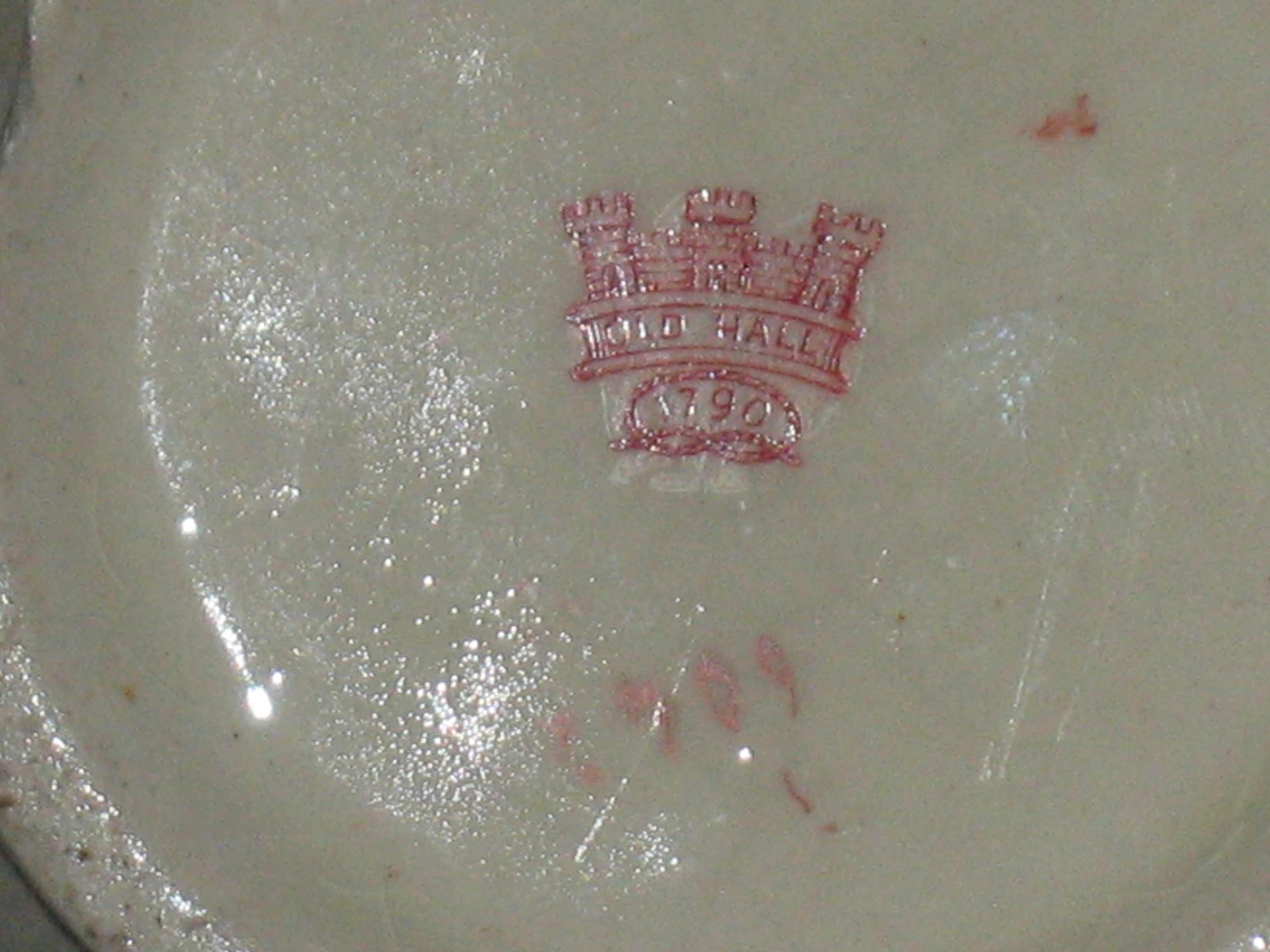 This appears to be in the style of Christopher Dresser. I do not know for sure if it is his work. It does have a red backstamp of a castle and Old Hall with a Staffordshire knot and 1790. It also has a 1 or i over 6042. It is a vase which has a few chips. It is very pretty. There is a gold applied dragon on the vase which has a painted floral design outlined in gold.