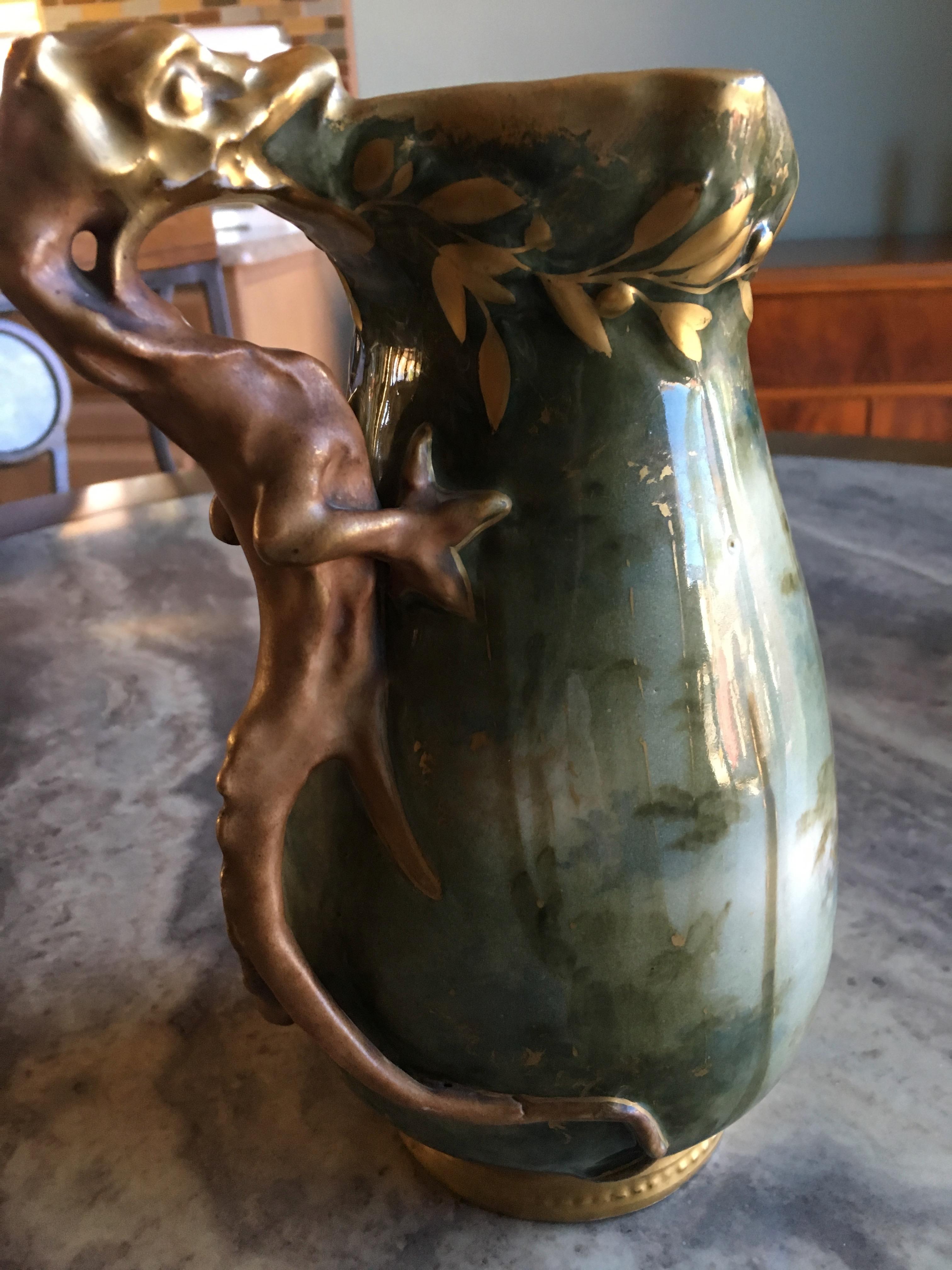 Green vase with dragon as handle. On bottom: Austria, AMPH5A, 2070 44, TURN-TEPLITZ-BOHEMIA, .RStK. Made in AL