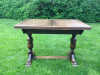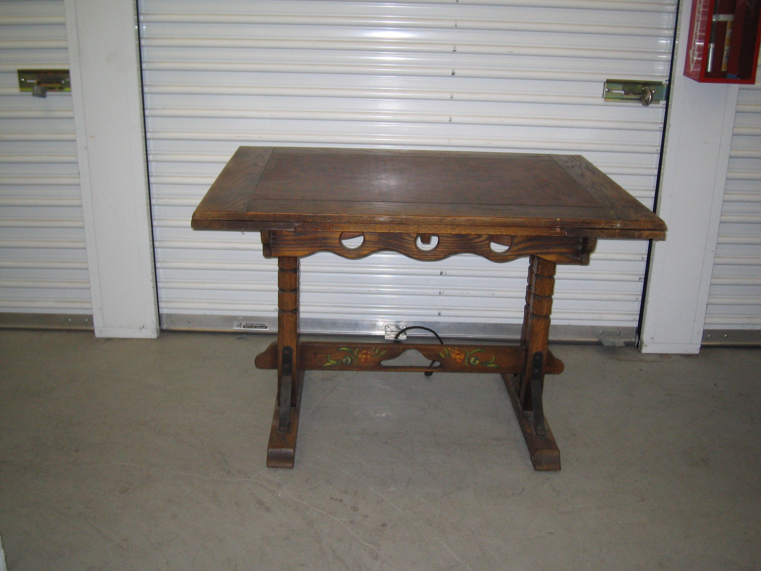 It's a small wooden dining table with 4 matching chairs. The table seems to be Spanish Colonial style or Spanish Revival (from my limited knowledge of the styles). It has a trestle base and two side leafs that slide out and up and to mate with the top.