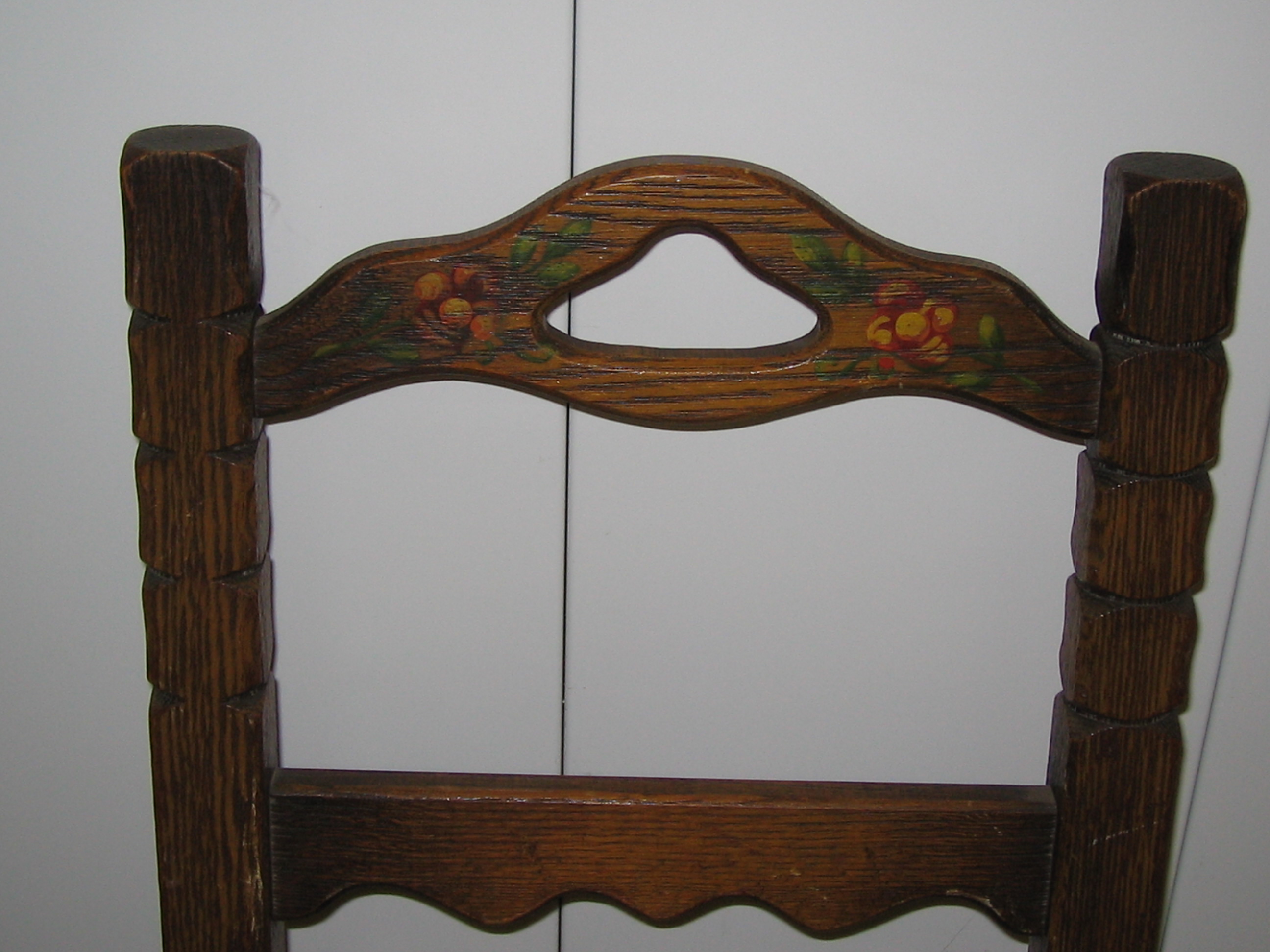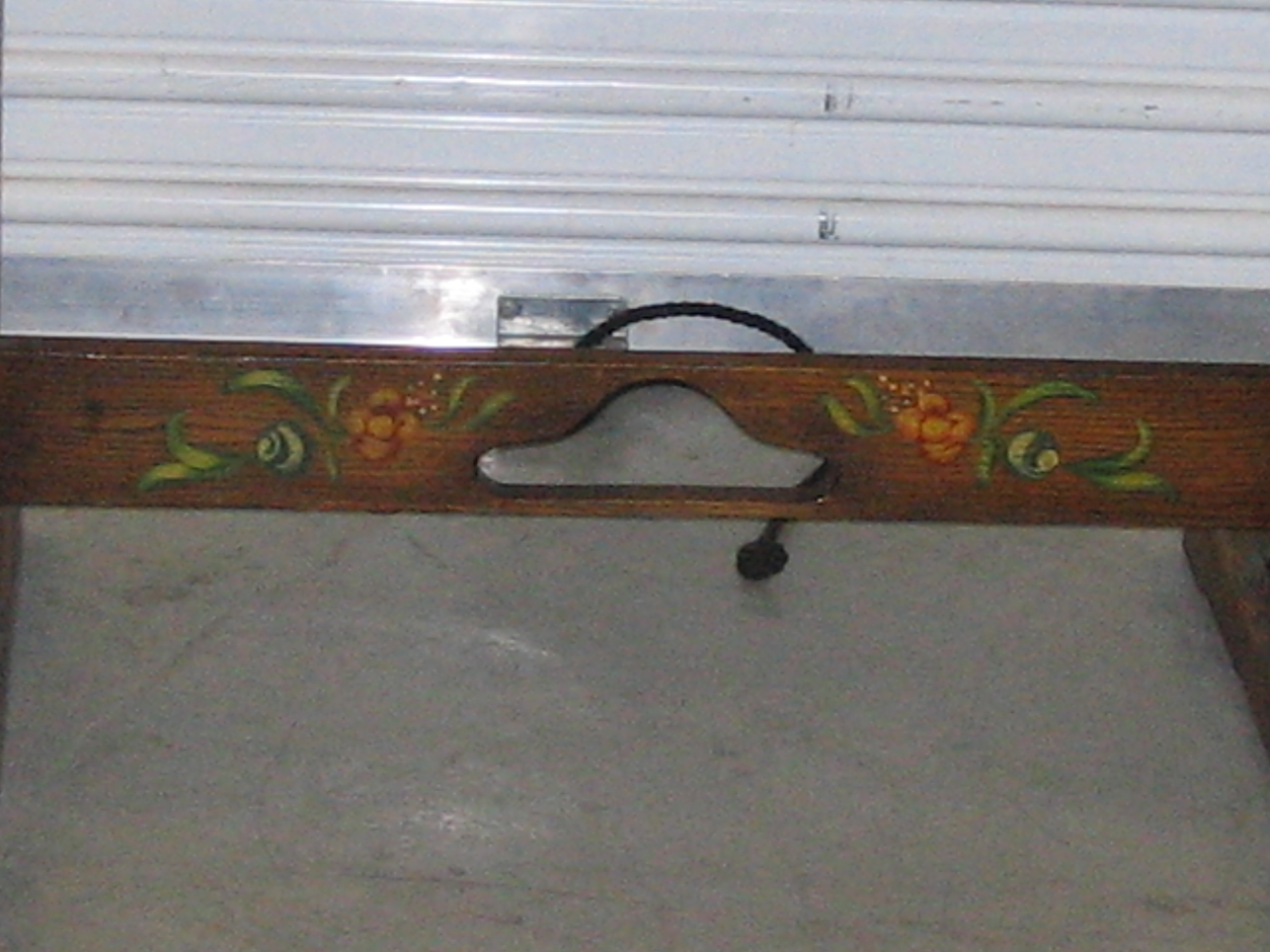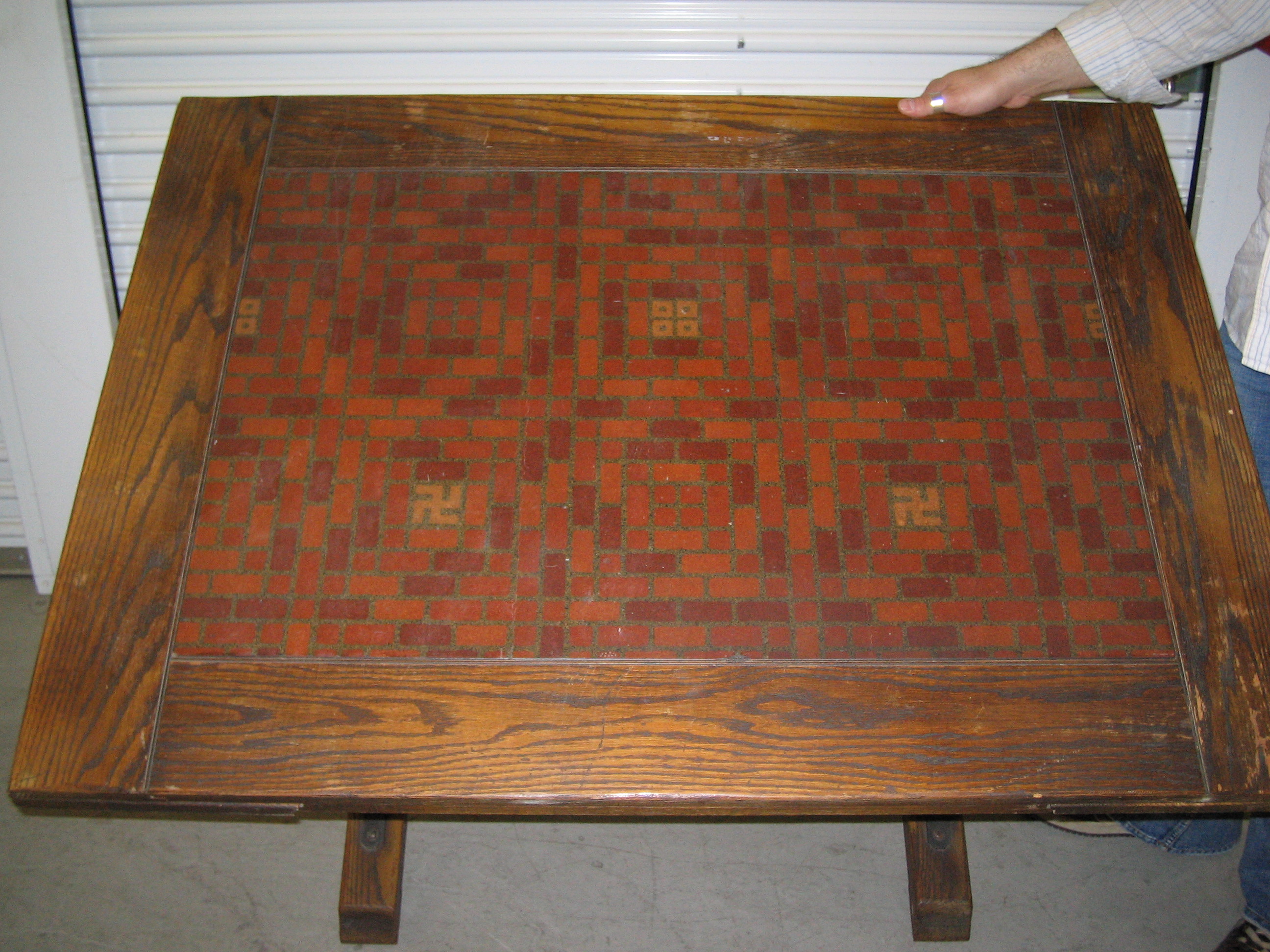 It has a painted fruit and leaf design along the trestle and an inlay on top. The inlay seems to be made of a softer wood and it has an orange and red brick design with two yellow square designs and two yellow swastikas.
