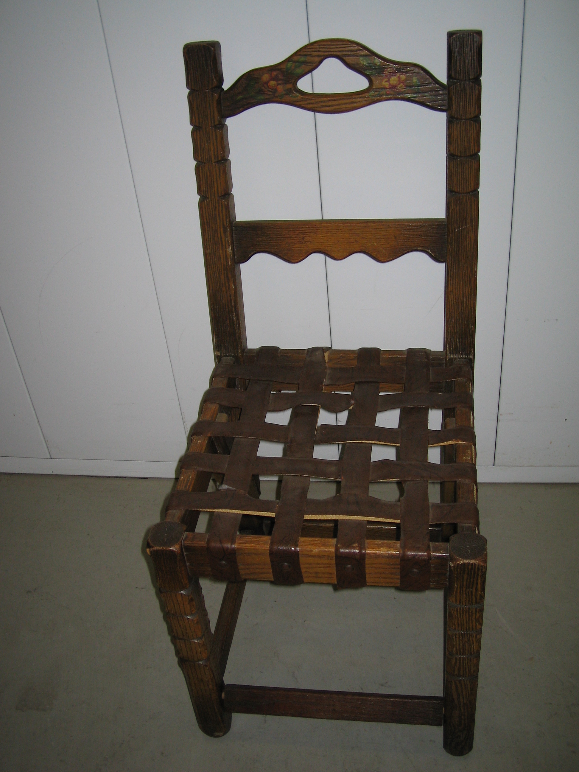 The chairs are wood with a criss-cross leather strap seat. The straps are held in place with metal bolts and supported by thick bands of elastic. The same design that is on the table's trestle is also painted on the top rail of the chairs.