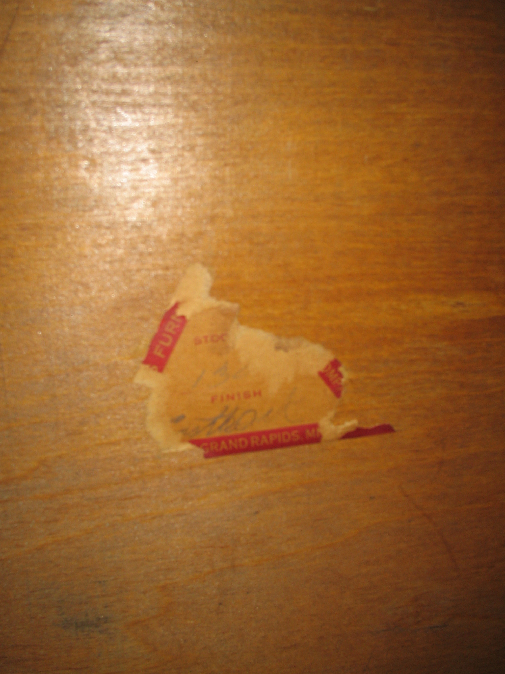 There is a small piece of a sticker on the underside of the table. The sticker looks to have been triangular. "Grand Rapids, MI" is easily discernible. There is also part of a stock number and a signature.