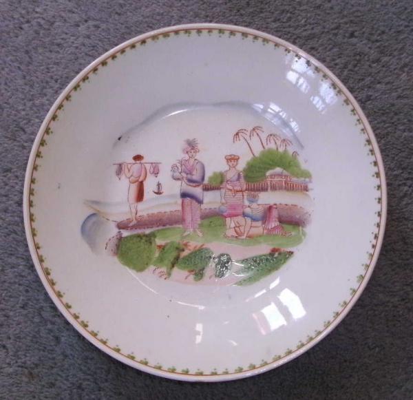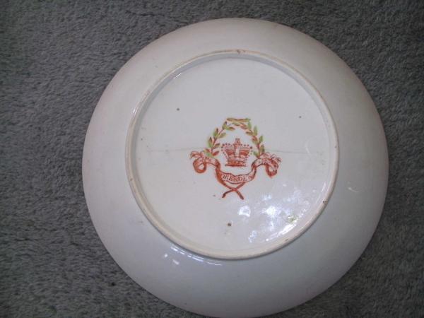 Ceramic bowl, hand painted with figures from the far east ? Bowl approx 8 inches in diameter. Backstamp " DRESDEN " surmounted by a crown and an arc or leaves. Condition fair - good a small hairline crack goes across middle and there is some light crazing to glaze. The paintwork is bright and clear with no rubbing